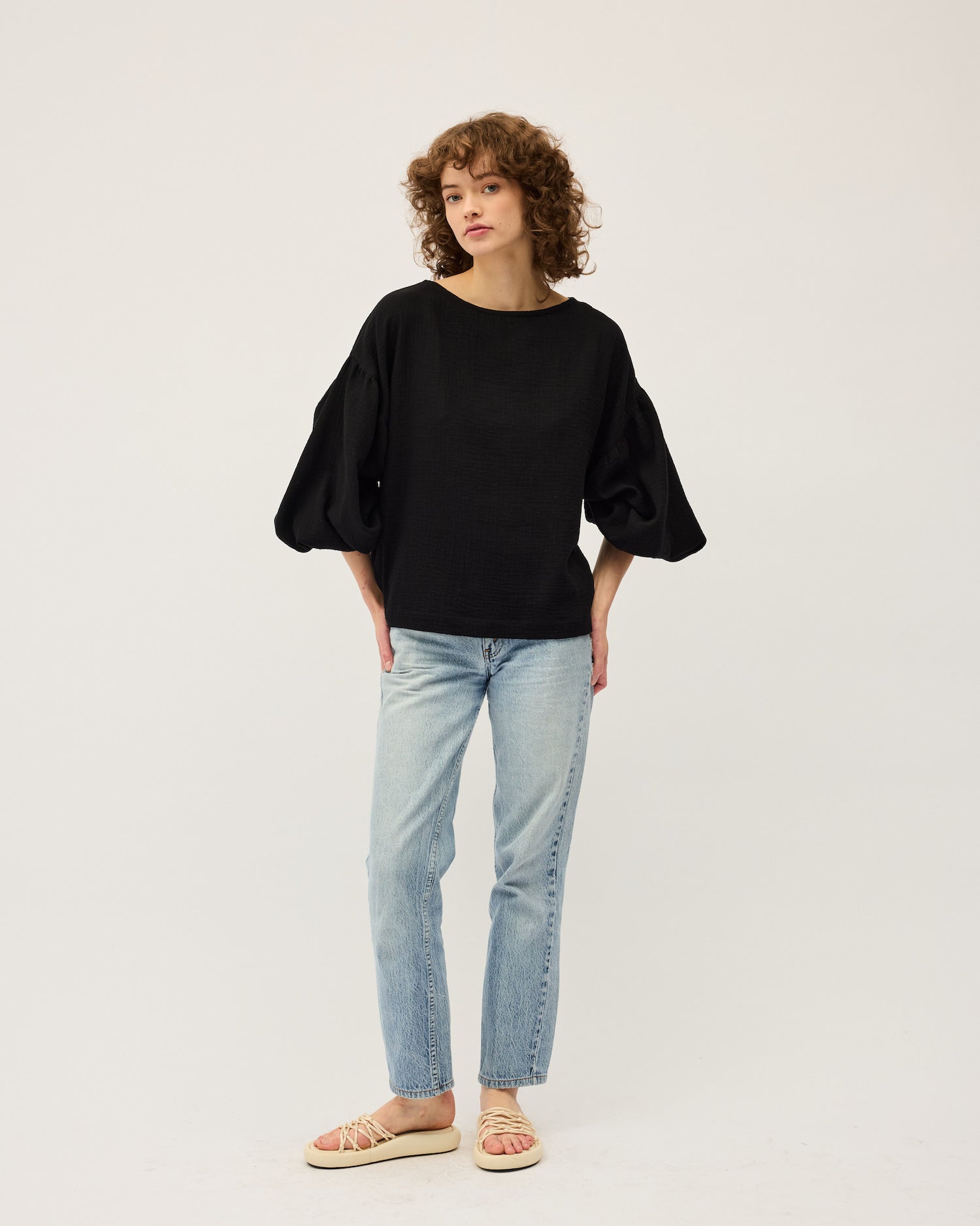 One of our DH classic shapes, the Bella Blouse features oversized sleeves gathered into wrists with soft elastic for comfort and versatility. The sleeves are full length and can be pushed up as pictured, rolled or worn long. This style is designed to be oversized and is loose through the body. Comfortable and easy to wear year round.