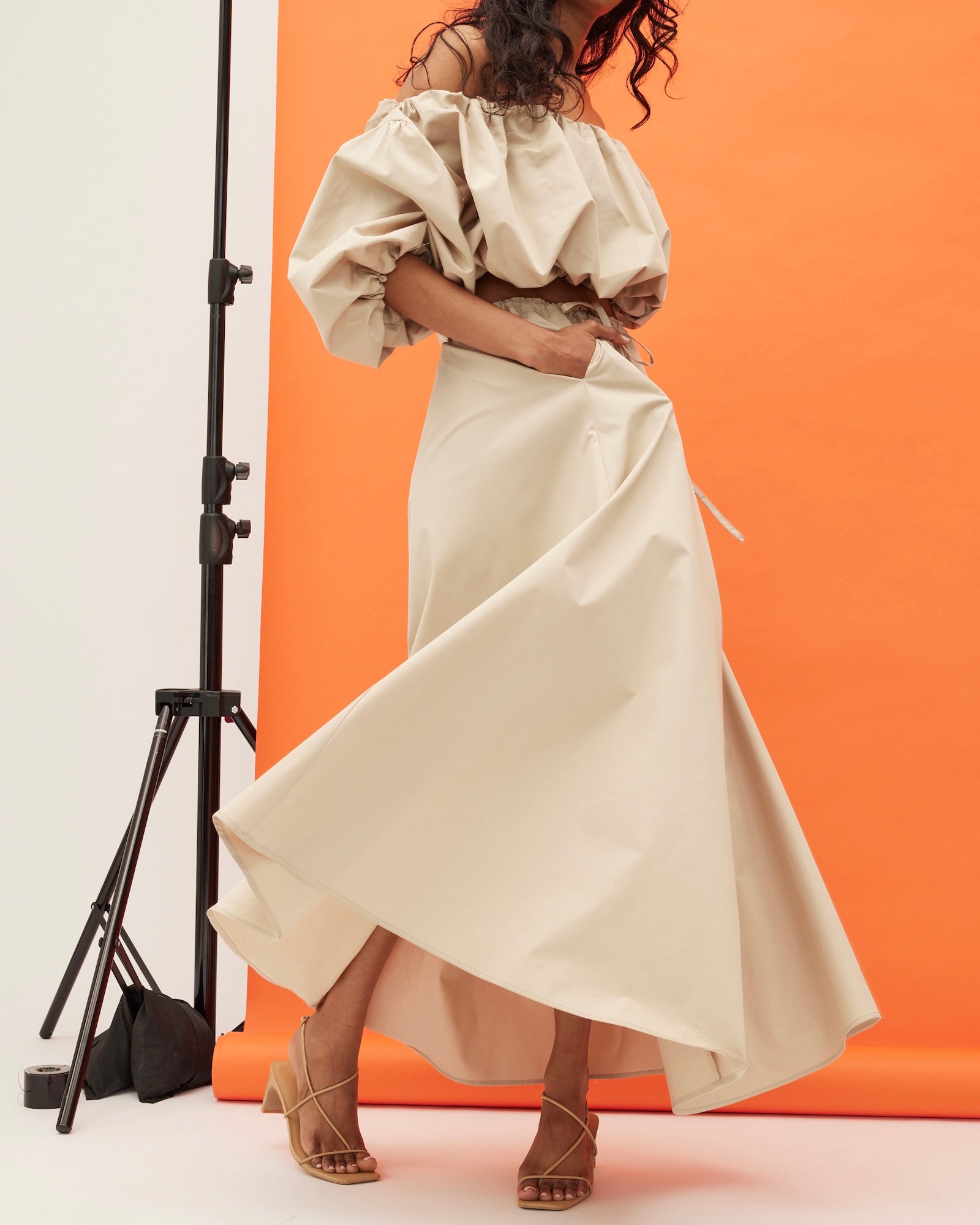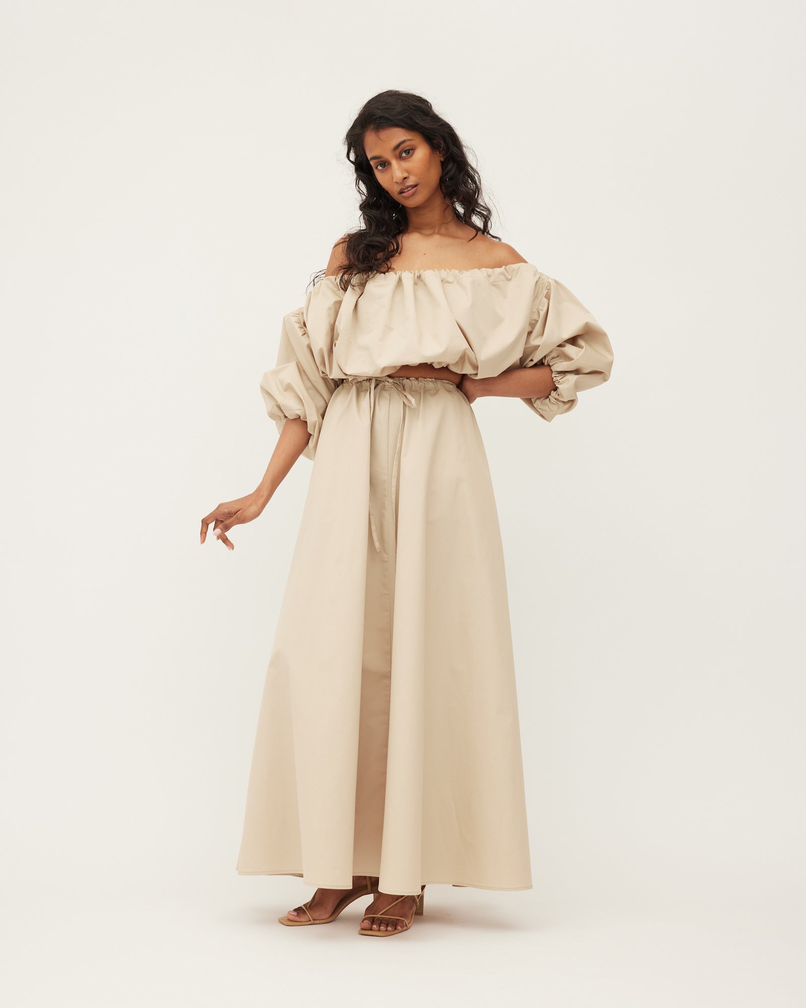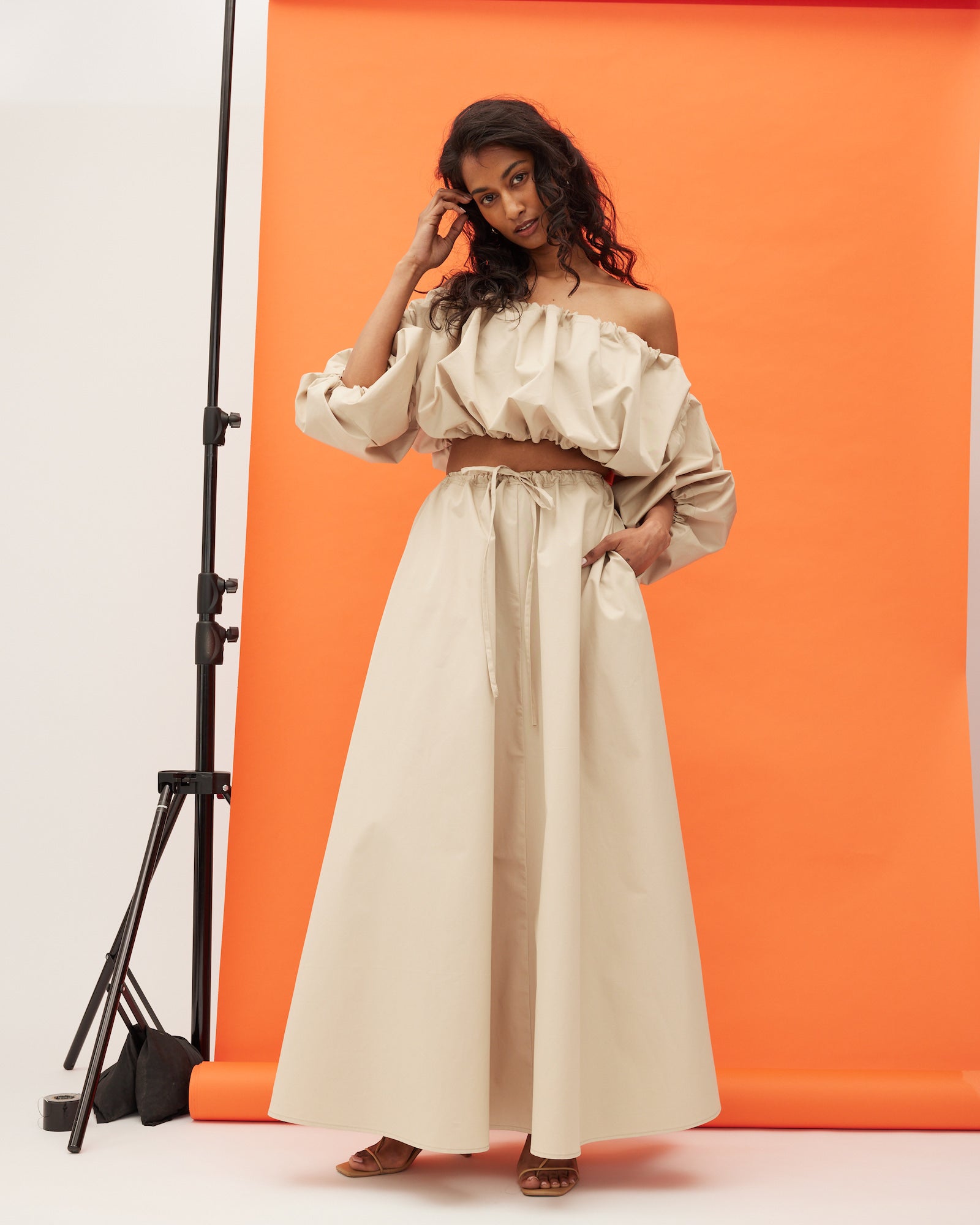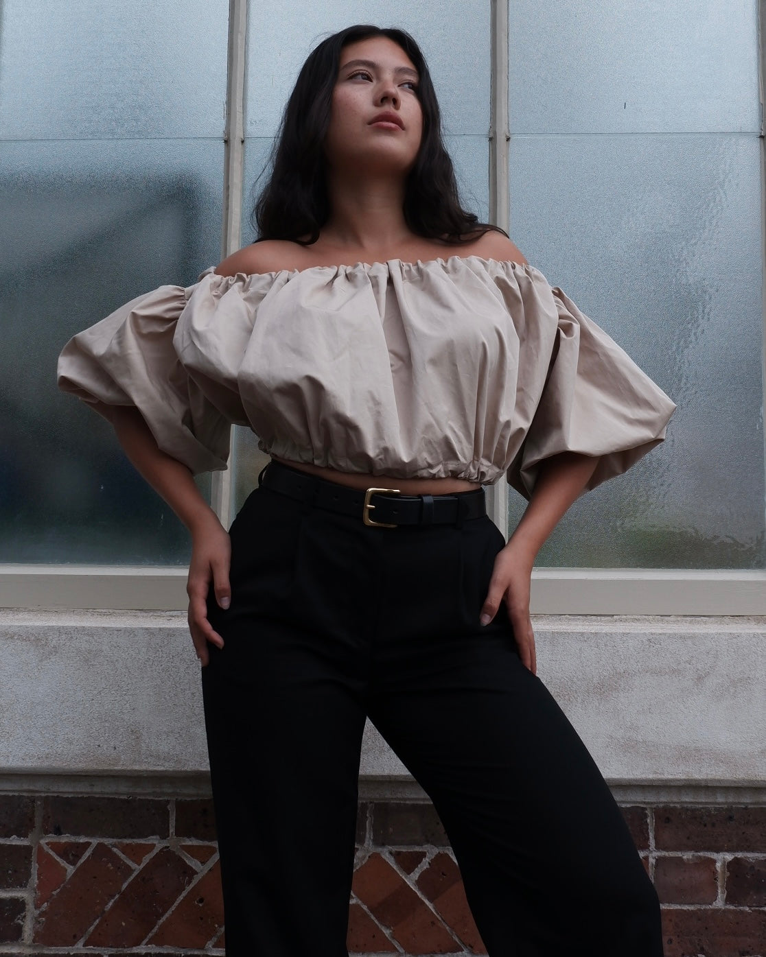 Elliana Crop sits off shoulders and features oversized sleeves, features an extra full gather which allows the blouse to fit a variety of sizes. Elastic is soft to wear and is brought in at the waist.