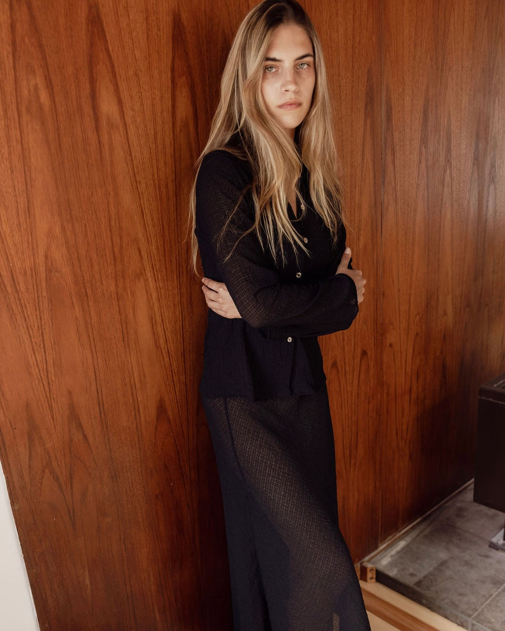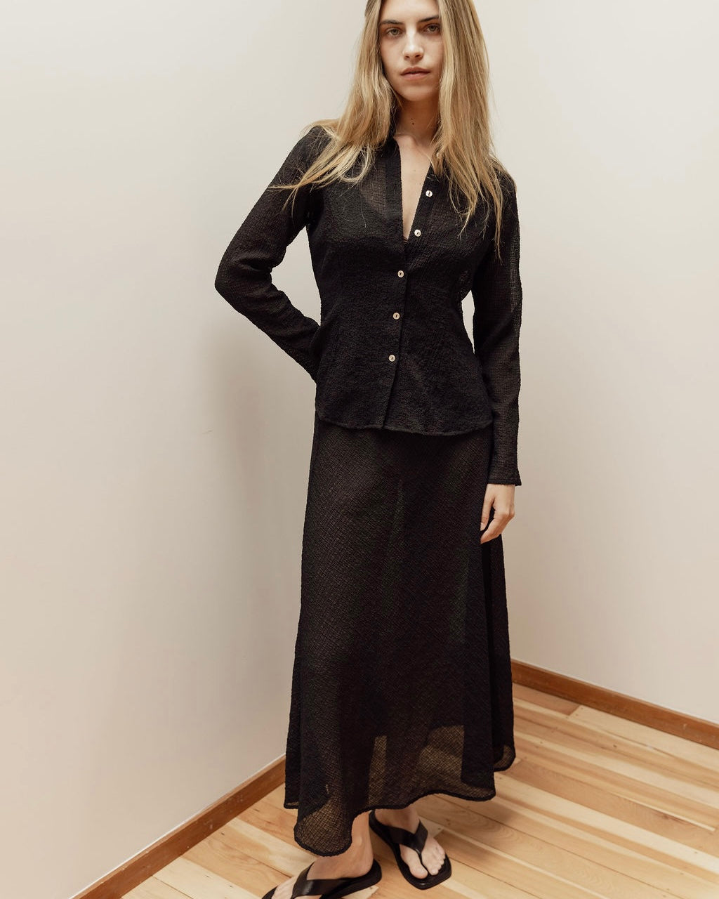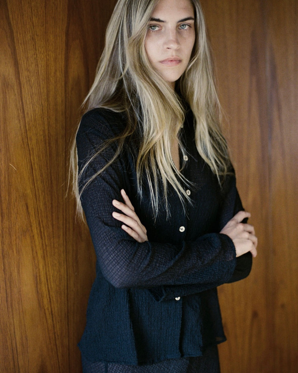 Crafted from our Japanese sheer crinkle fabric, this lightweight material has a crinkle texture that catches the light beautifully. This sheer piece is delicate but durable, finished with shell buttons, each detail is thoughtfully considered for a polished, elevated finish.