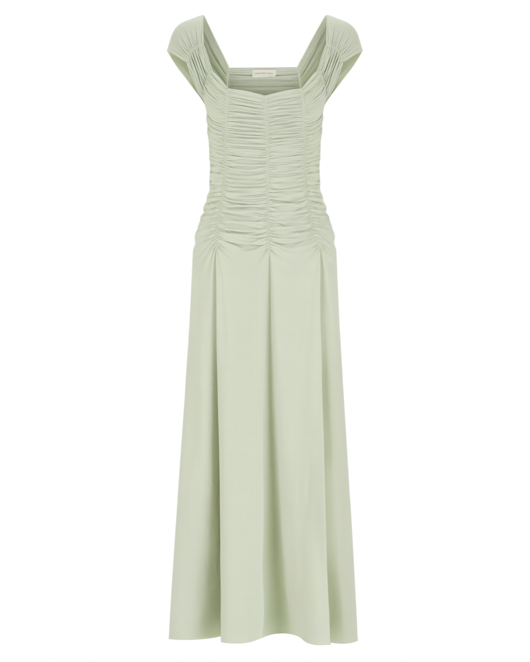 Our Jolene Dress features elasticated ruching through the bust and body. Ruching creates a scalloped neckline highlighting the décolletage. Fabric is a soft jersey with stretch making it one of our most comfortable statement dresses. Designed to fit close to the body but not too tight or the ruching won’t have as much space to gather. Sits just above the ankle. A great statement dress but can also be paired back with a simple sandal for more relaxed occasions.