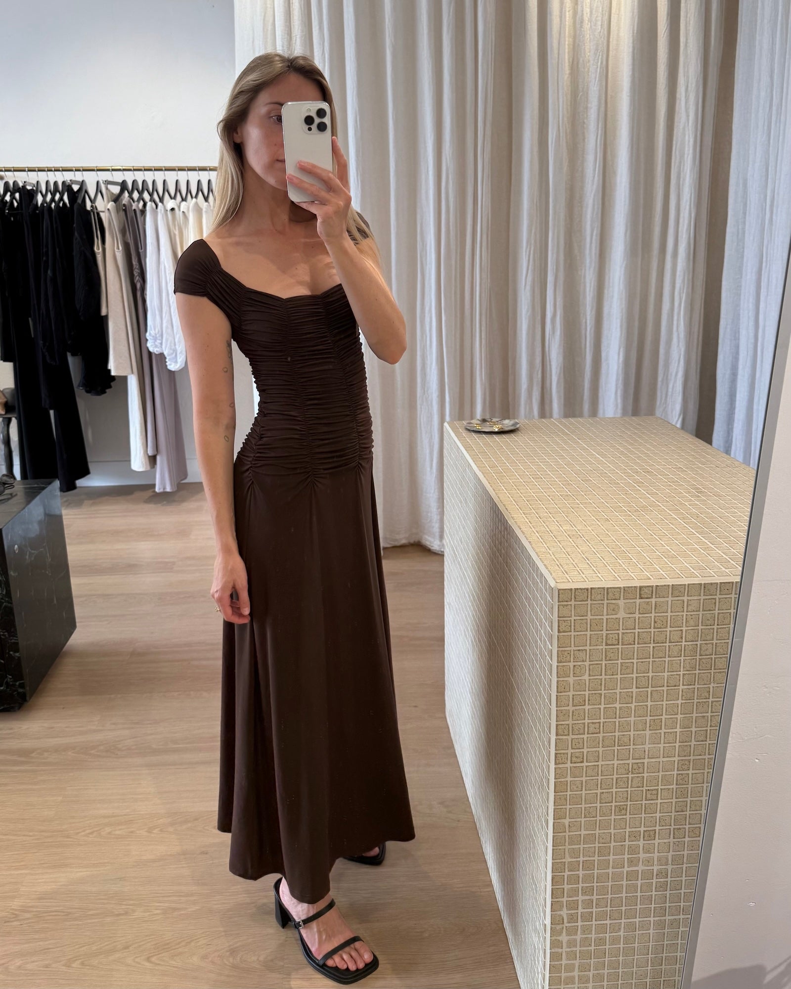 Our Jolene Dress features elasticated ruching through the bust and body. Ruching creates a scalloped neckline highlighting the décolletage. Fabric is a soft jersey with stretch making it one of our most comfortable statement dresses. Designed to fit close to the body but not too tight or the ruching won’t have as much space to gather. Sits just above the ankle. A great statement dress but can also be paired back with a simple sandal for more relaxed occasions.