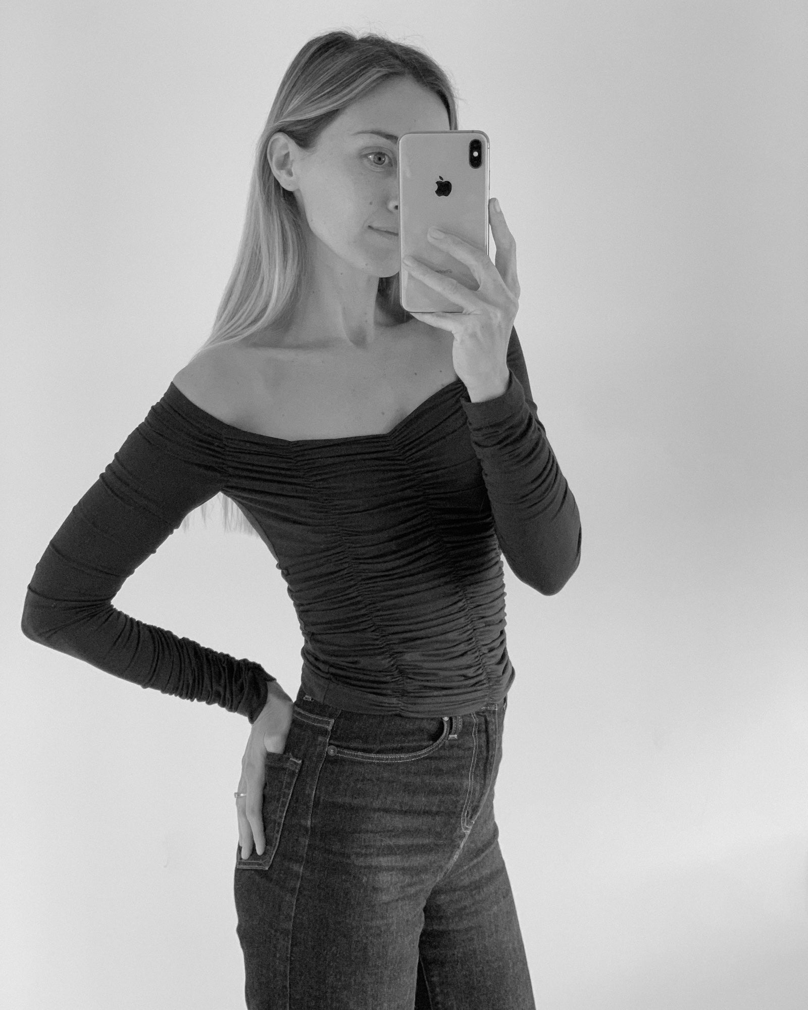 Jolene Longsleeve - the newest addition to our jersey collection. This style sits either on the shoulder with a wide scoop neck or pulled down off the shoulder to show off the décolletage. Featuring elasticated ruching all over to add detail and texture.