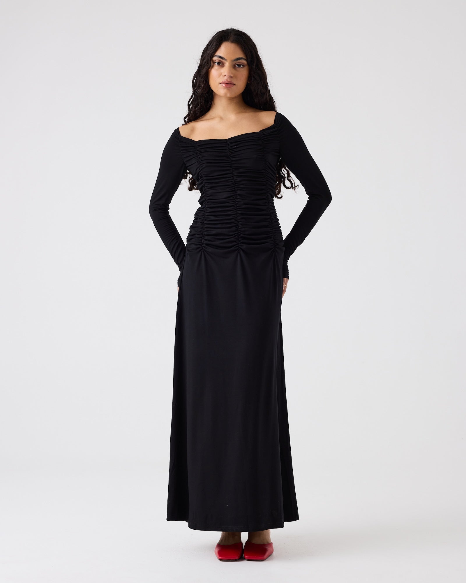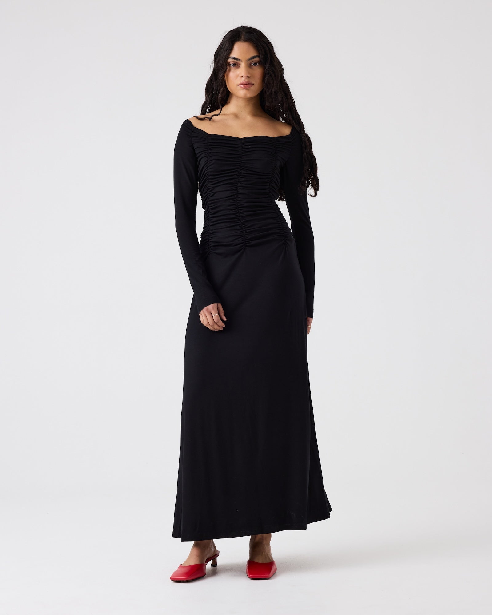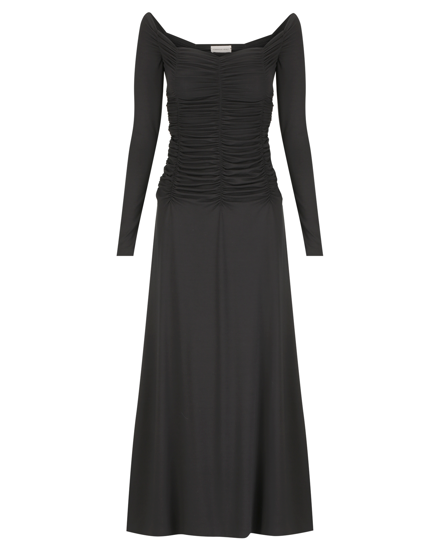 This dress features elasticated ruching through the bust, body and amrhole. Ruching creates a scalloped neckline highlighting the décolletage. Fabric is a soft modal jersey with stretch making it one of our most comfortable statement dresses.