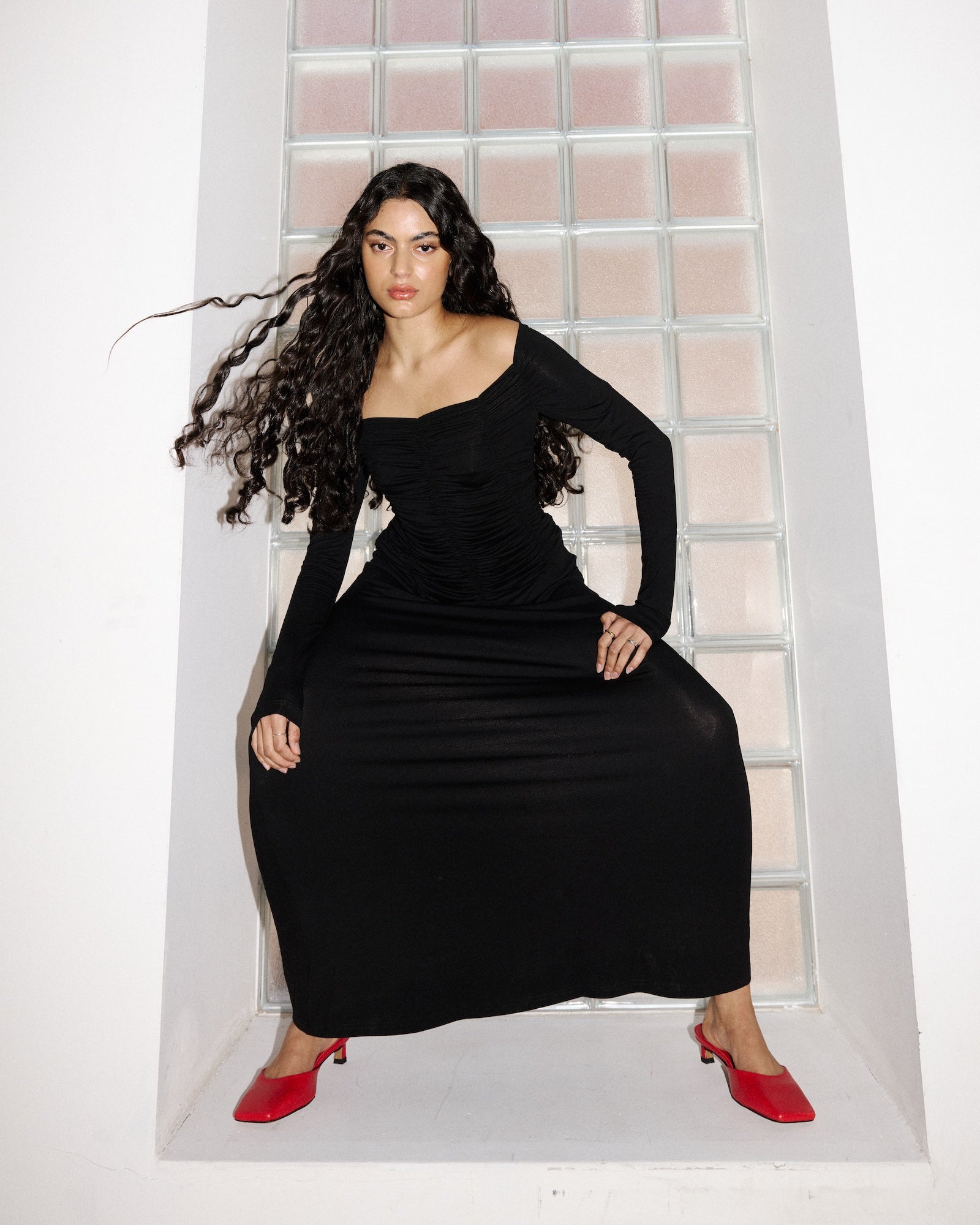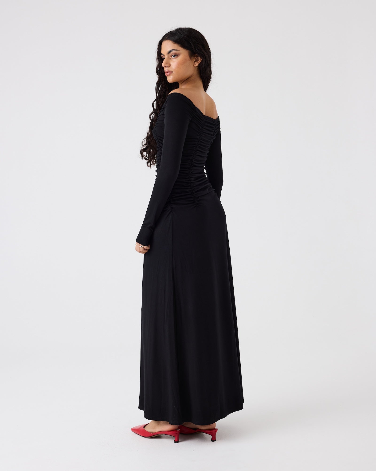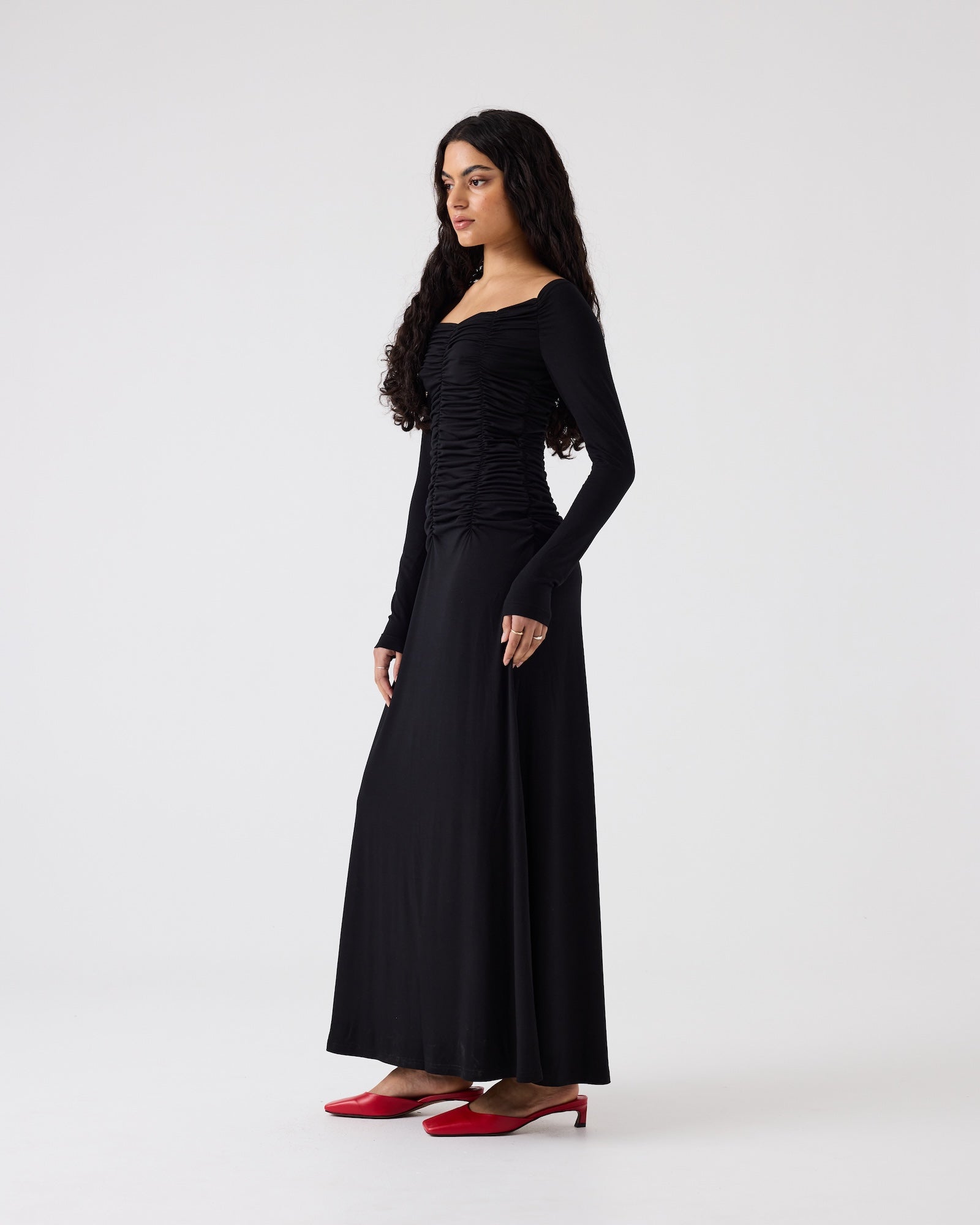 This dress features elasticated ruching through the bust, body and amrhole. Ruching creates a scalloped neckline highlighting the décolletage. Fabric is a soft modal jersey with stretch making it one of our most comfortable statement dresses.