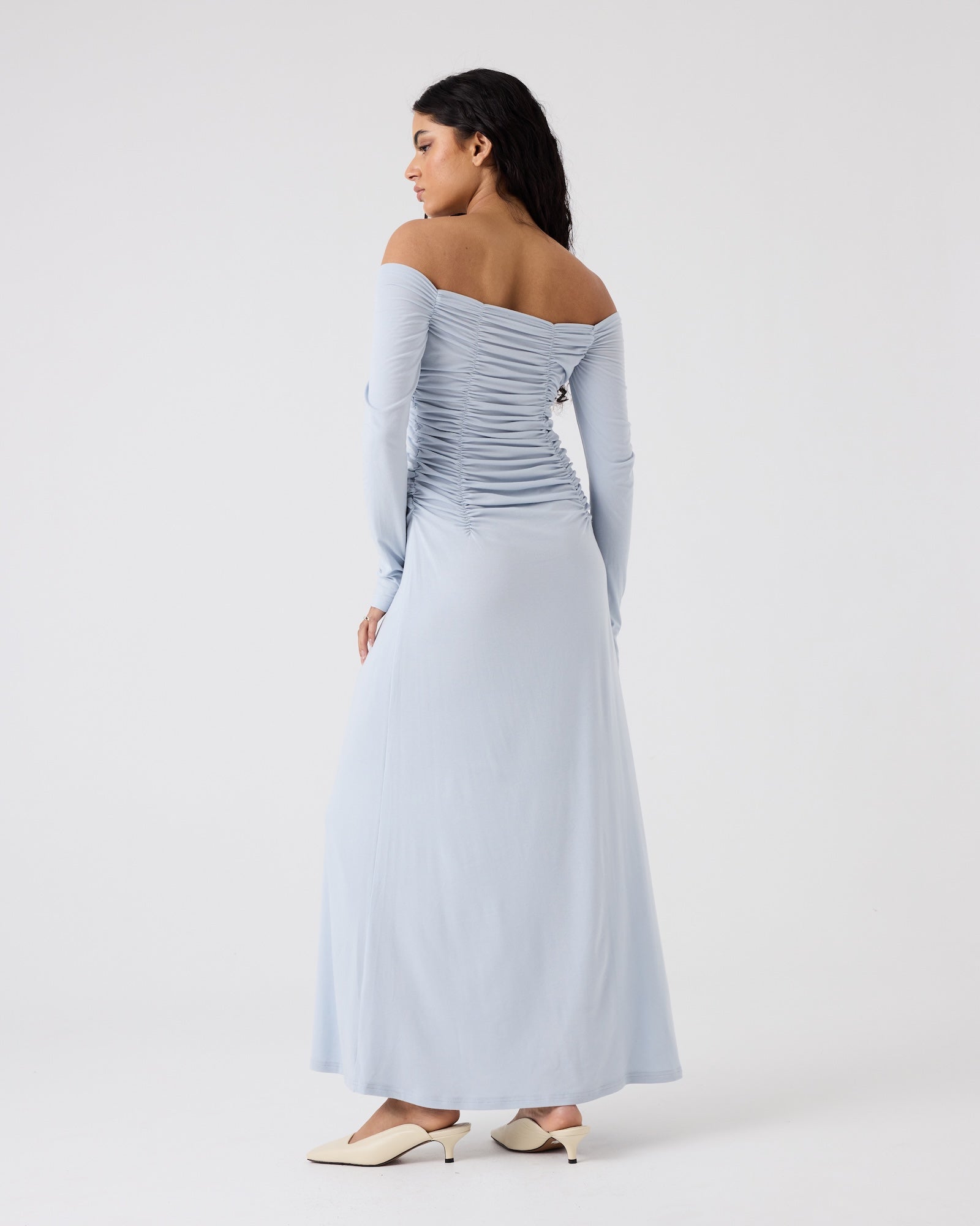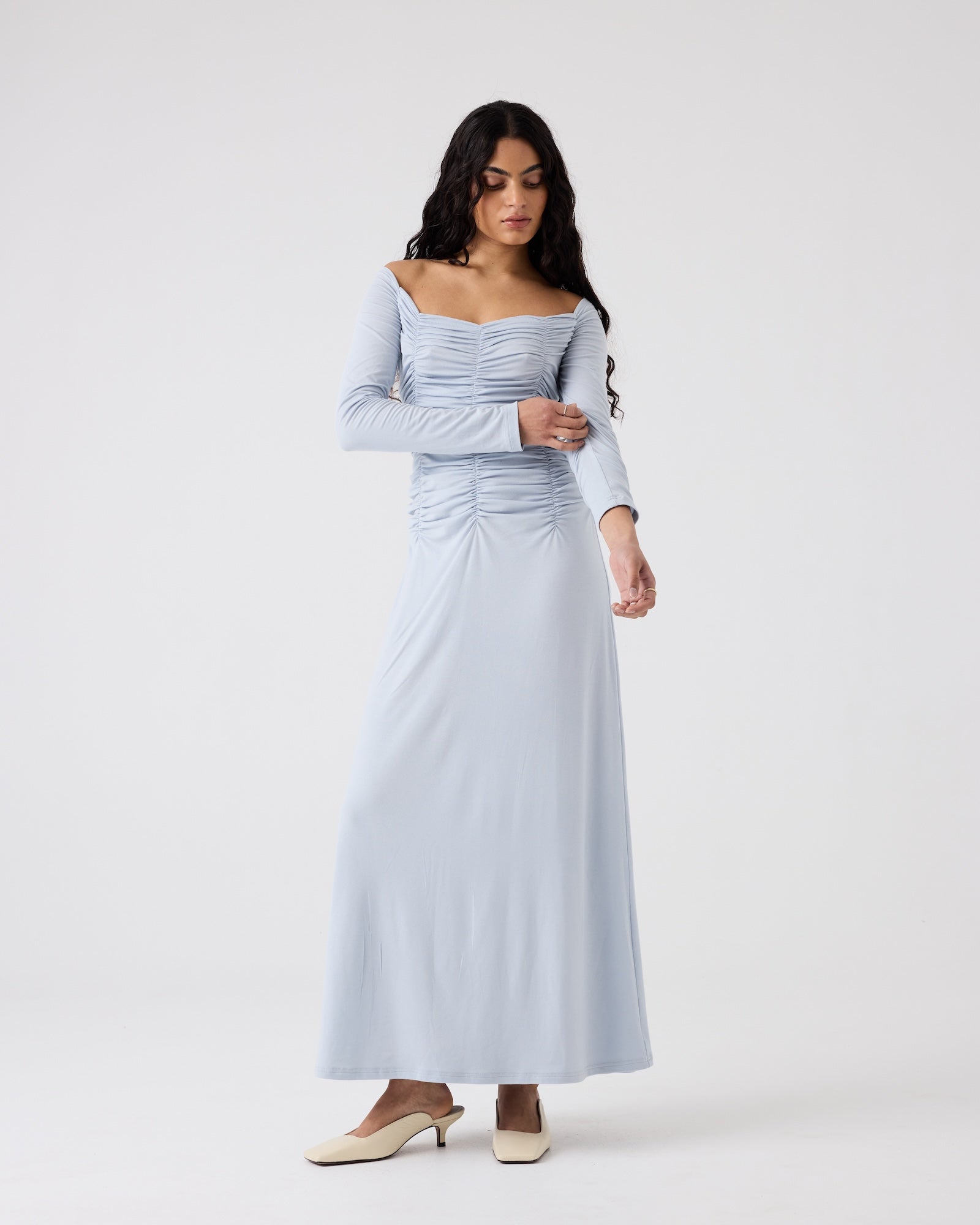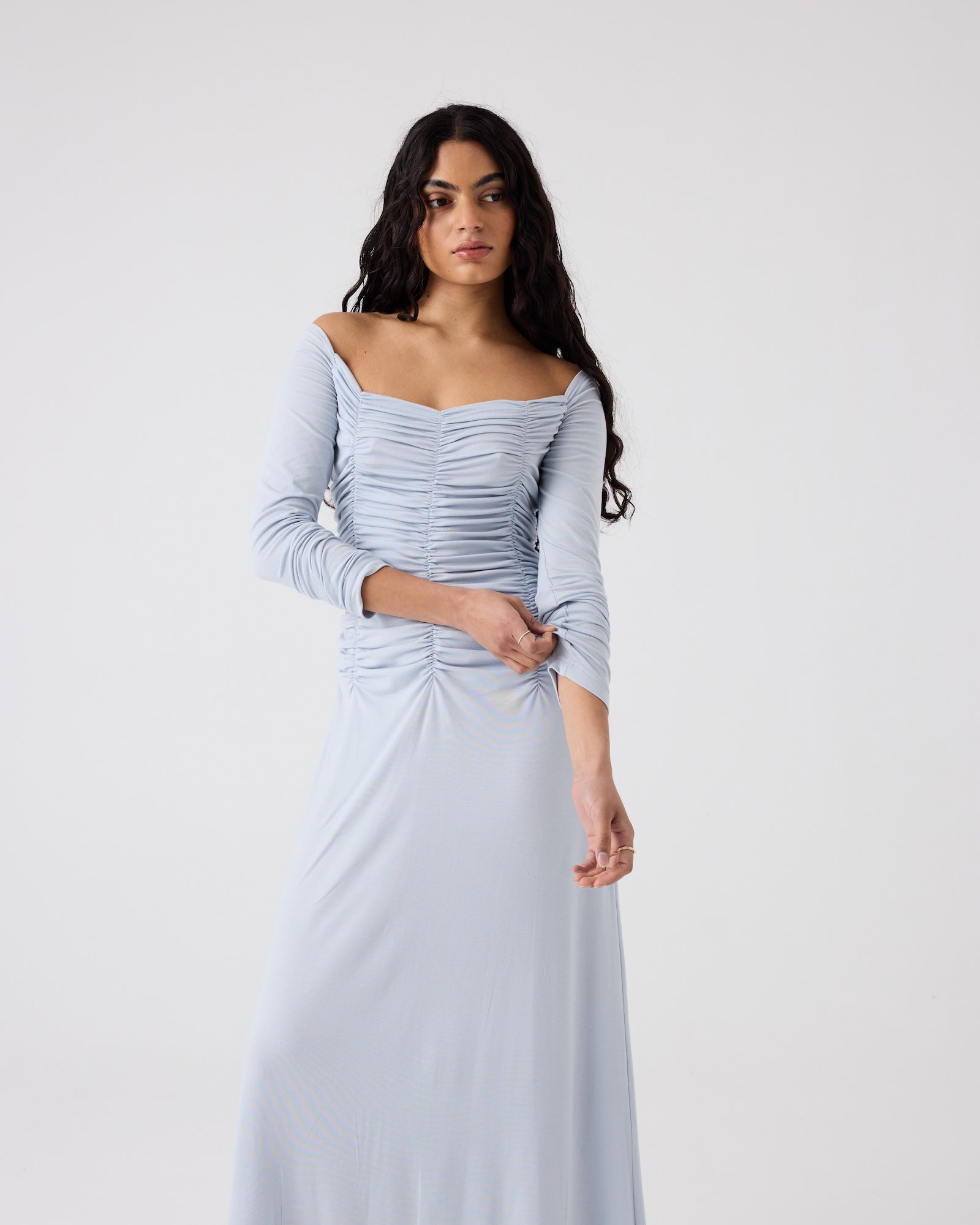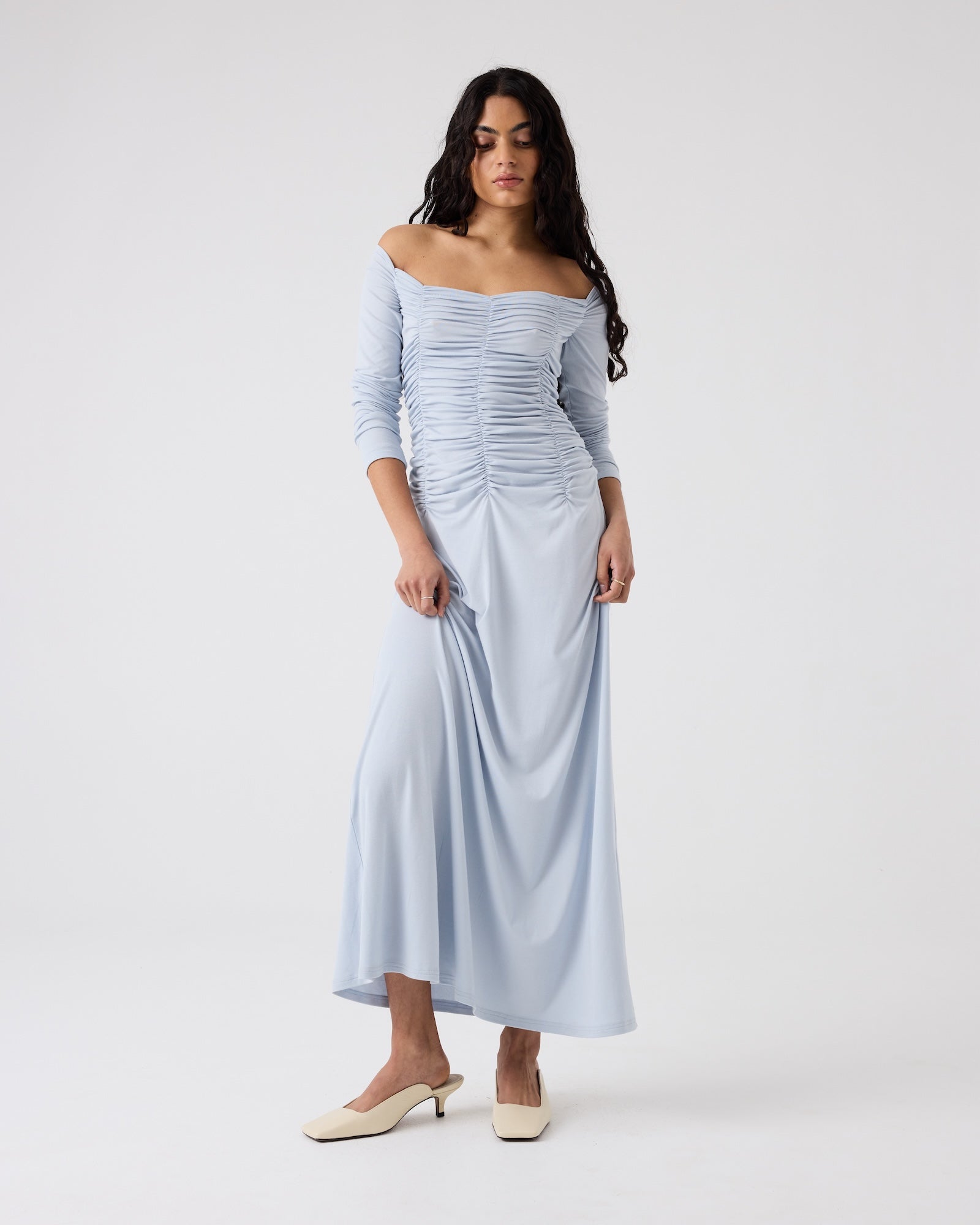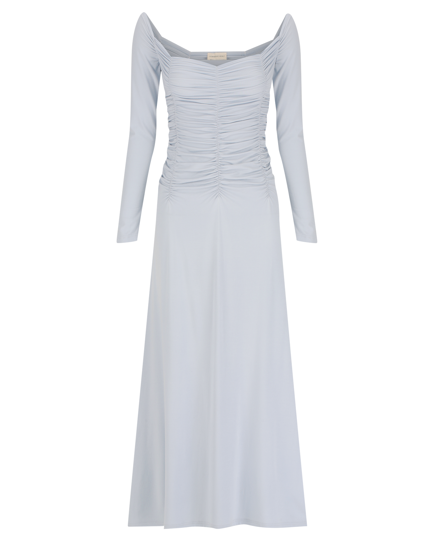 This dress features elasticated ruching through the bust, body and amrhole. Ruching creates a scalloped neckline highlighting the décolletage. Fabric is a soft modal jersey in a really fine rib with stretch making it one of our most comfortable statement dresses.
