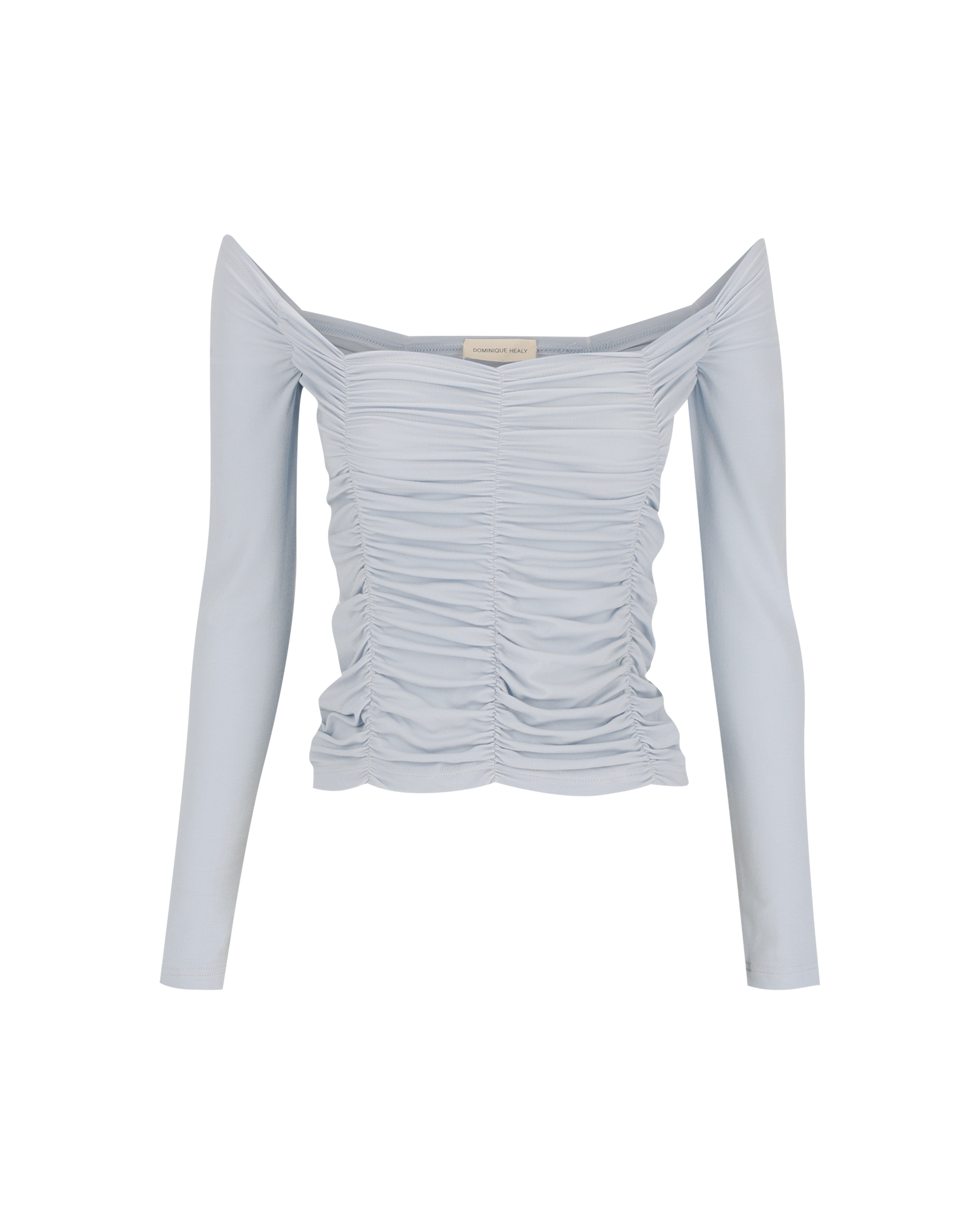 Jolene Longsleeve. This style sits either on the shoulder with a wide scoop neck or pulled down off the shoulder to show off the décolletage. Featuring elasticated ruching all over to add detail and texture.