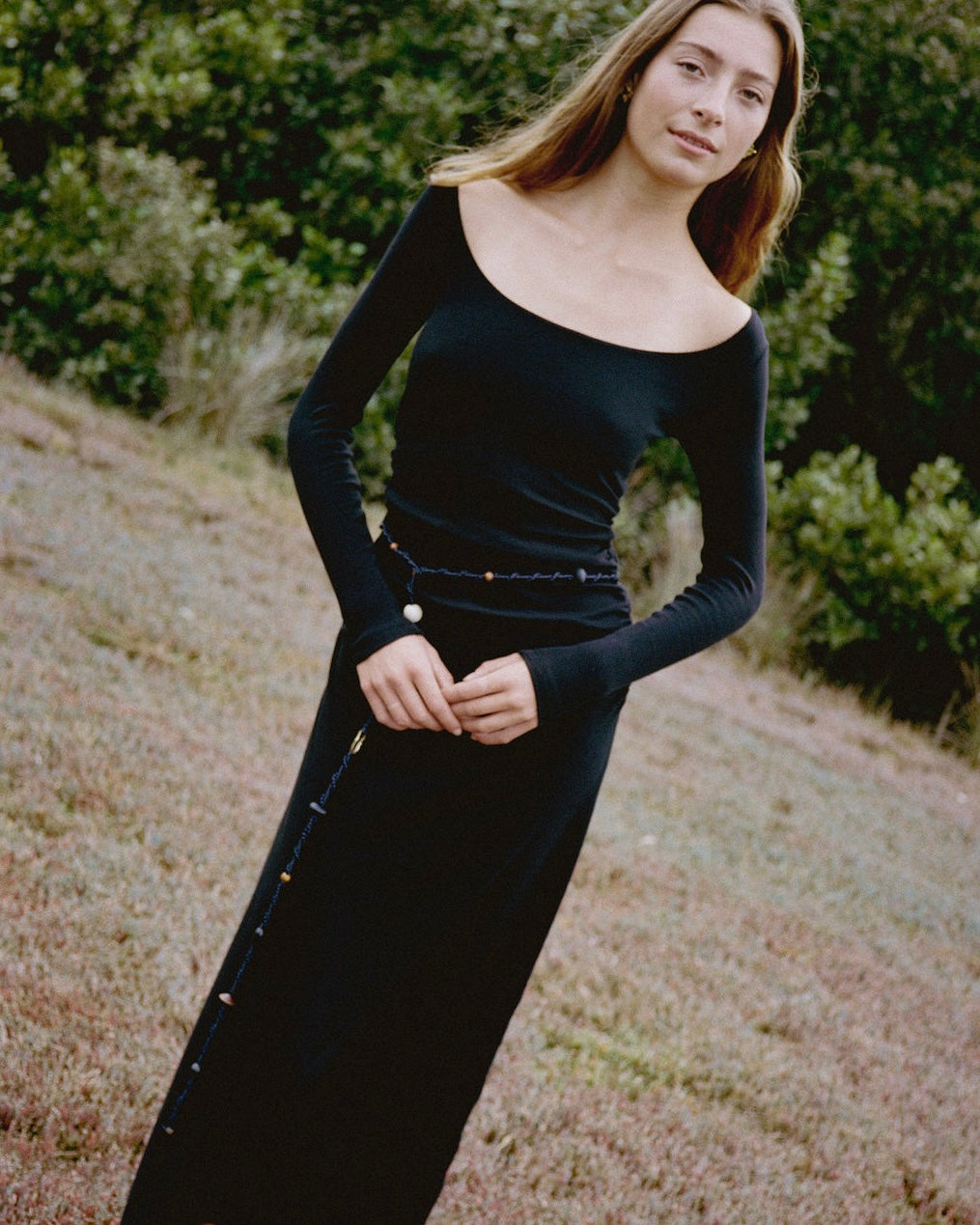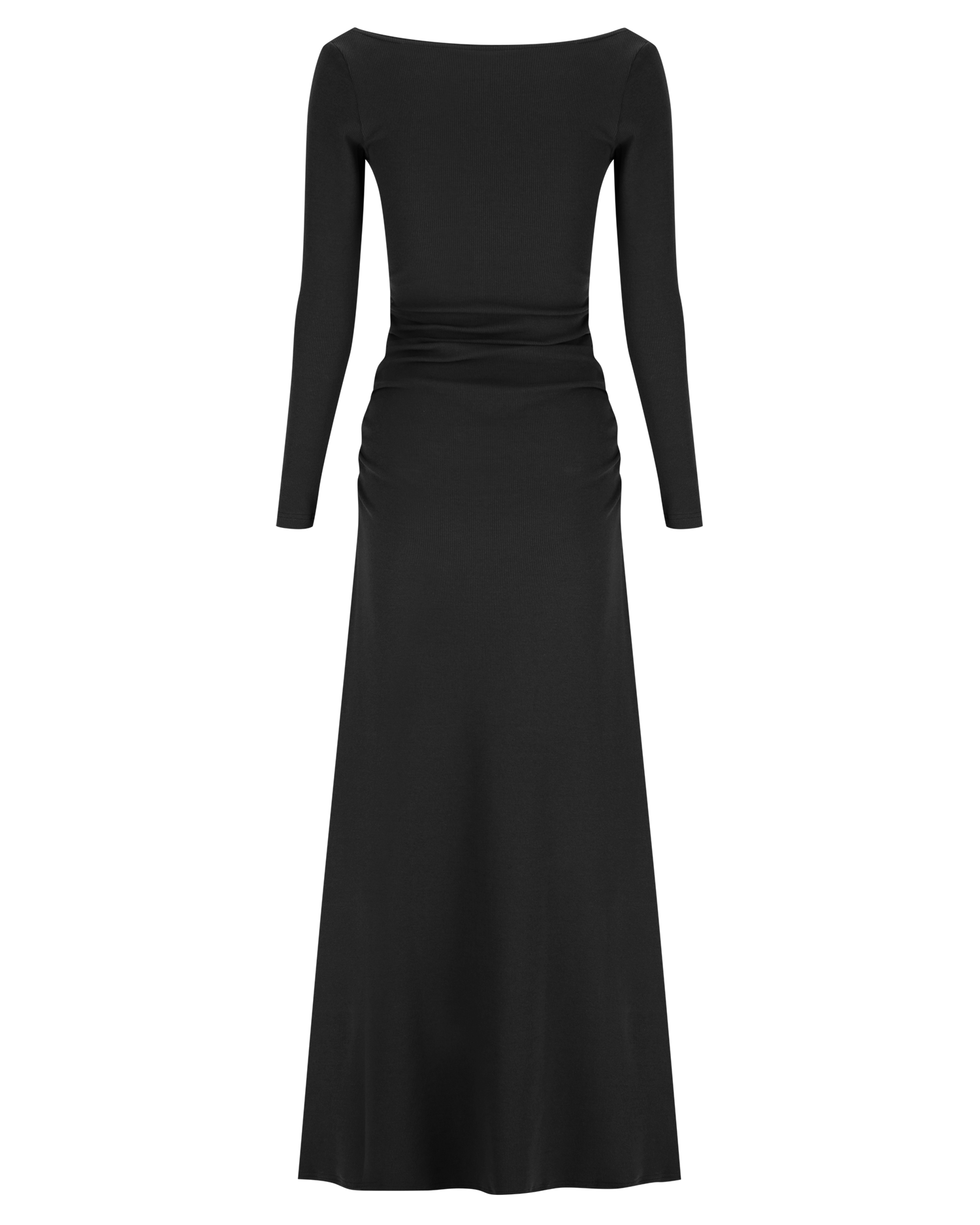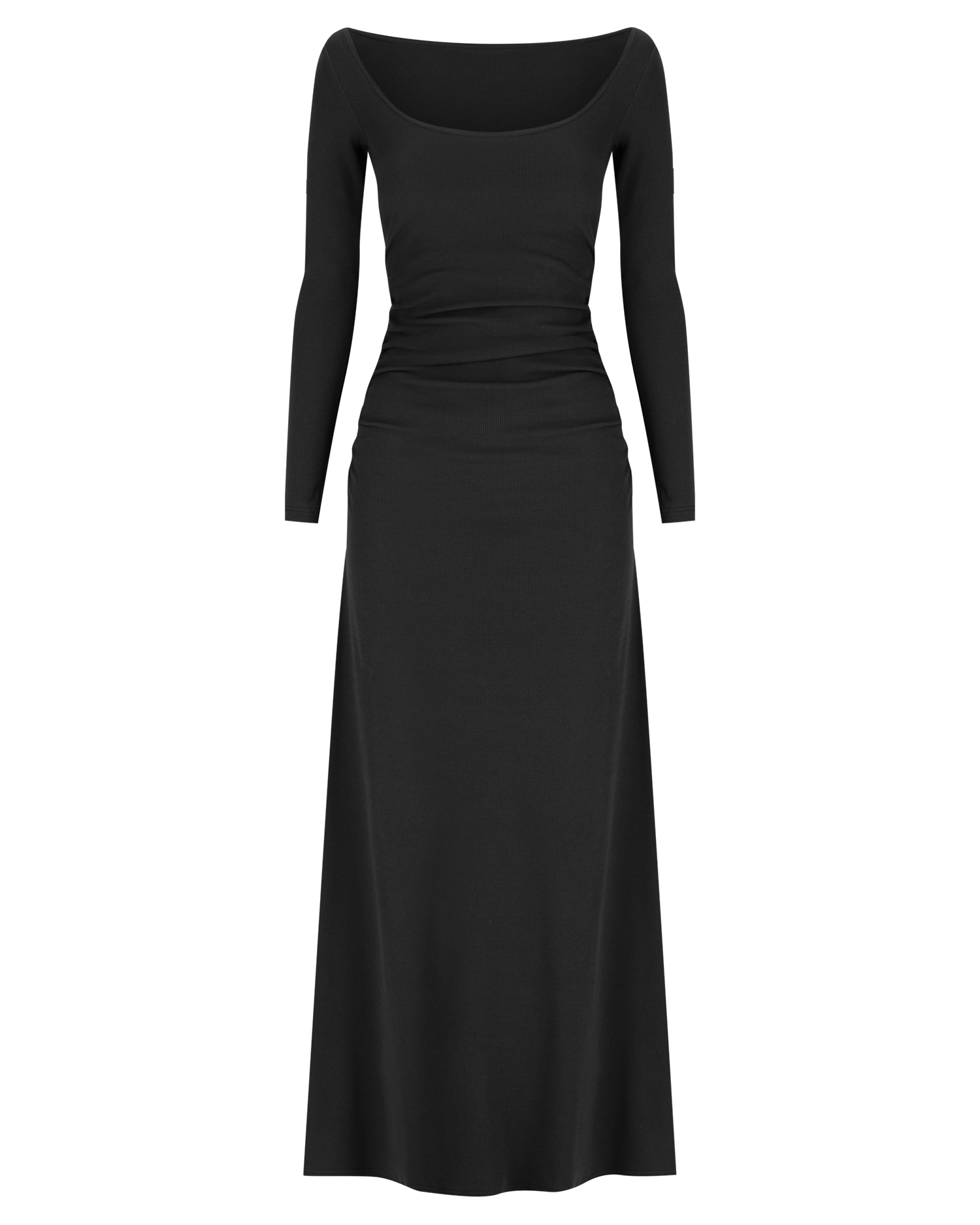Our Leo Dress sits with an open neck near the edge of the shoulder, with a deep scoop at the front and high at the back. Features elasticated ruching down the sides. Fabric is a rib with stretch and texture for extra ease and comfort.