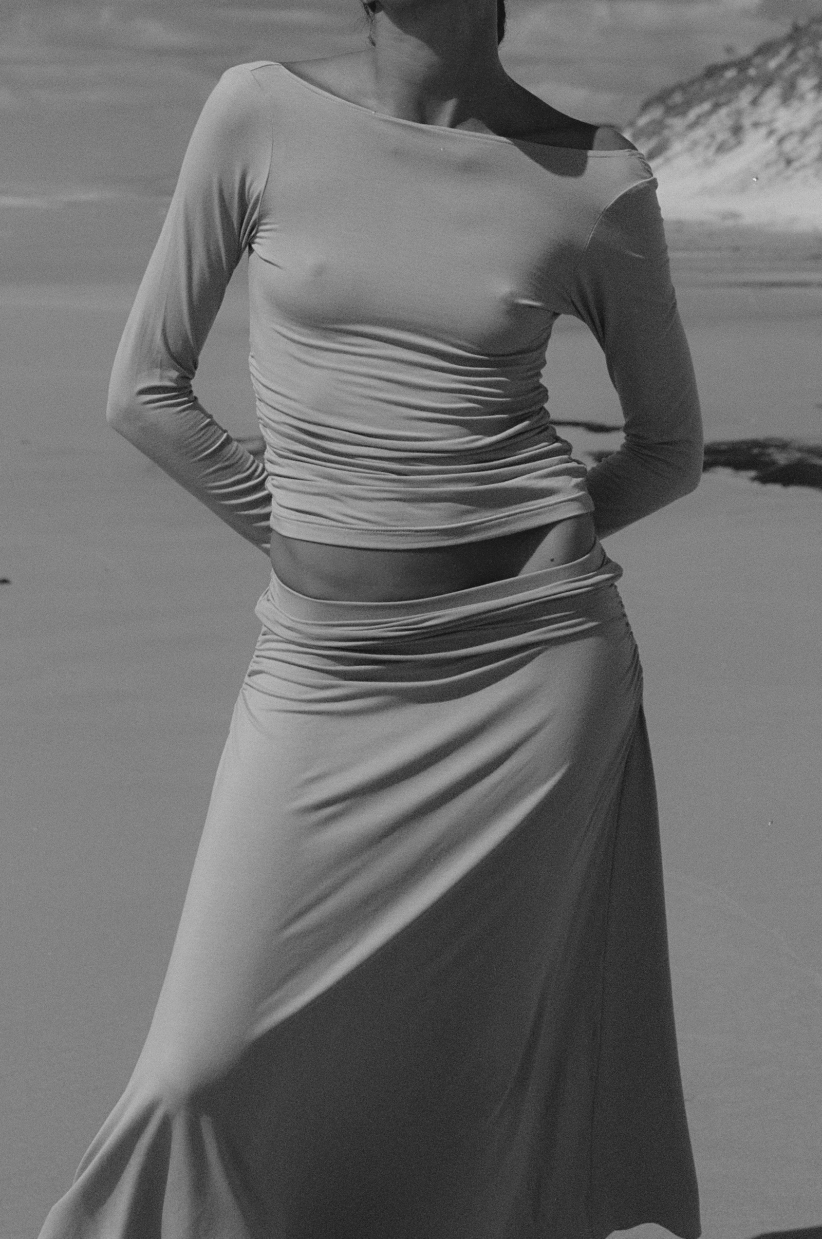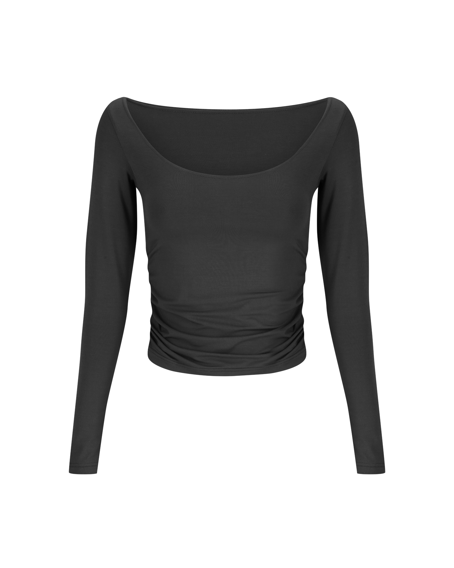 Our Lila Tee sits with an open neck near the edge of the shoulder, with a deep scoop at the front and high at the back. Features ruching down the sides. A classic shape, perfect on it's own or layered with shirts in the colder months.