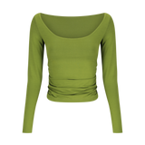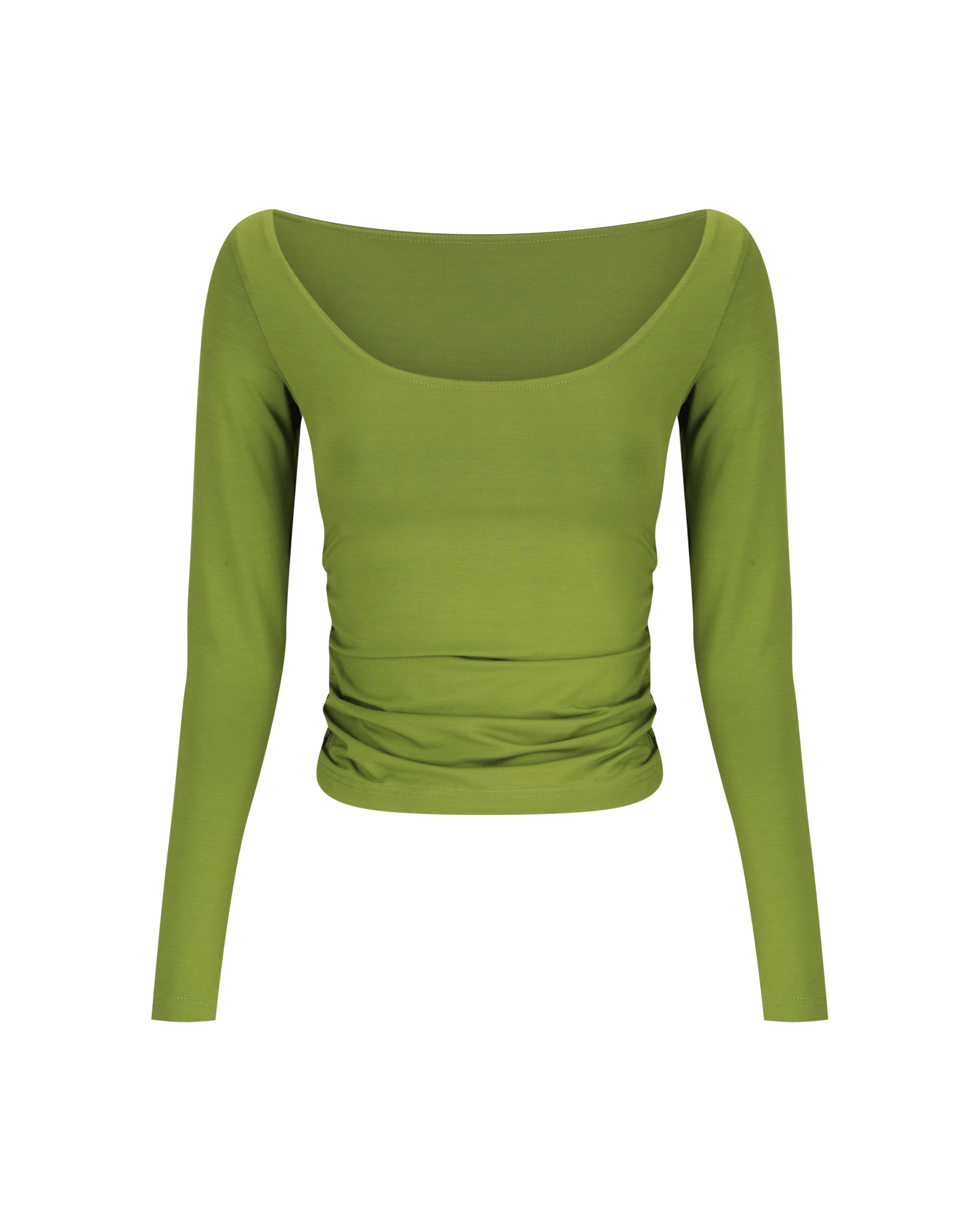 Our Lila Tee sits with an open neck near the edge of the shoulder, with a deep scoop at the front and high at the back. Features ruching down the sides. A classic shape, perfect on it's own or layered with shirts in the colder months.