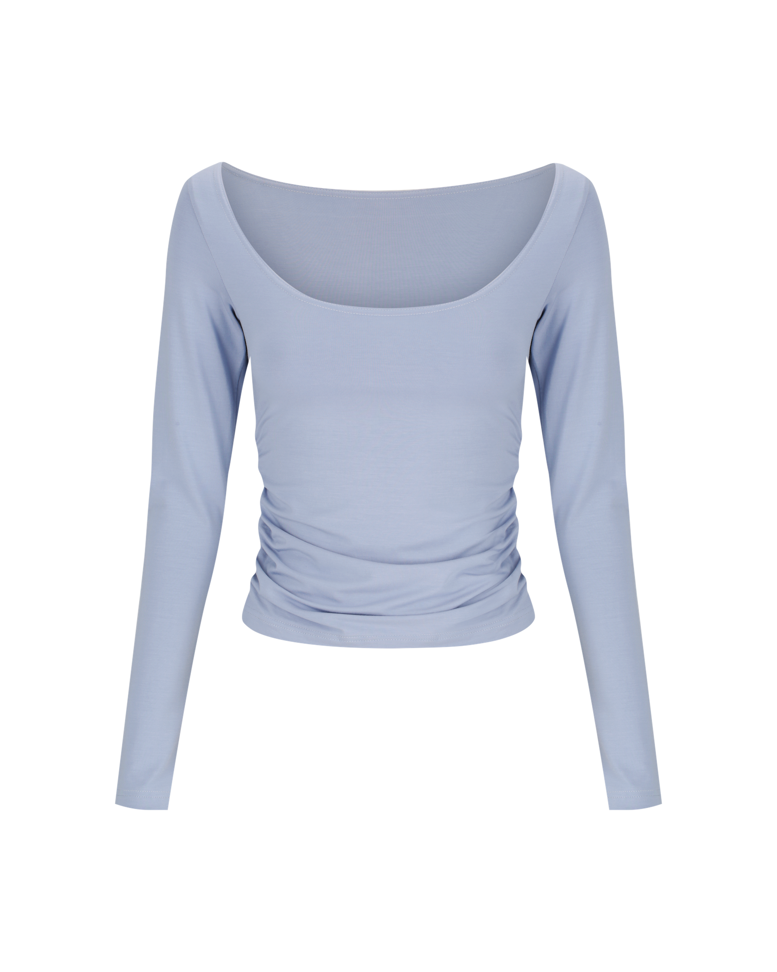 Our Lila Tee sits with an open neck near the edge of the shoulder, with a deep scoop at the front and high at the back. Features ruching down the sides. A classic shape, perfect on it's own or layered with shirts in the colder months.