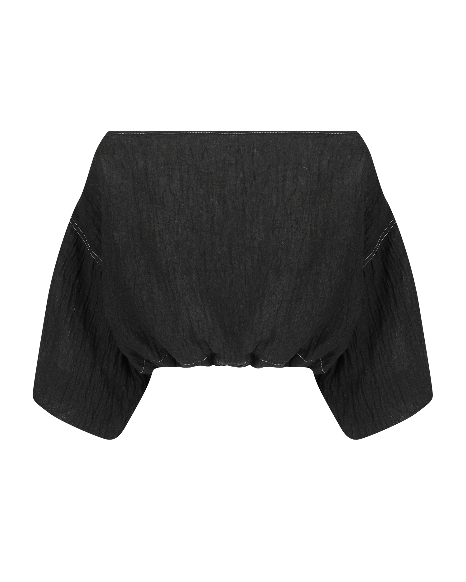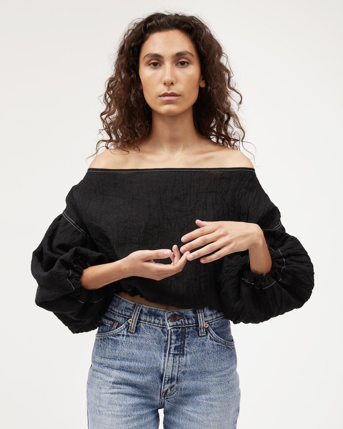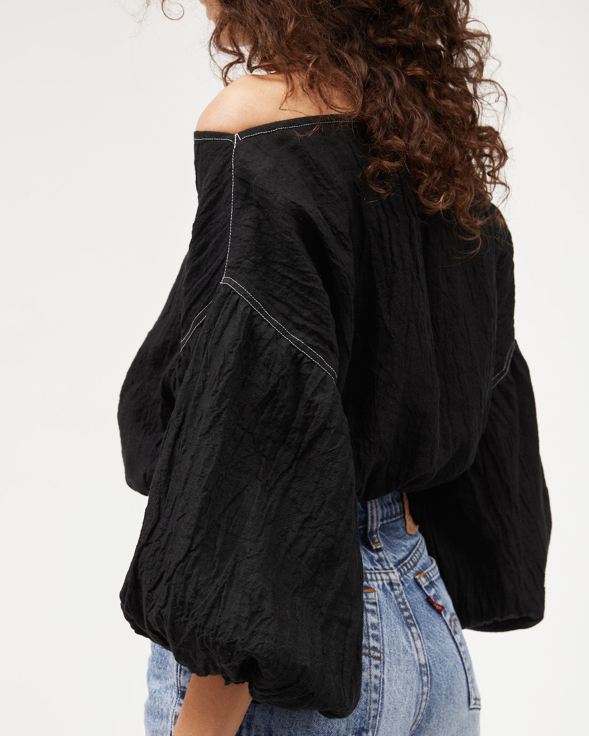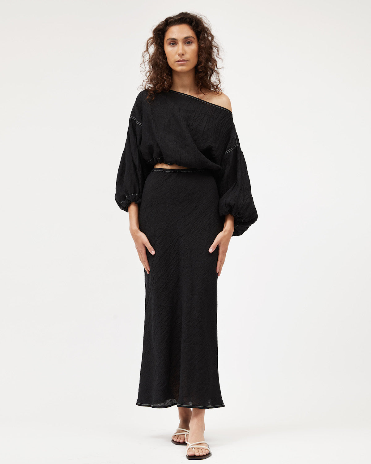 One of our favourite classic shapes the Louie Crop has billowy 3/4 sleeves. Sits at the edge of the shoulders, can be pulled further down to sit off shoulders due to elastic in back. Features contrast stitch. Pictured here with matching Bias Skirt.