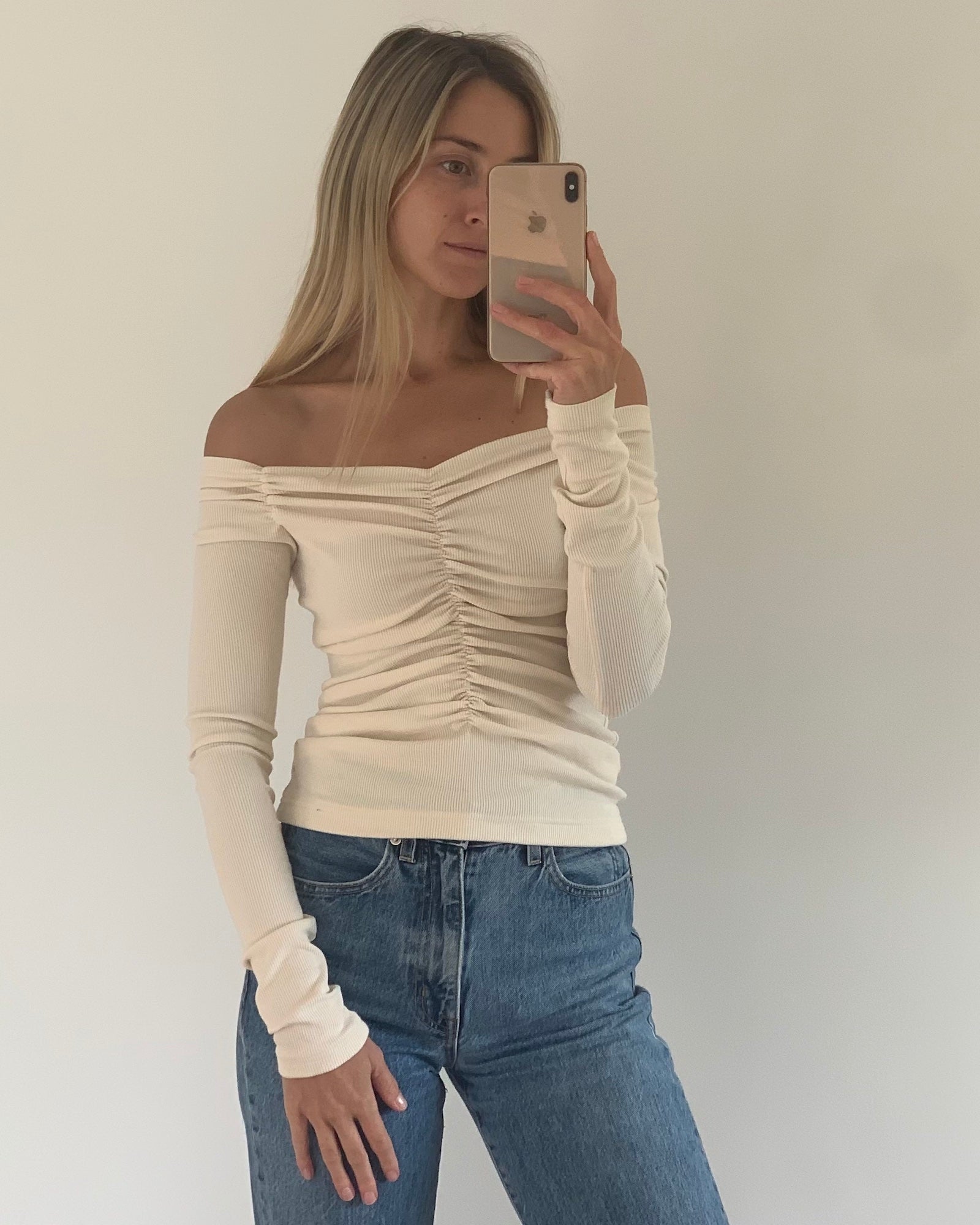 Our Luella Longsleeve sits off the shoulder and features elasticated ruching. The neckline is designed to show off the décolletage however you can style up on the shoulders if you prefer for a more everyday neckline.