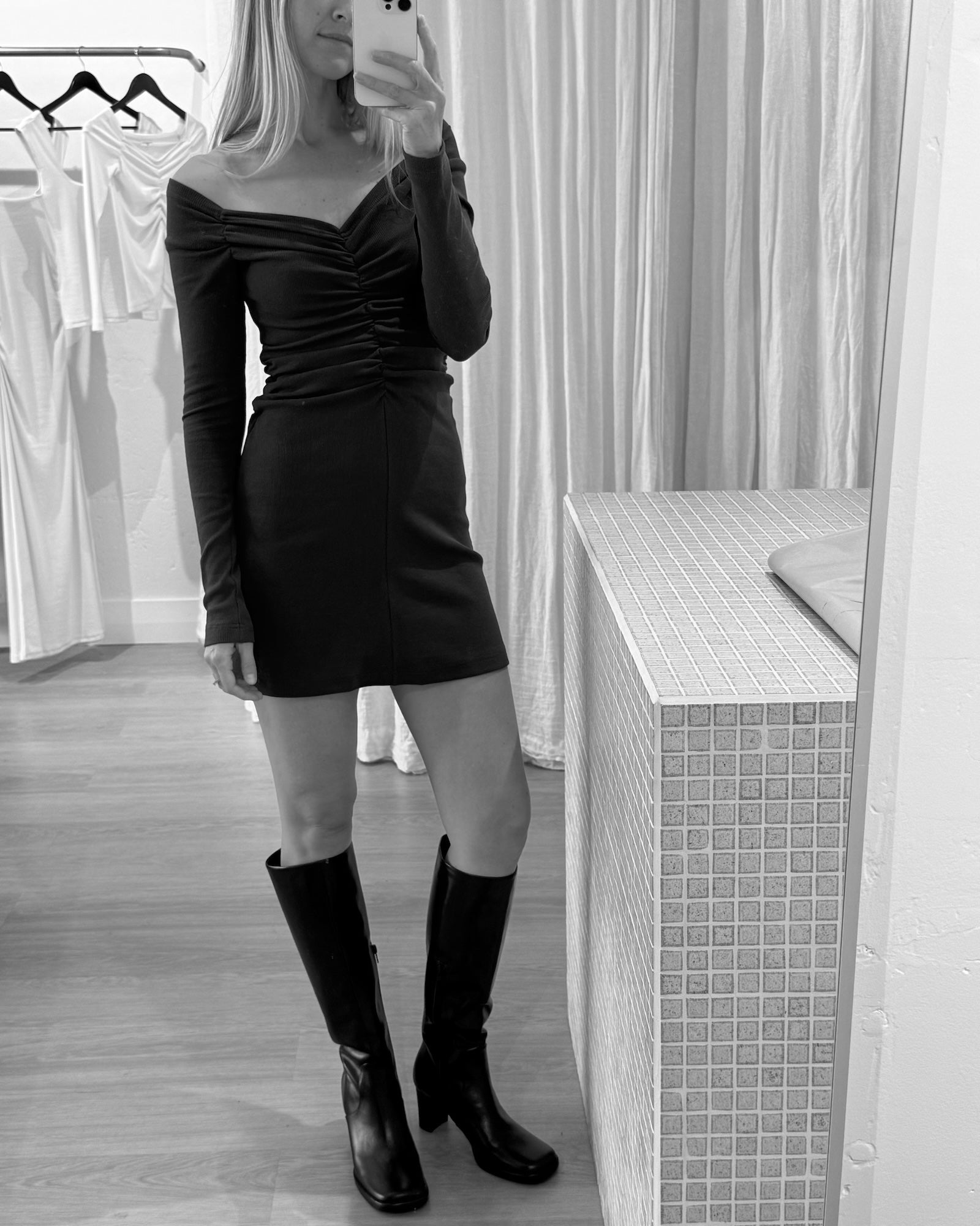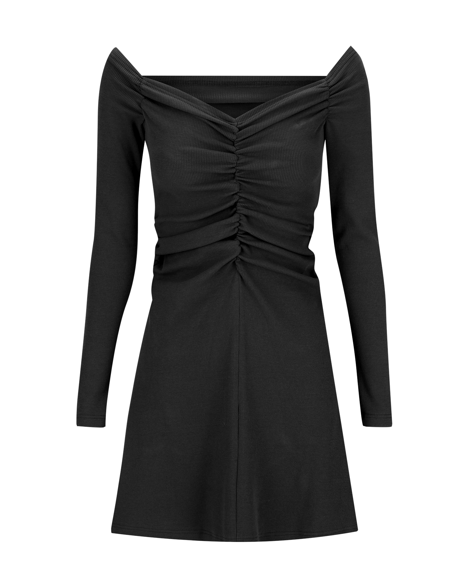 Our Luella Mini Dress sits off the shoulder and features elasticated ruching. The neckline is designed to show off the décolletage however you can style up on the shoulders if you prefer. Ruching at the centre front and sides.