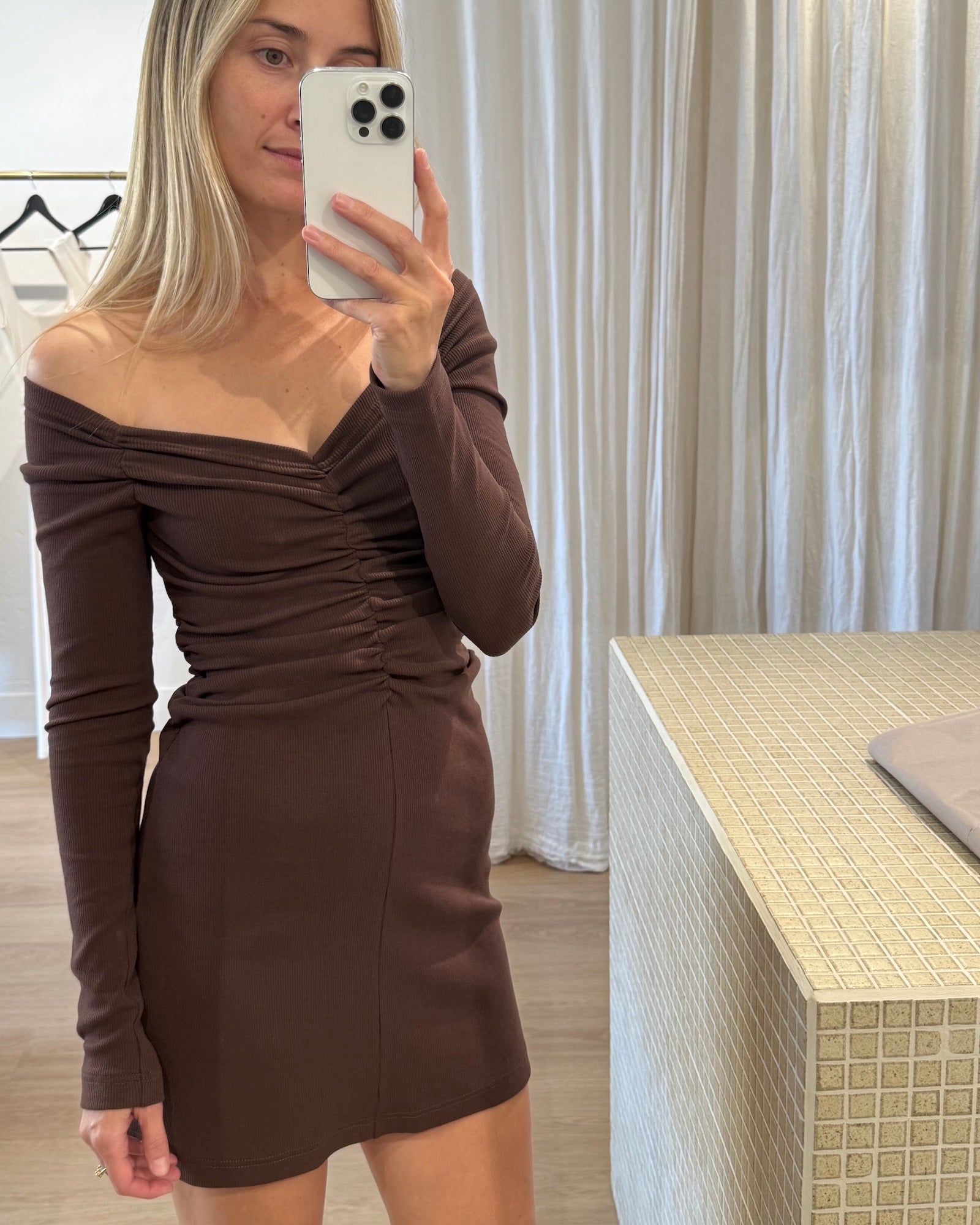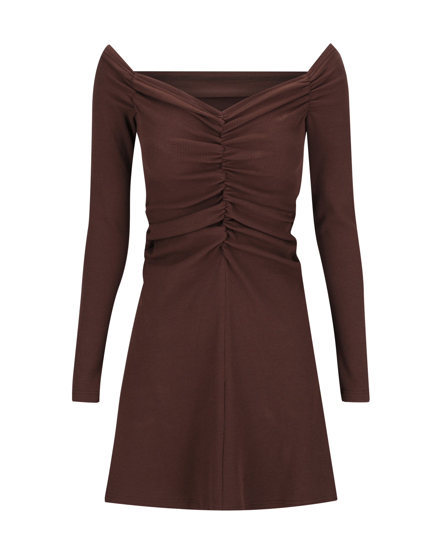 Our Luella Mini Dress sits off the shoulder and features elasticated ruching. The neckline is designed to show off the décolletage however you can style up on the shoulders if you prefer. Ruching at the centre front and sides.
