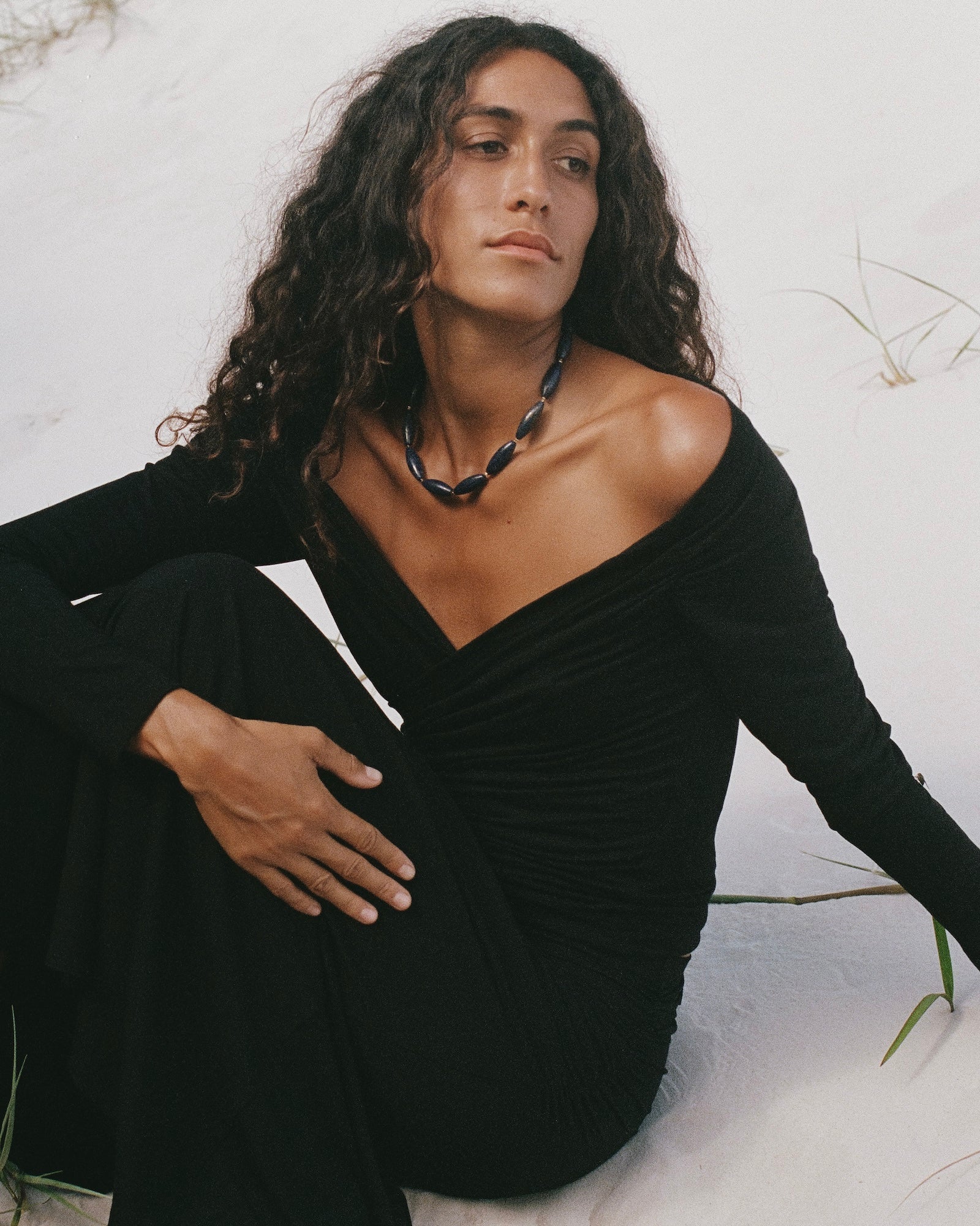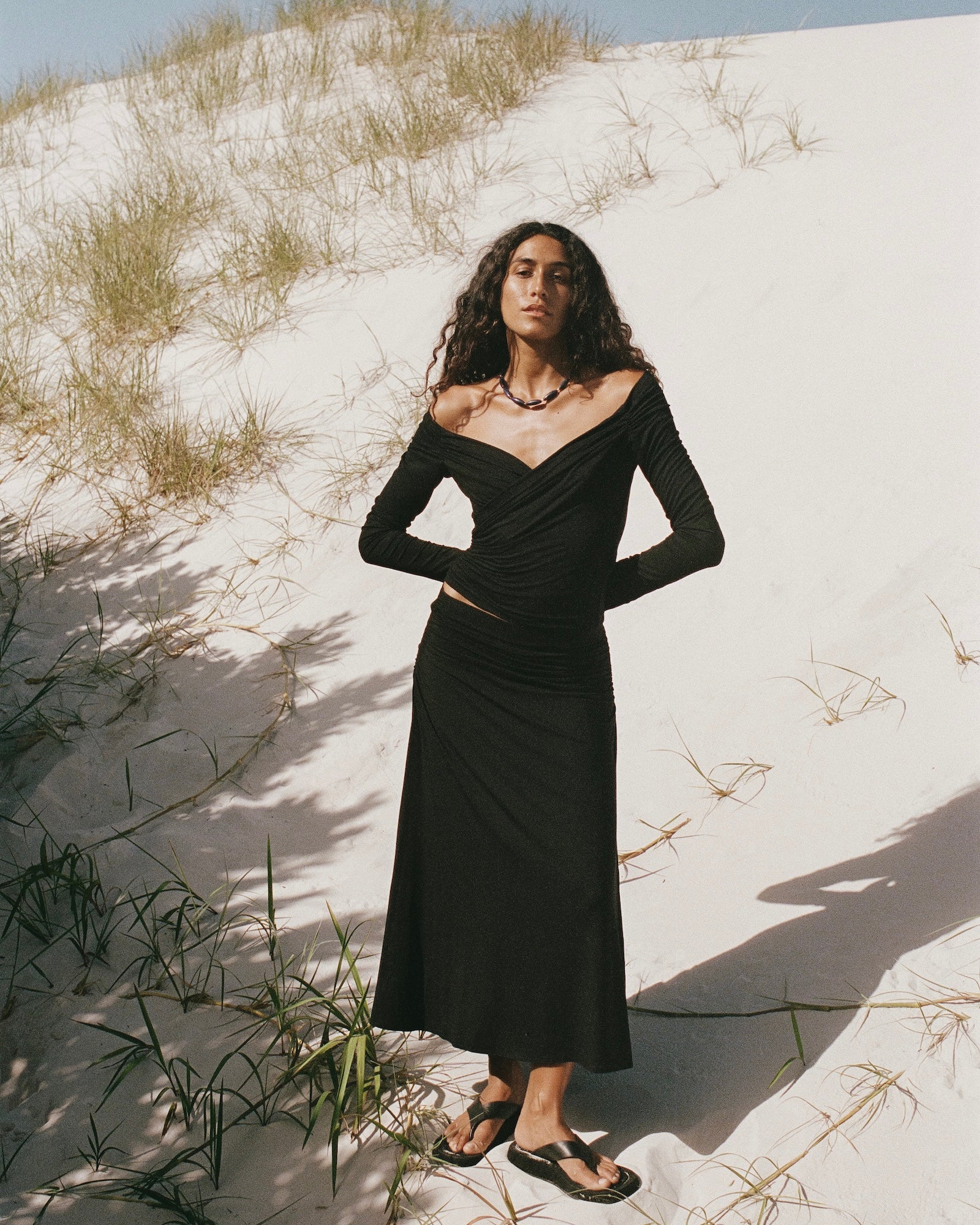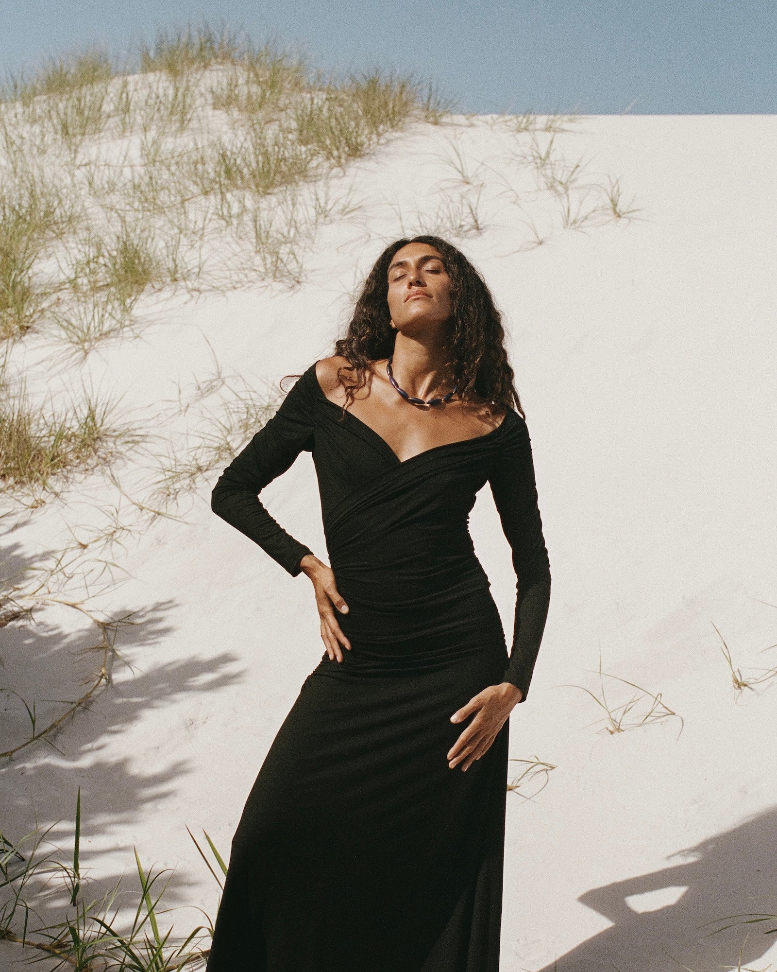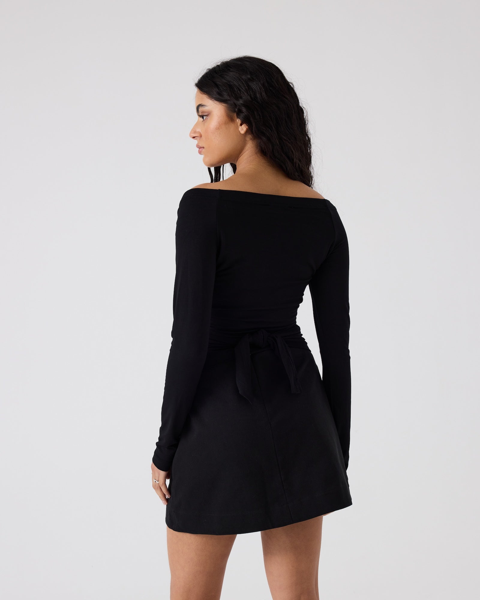 Mae, our long-sleeve wrap top that sits just off the shoulder. Featuring elasticated ruching at the front armholes. The neckline is designed to show off the décolletage.