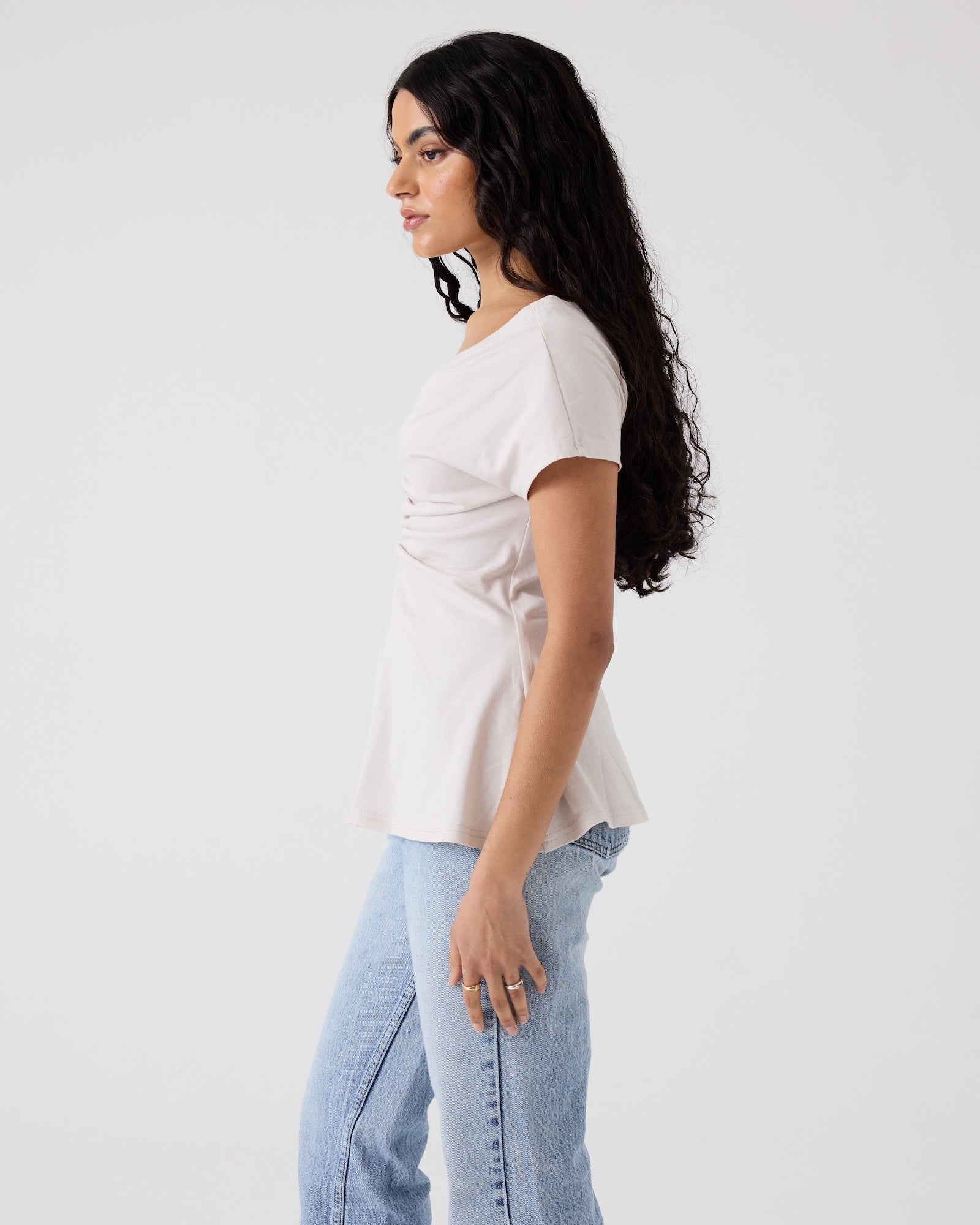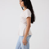 This top was designed for those who love some of our off the shoulder styles like the Niveah but don't want it quite so fitted. This style sits right at the edge of the shoulders, featuring elasticated ruching down the centre front, skims in under the bust then sweeps out into an a-line shape. Pairs perfectly with denim and trousers.