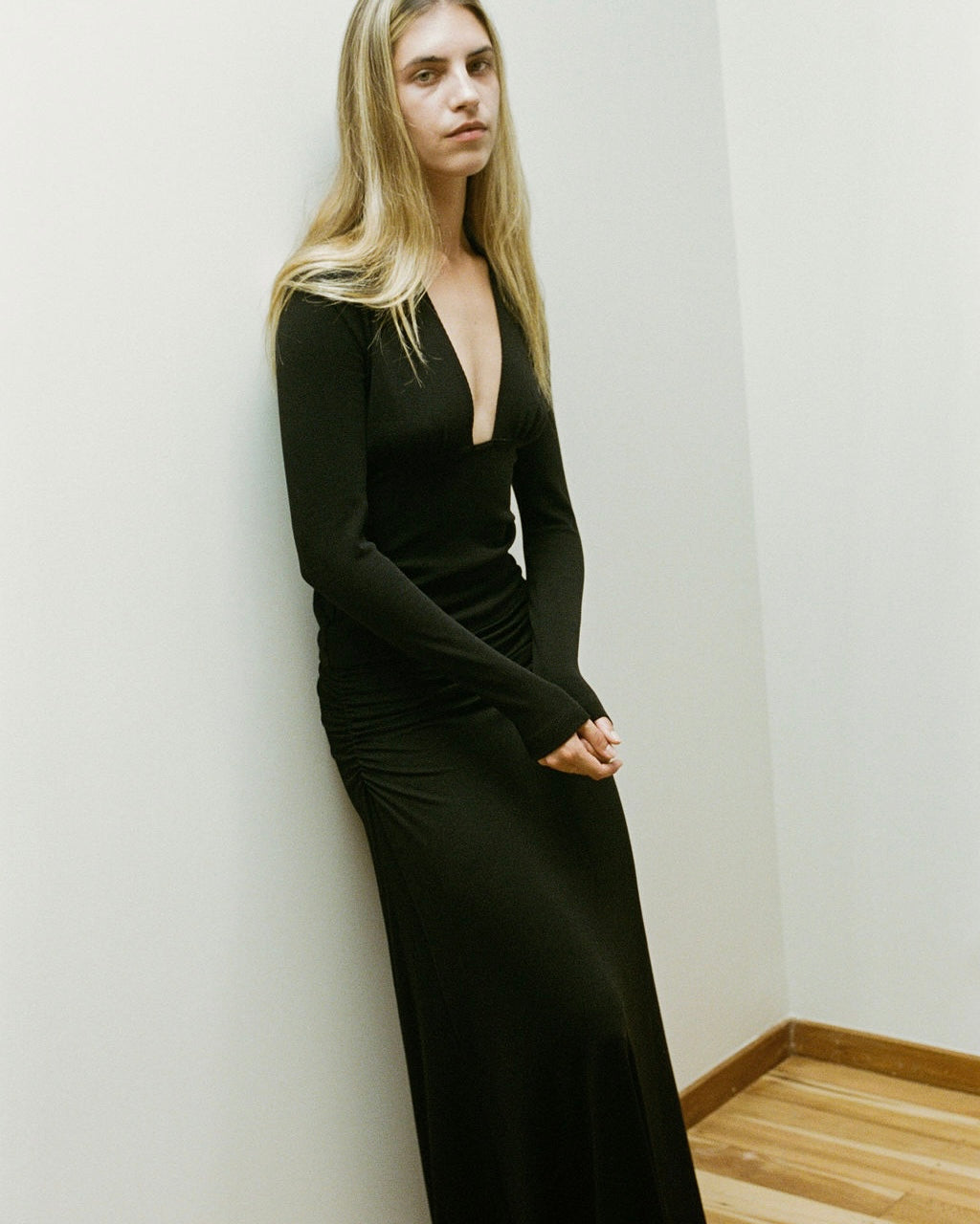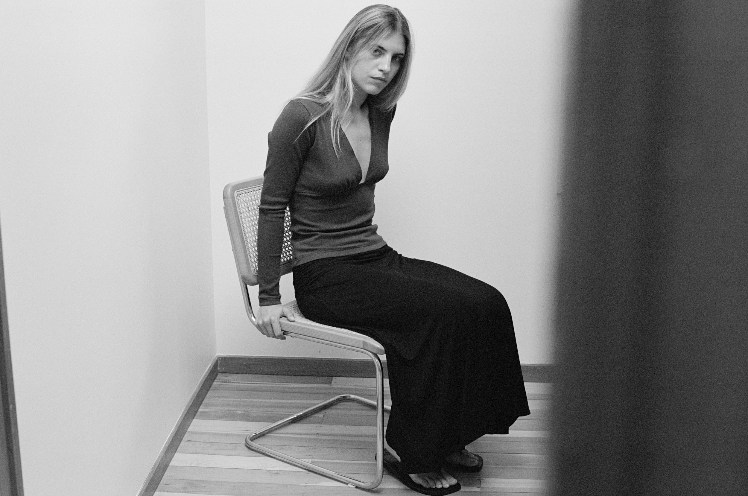 Featuring a squared V neckline, this style feels like a statement on its own while remaining versatile enough to wear under shirts or layered with outerwear. The close fit and textured fabric create a clean, sculpted silhouette. Paired with our Olympia Skirt.