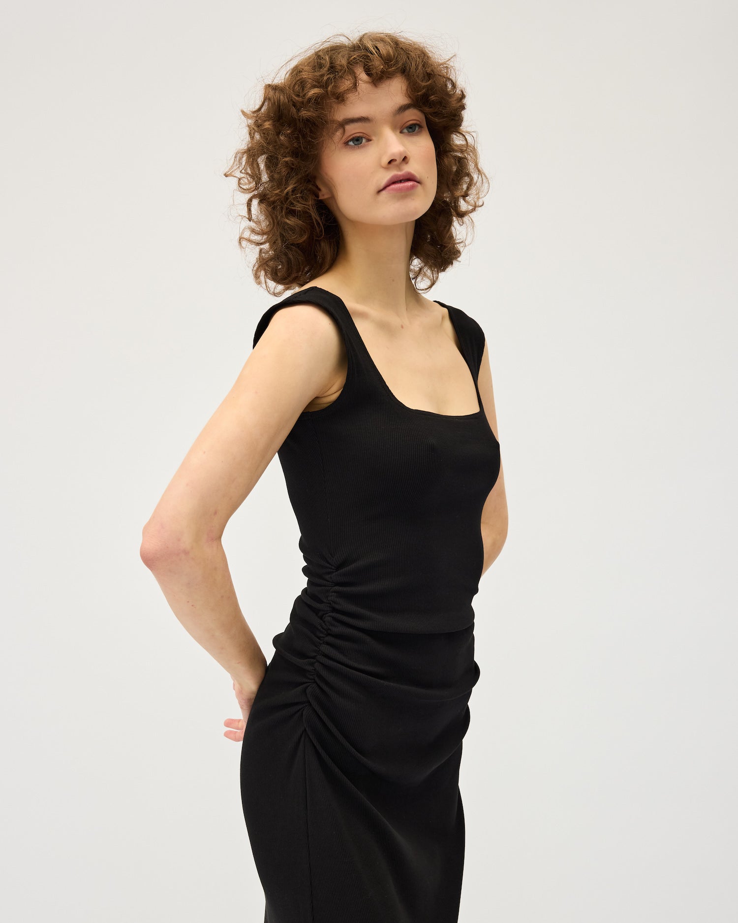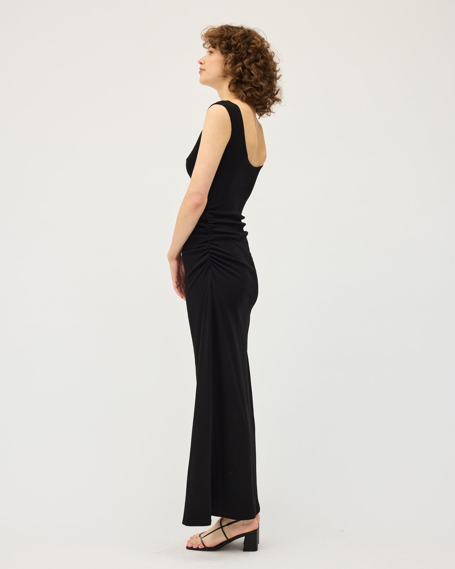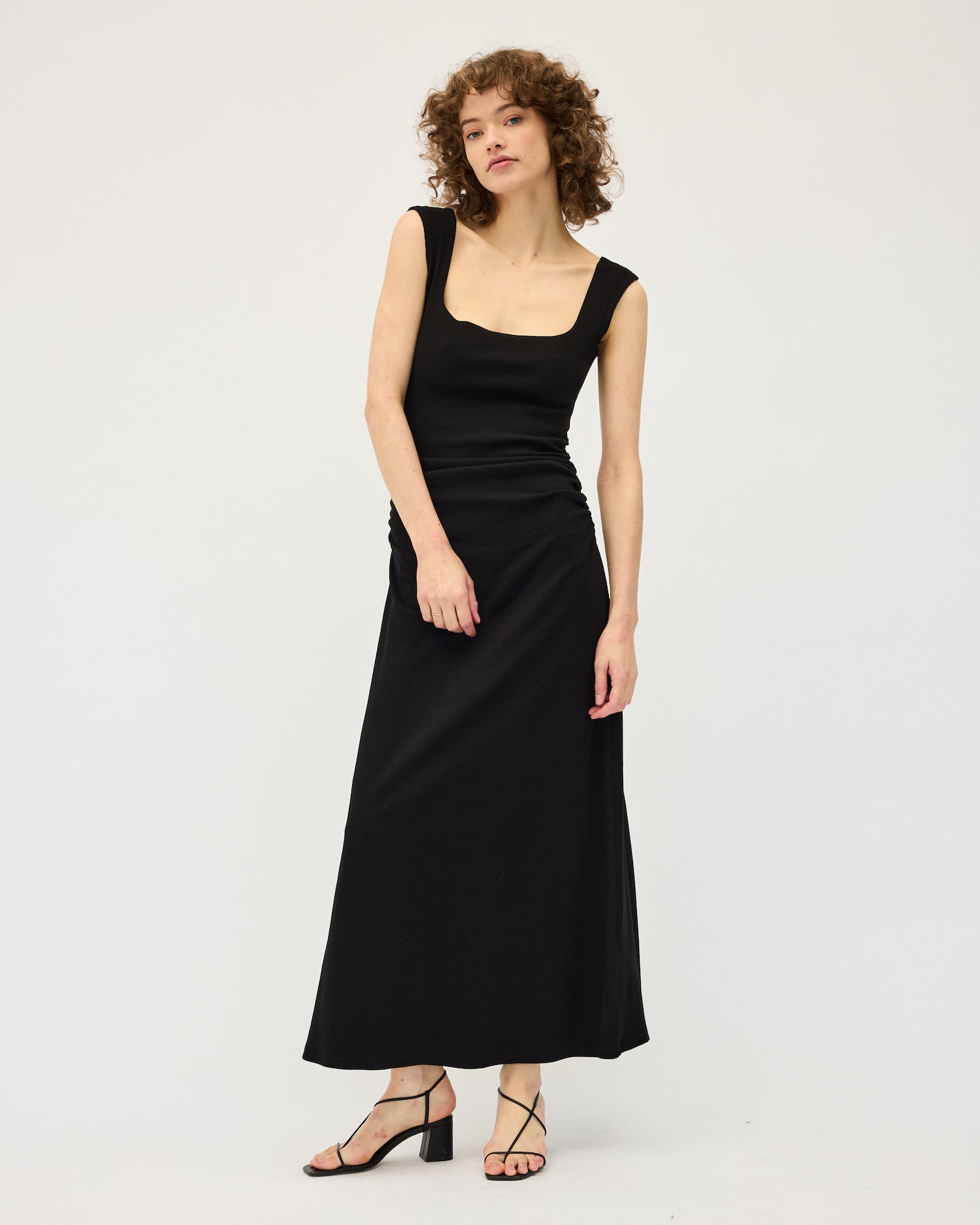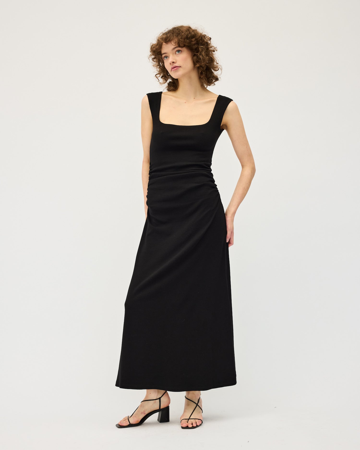 The Naia Tank Dress was designed to be your go-to dress. Comfortable, clean and classic, featuring our low square neckline with a scoop back and wider straps to hide bra straps. Features ruching down the sides, length is 7/8 sitting just above the ankle. Easily dressed up or down - also pairs well with an open shirt for those cooler days and nights. Made using our soft cotton / spandex rib, this fabric has stretch for ease and comfort.