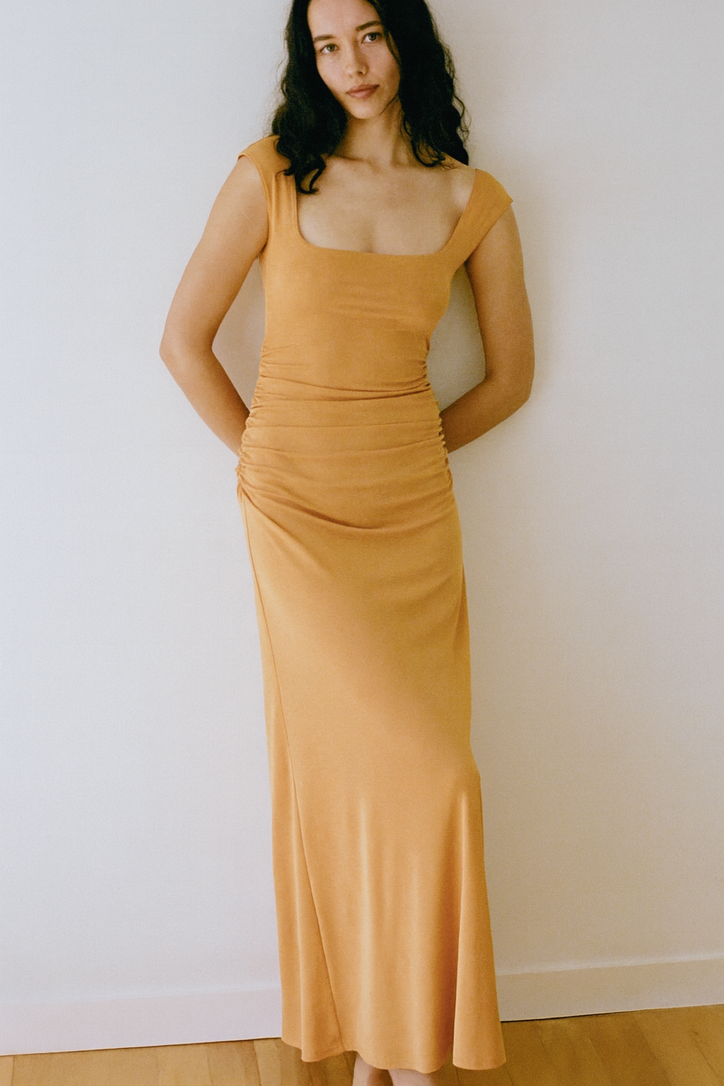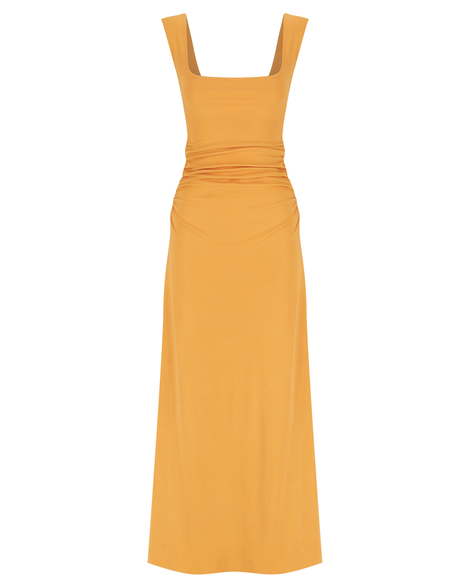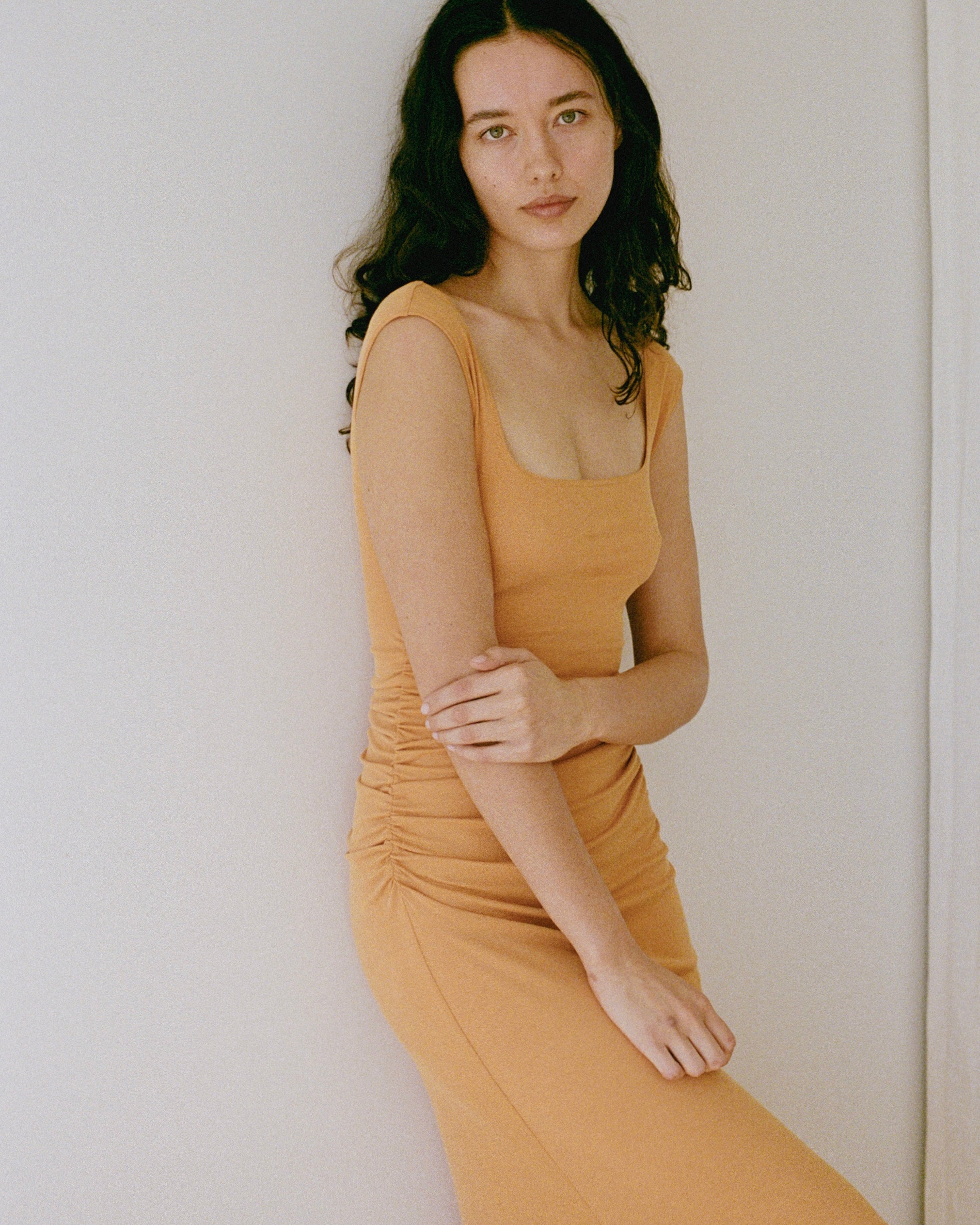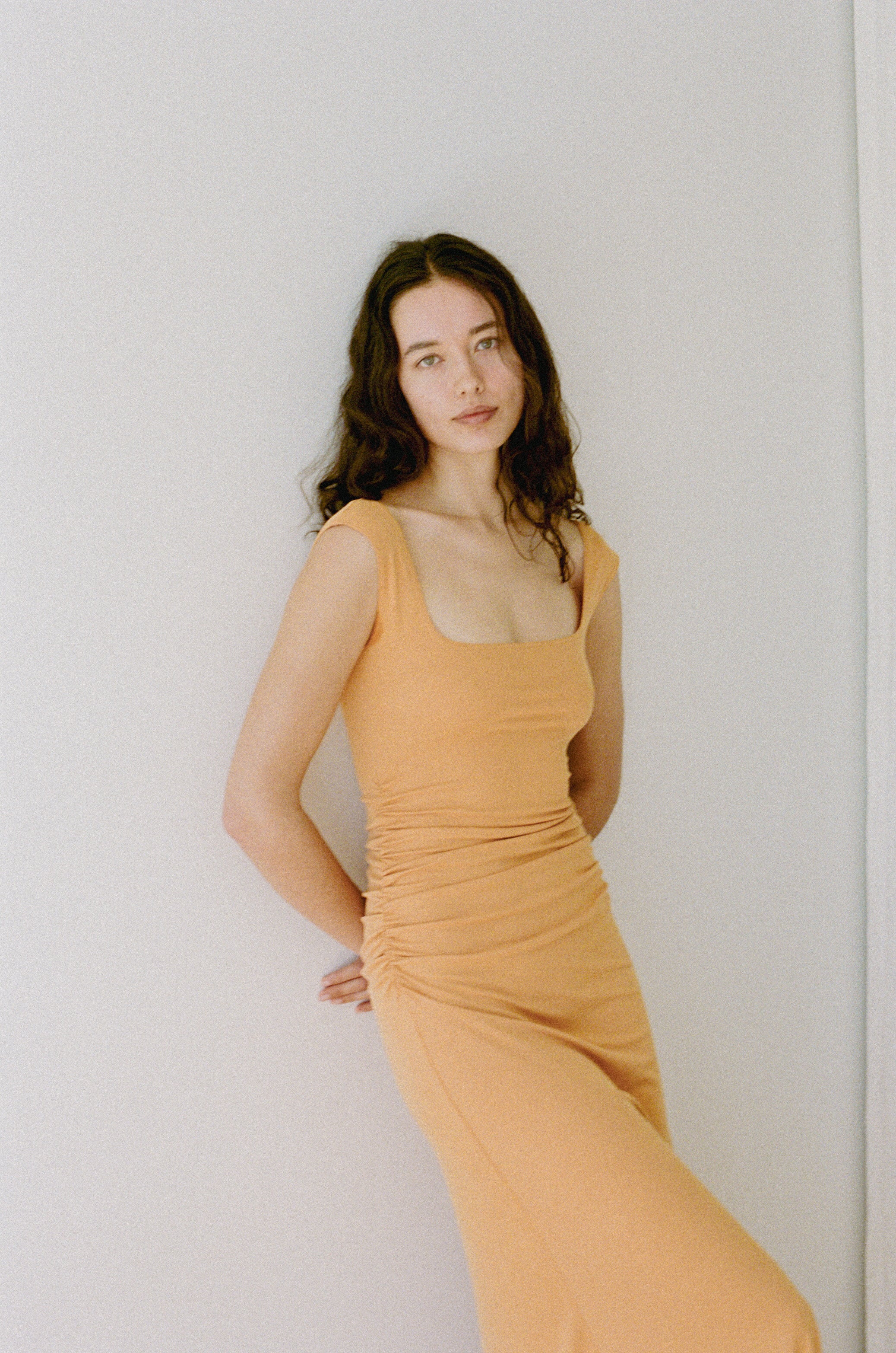Our classic Naia square neckline in a new 'to the floor' length. Features ruching at the sides and has a simple scoop back. Made from a soft premium cupro blend which has stretch and a subtle sandwash finish. A classic elegant shape.