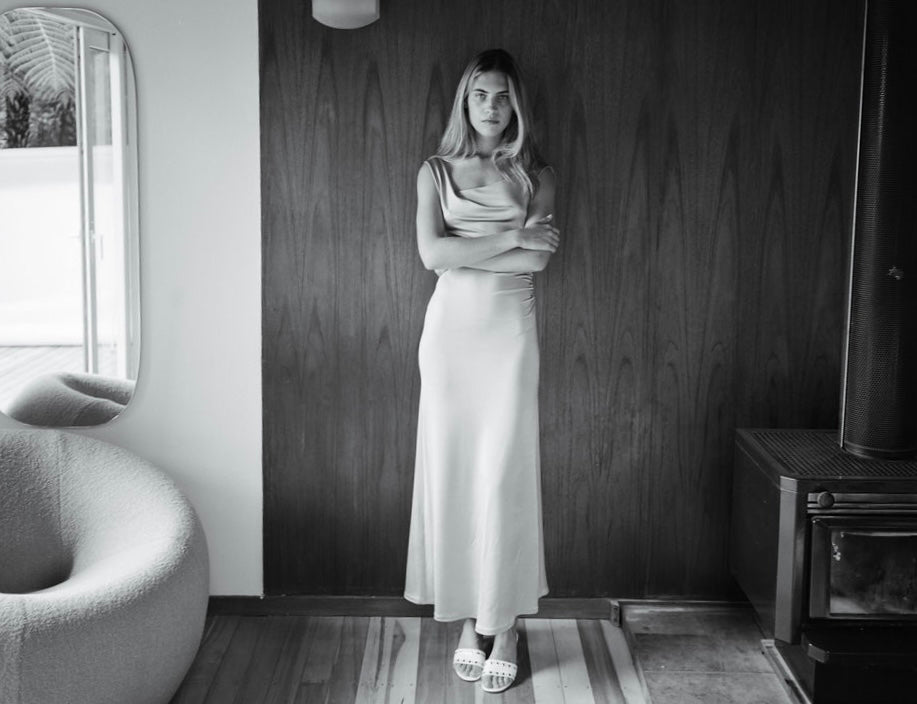 The Nevermind Dress is a softly draped, style is designed with an asymmetric neckline that slopes down on one side, creating gentle folds through the fabric. The silhouette is effortless, revealing a subtle touch of skin while remaining more covered than our deeper scoop styles.