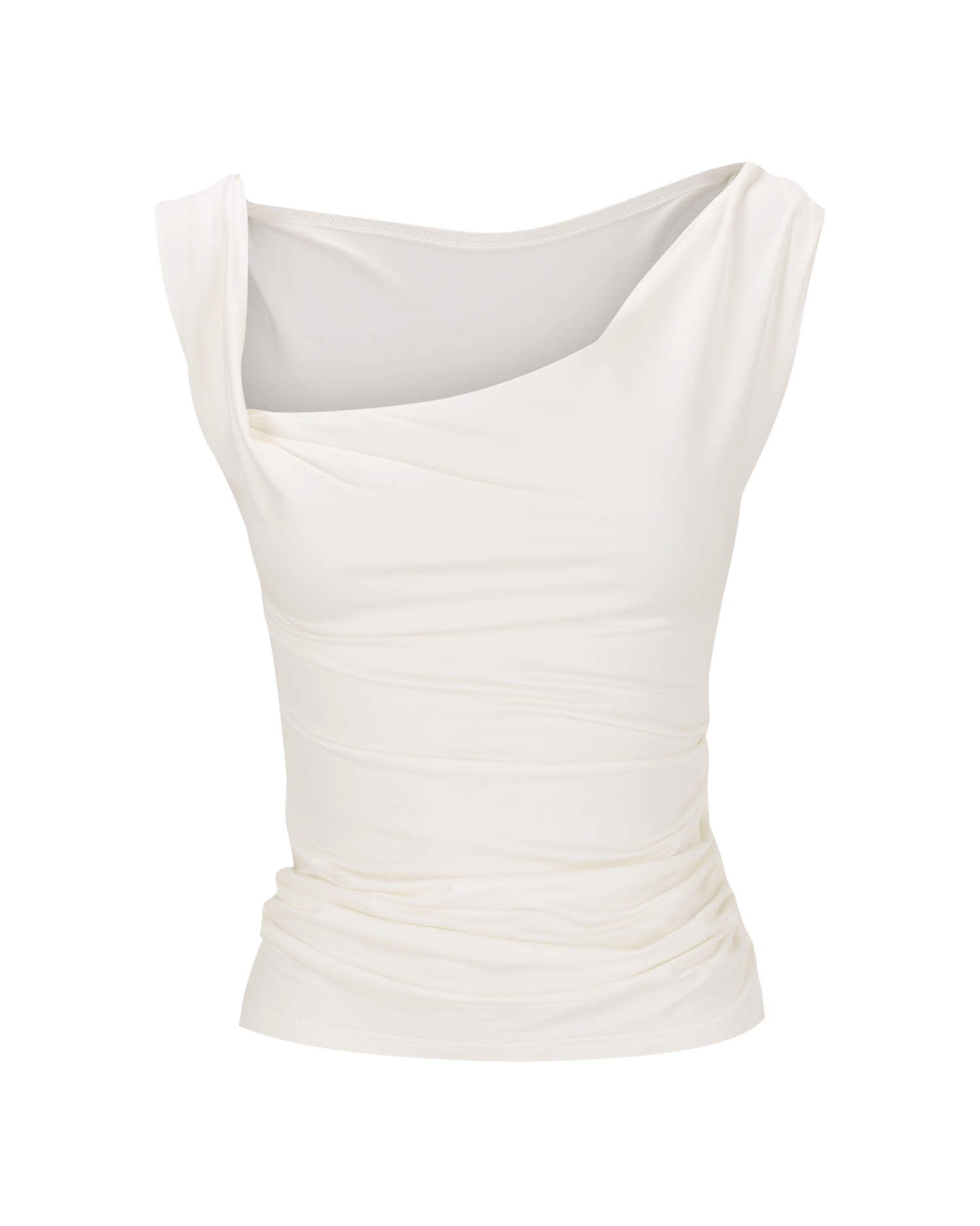 The Nevermind Singlet is a softly draped style designed with an asymmetric neckline that slopes down on one side, creating gentle folds through the fabric. The silhouette feels considered yet effortless, revealing a subtle touch of skin while remaining more covered than our deeper scoop styles.