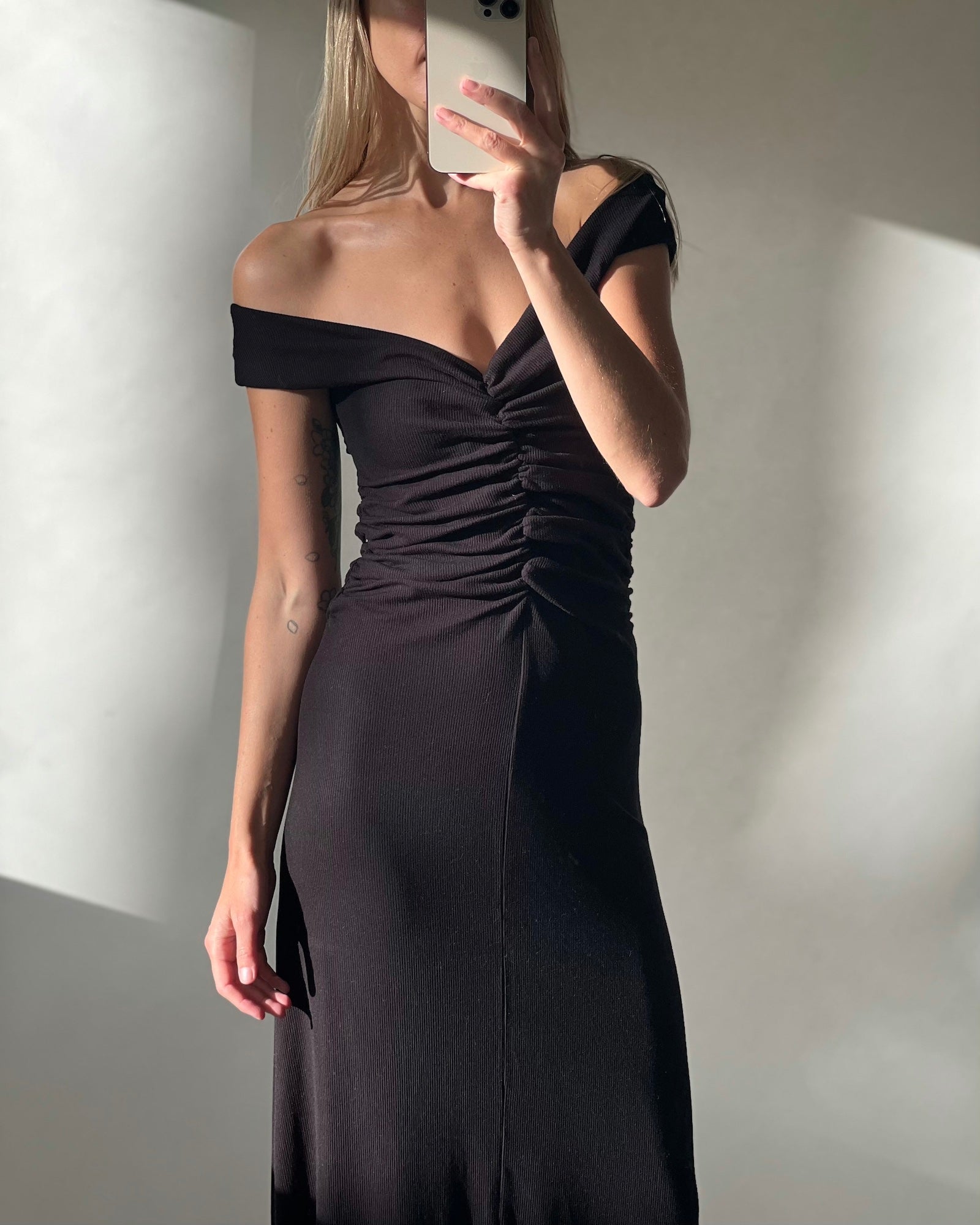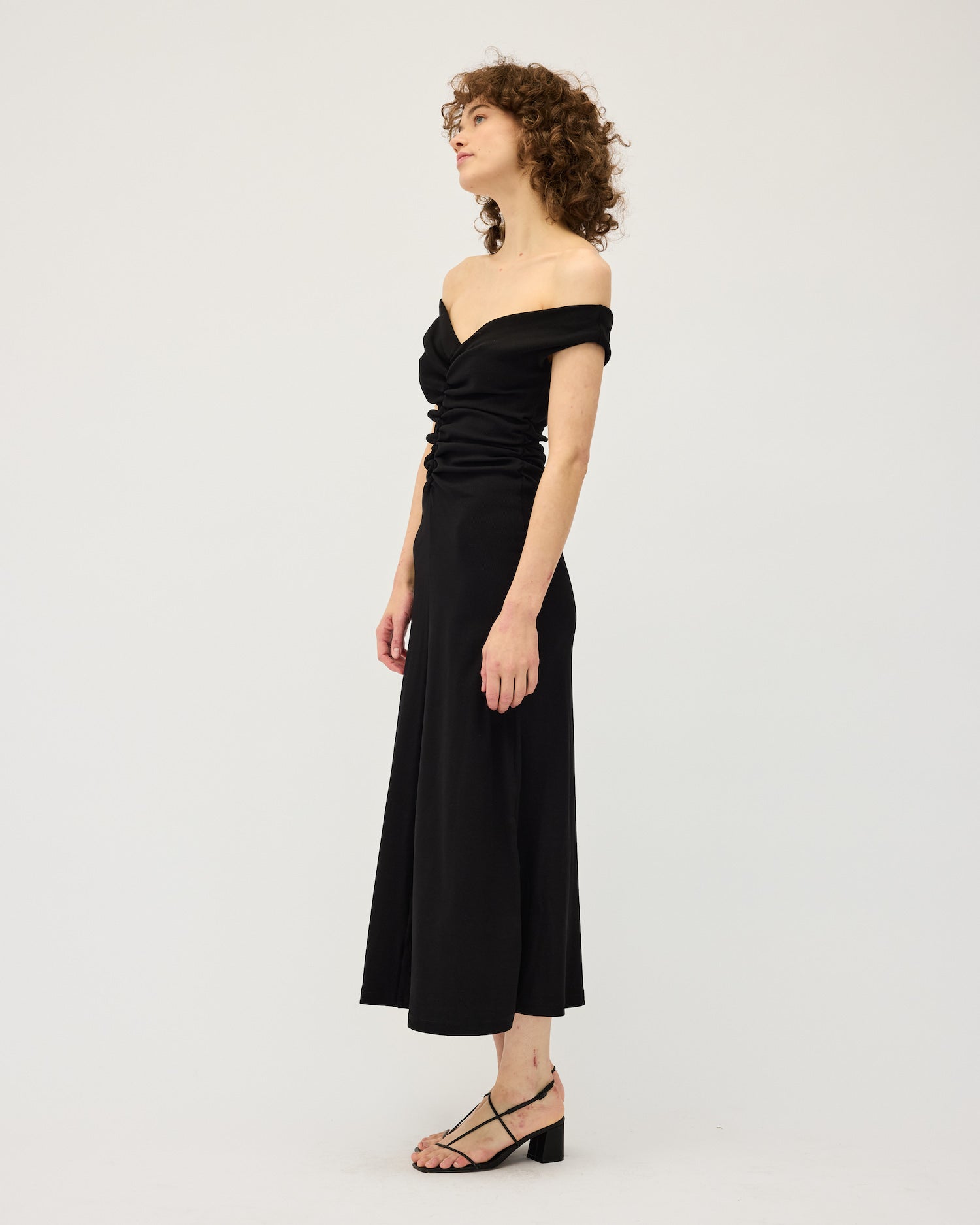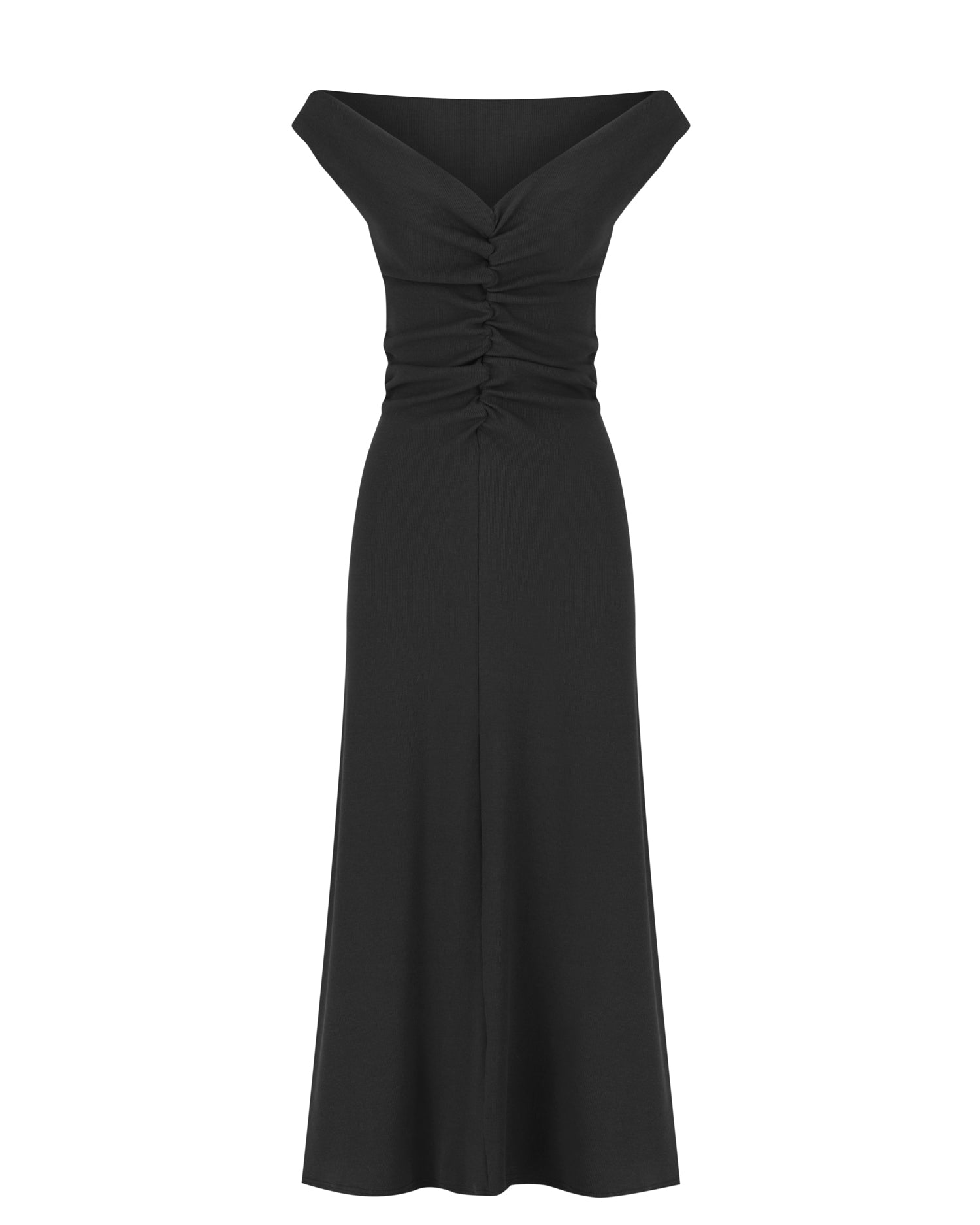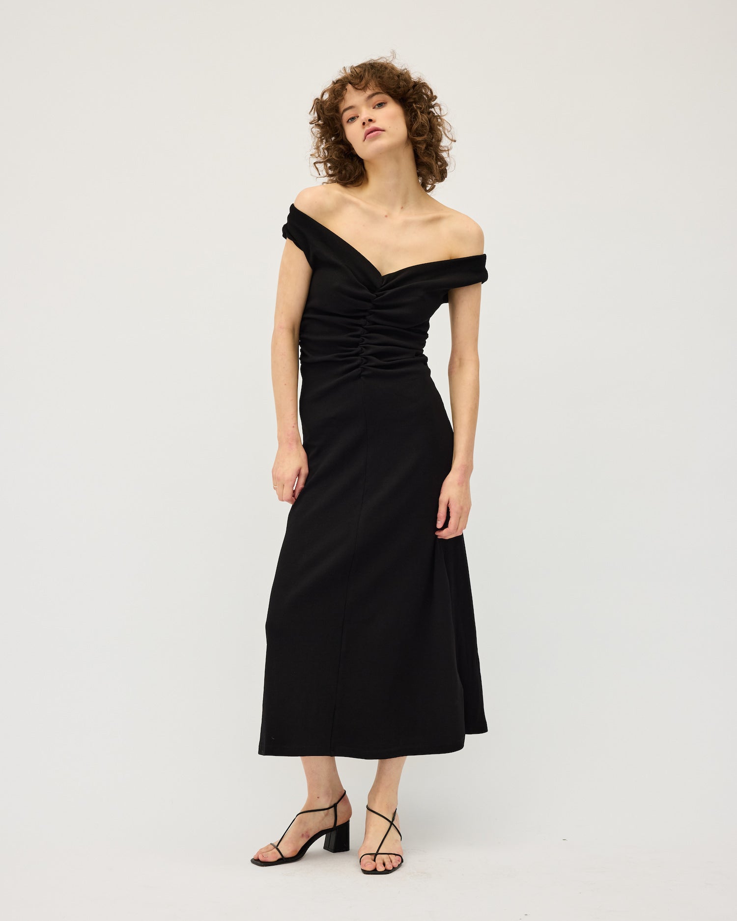 Our Niveah Dress sits off the shoulder and features elasticated ruching down the sides and front creating an elegant V neckline to show off the décolletage. Length is midi.