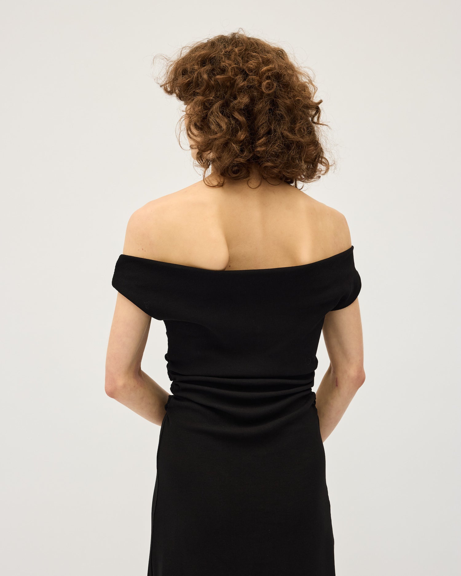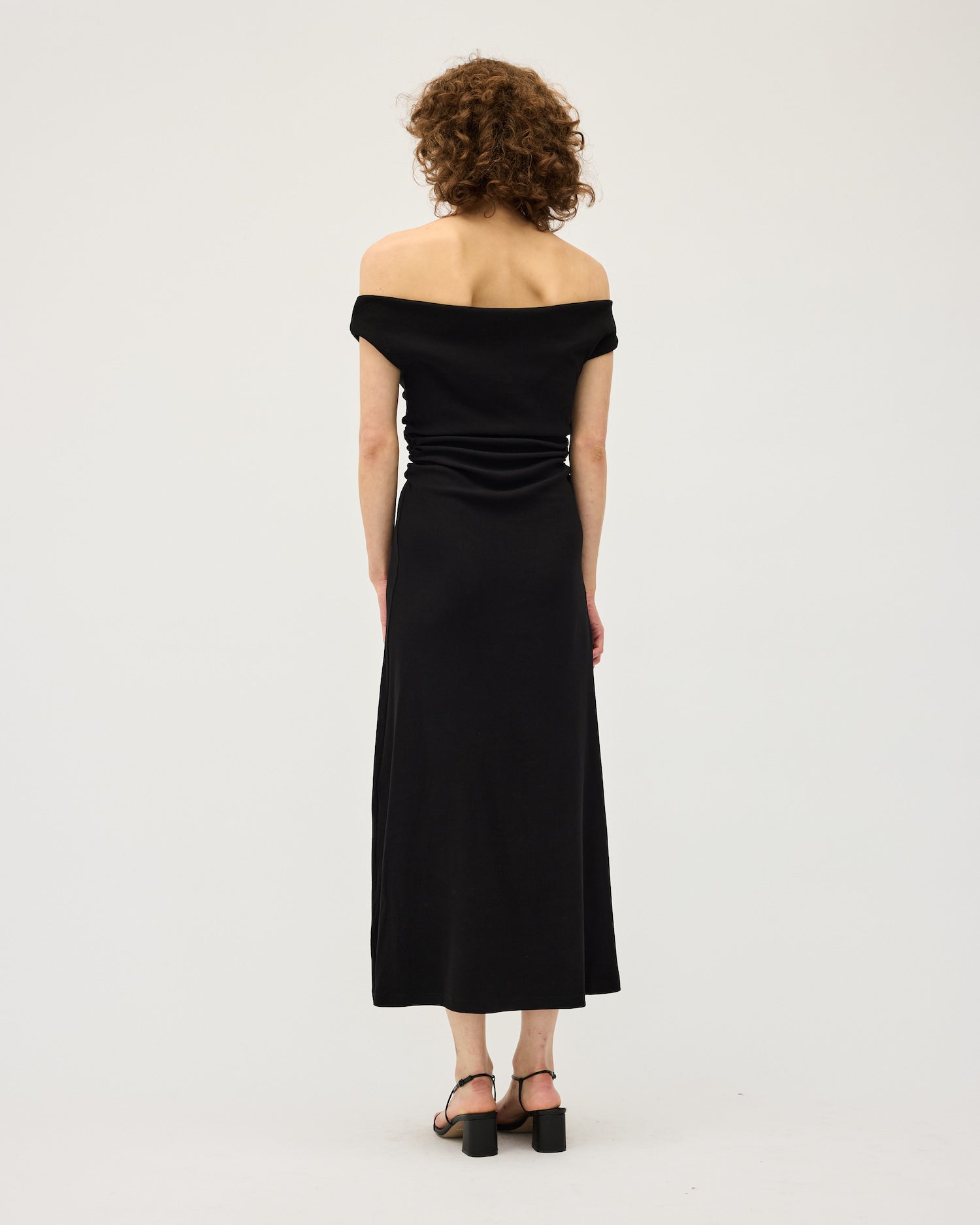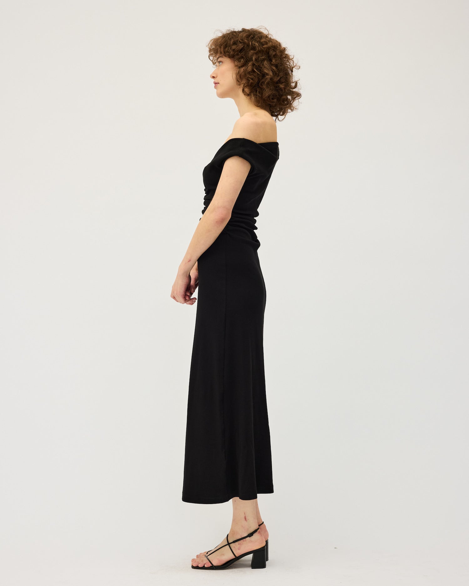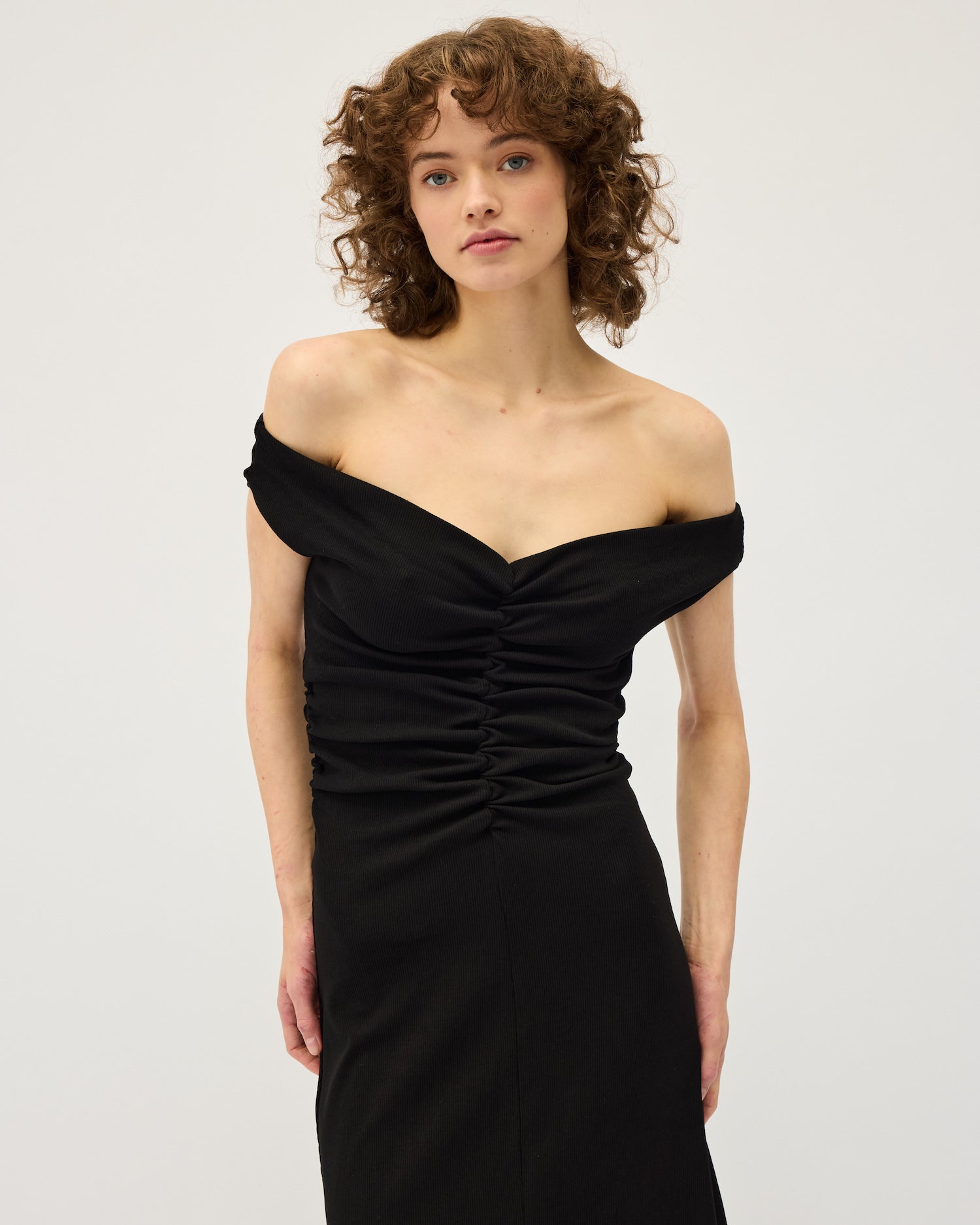 Our Niveah Dress sits off the shoulder and features elasticated ruching down the sides and front creating an elegant V neckline to show off the décolletage. Length is midi.