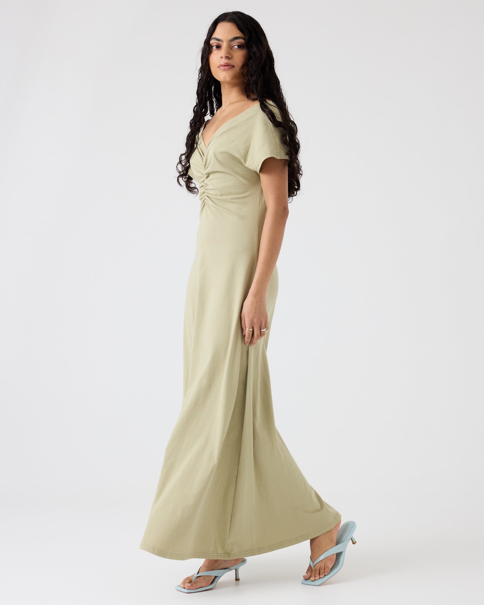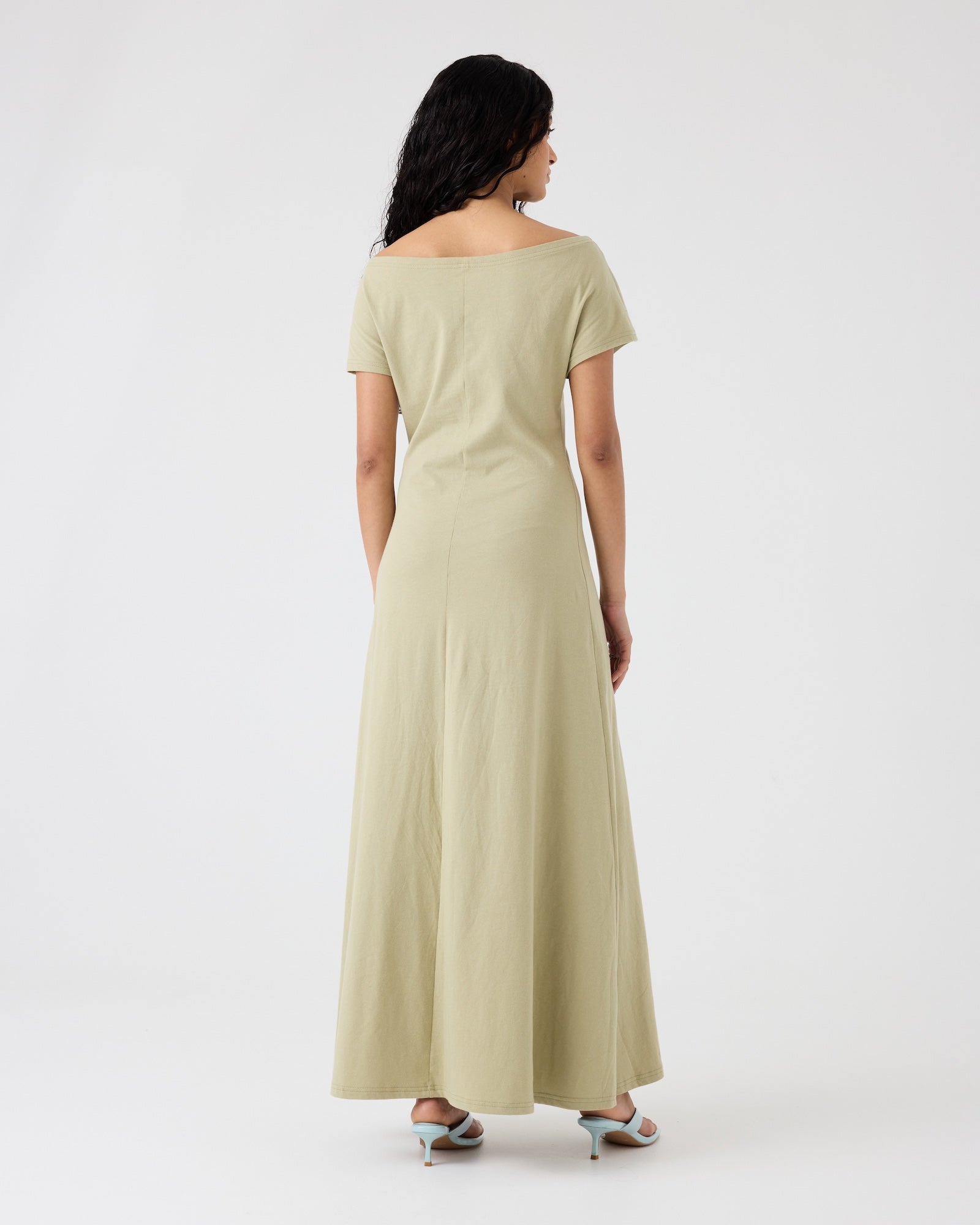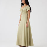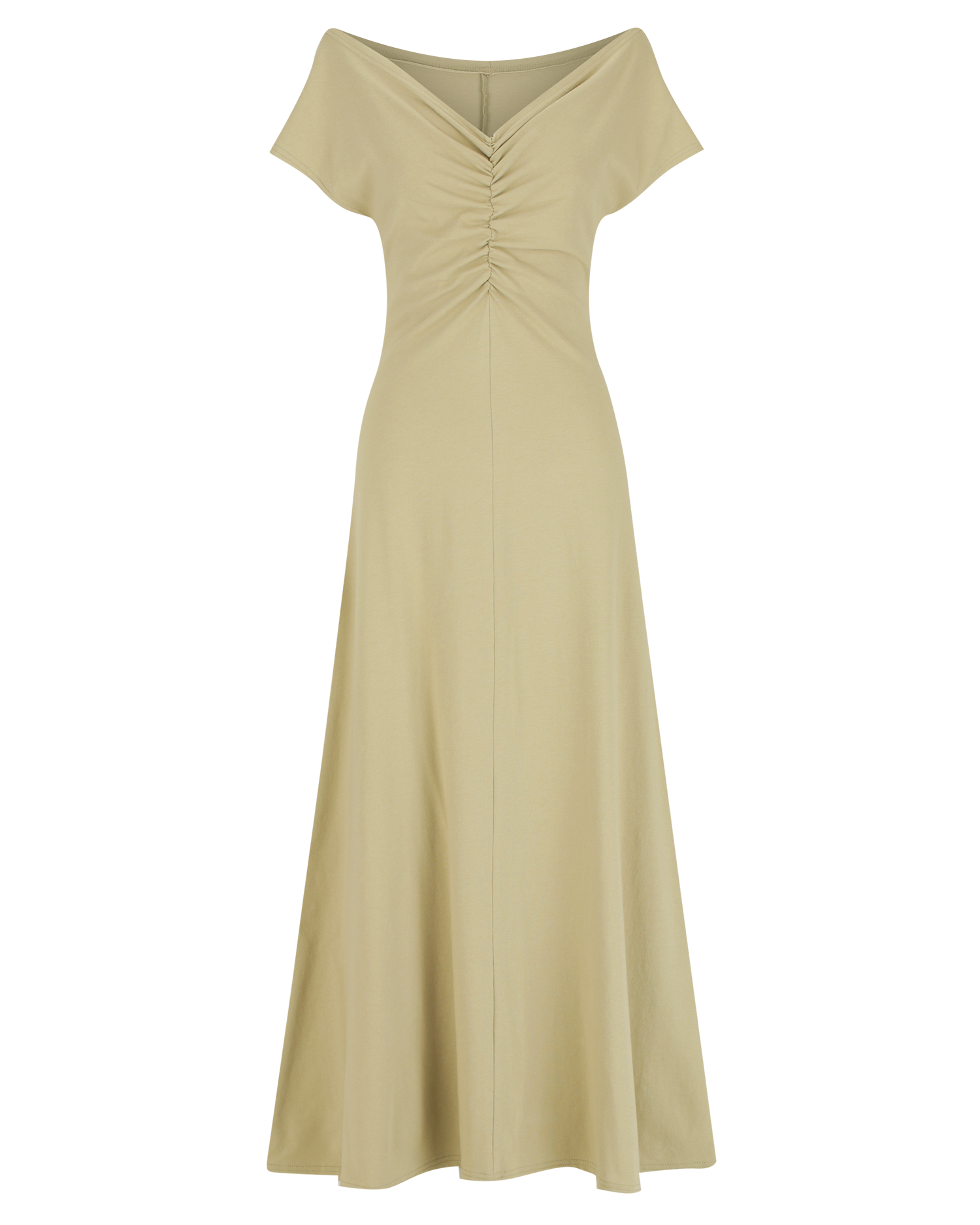 This dress was designed for those who love some of our off the shoulder styles like the Niveah but don't want to be wearing a fitted dress. This style sits right at the edge of the shoulders, featuring elasticated ruching down the centre front, skims in under the bust, sitting close to the body but not fitted. Sits just above the ankle.