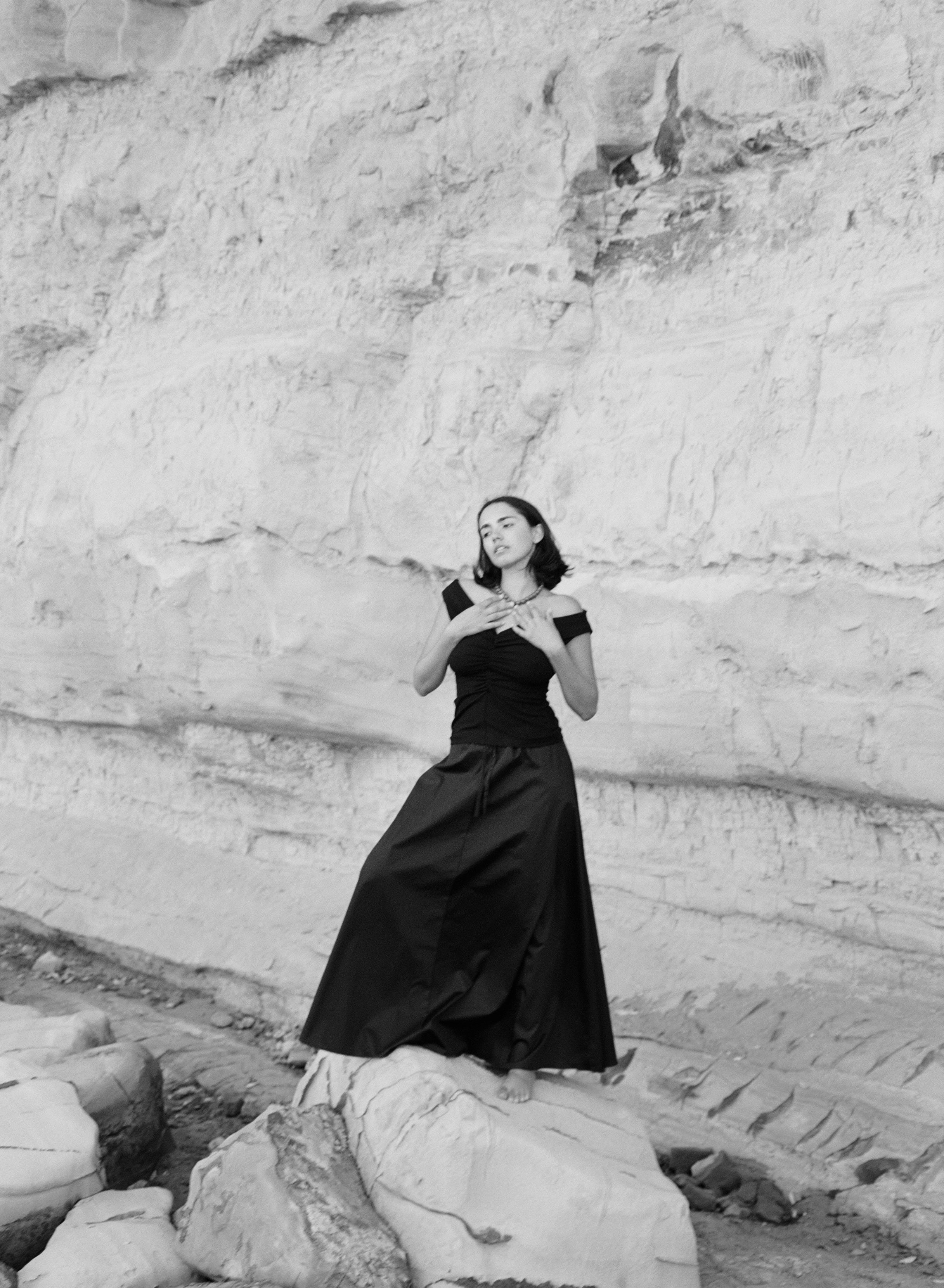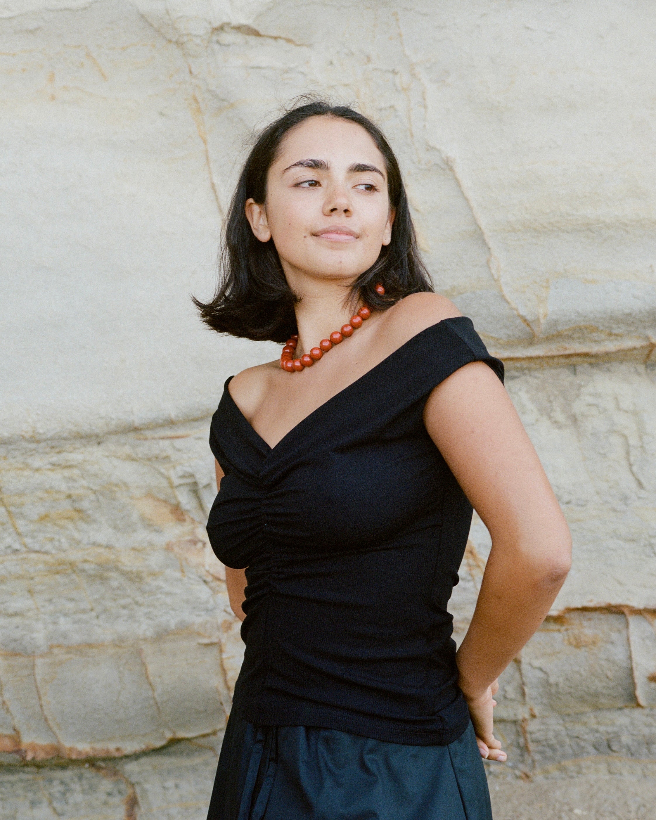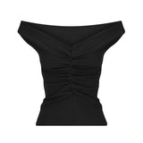 Our Niveah Tee sits off the shoulder and features elasticated ruching down the front creating an elegant V neckline to show off the décolletage.