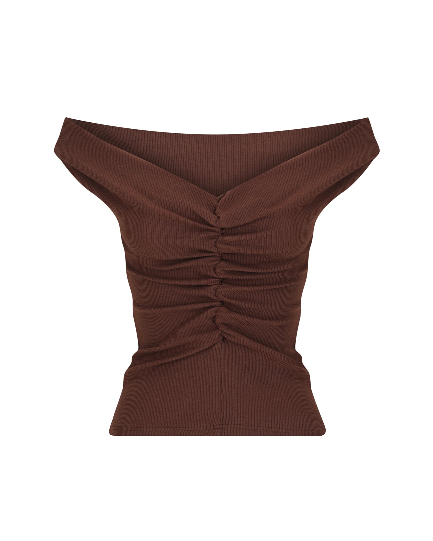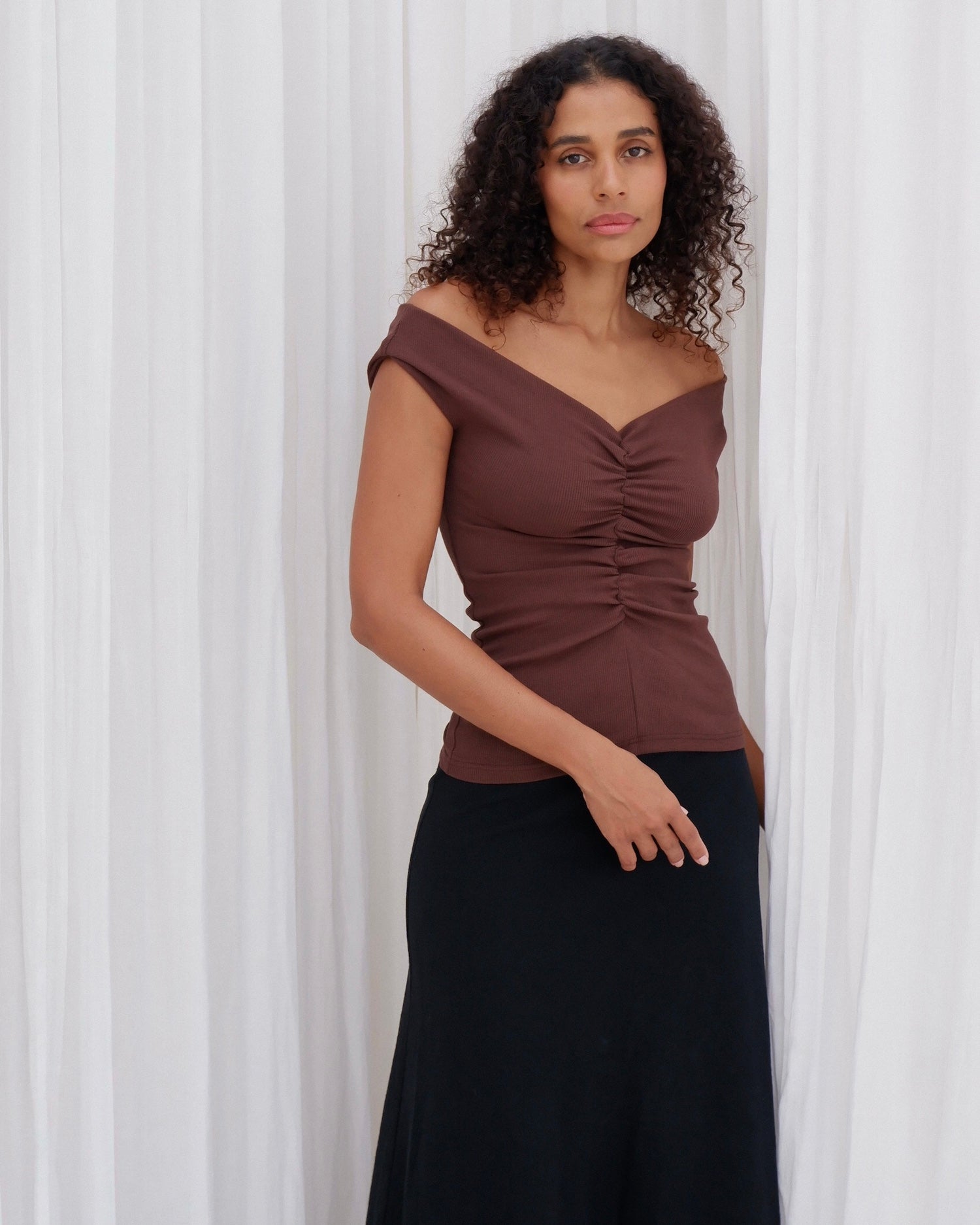 Our Niveah Tee sits off the shoulder and features elasticated ruching down the front creating an elegant V neckline to show off the décolletage.