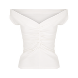 Our Niveah Tee sits off the shoulder and features elasticated ruching down the front creating an elegant V neckline to show off the décolletage.