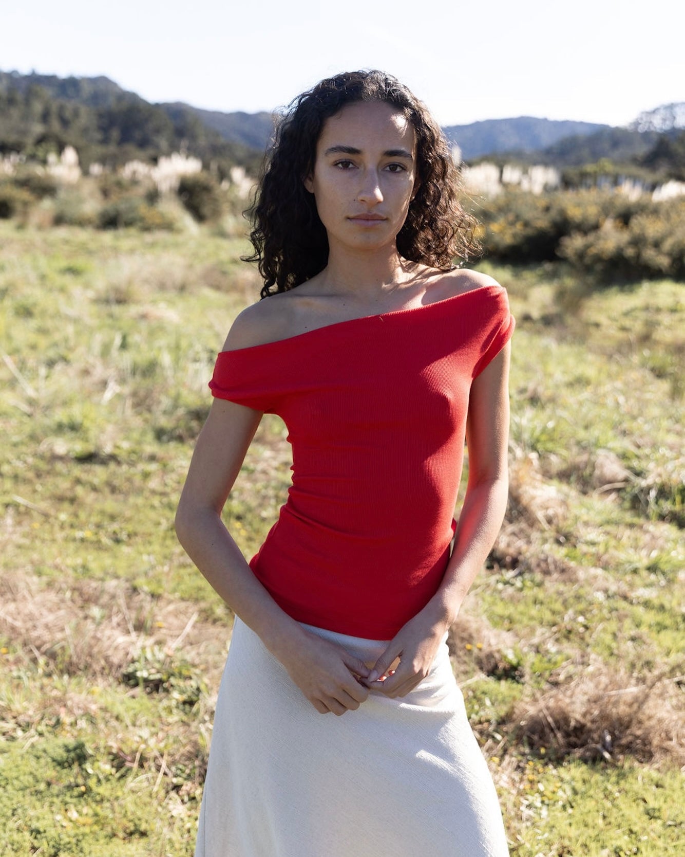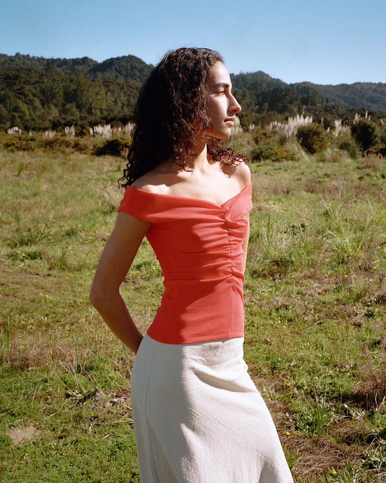 Our Niveah Tee sits off the shoulder and features elasticated ruching down the front creating an elegant V neckline to show off the décolletage.