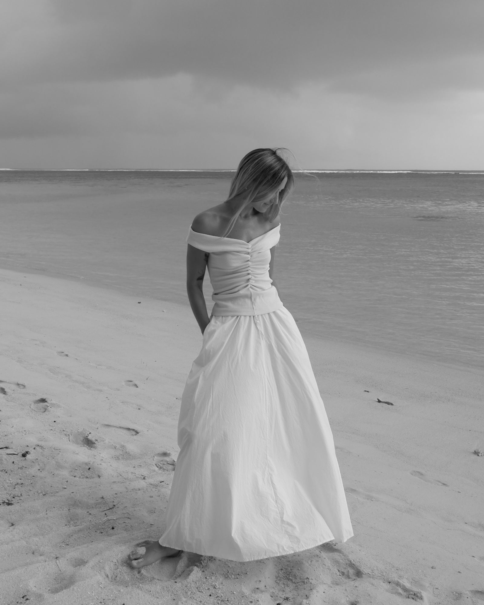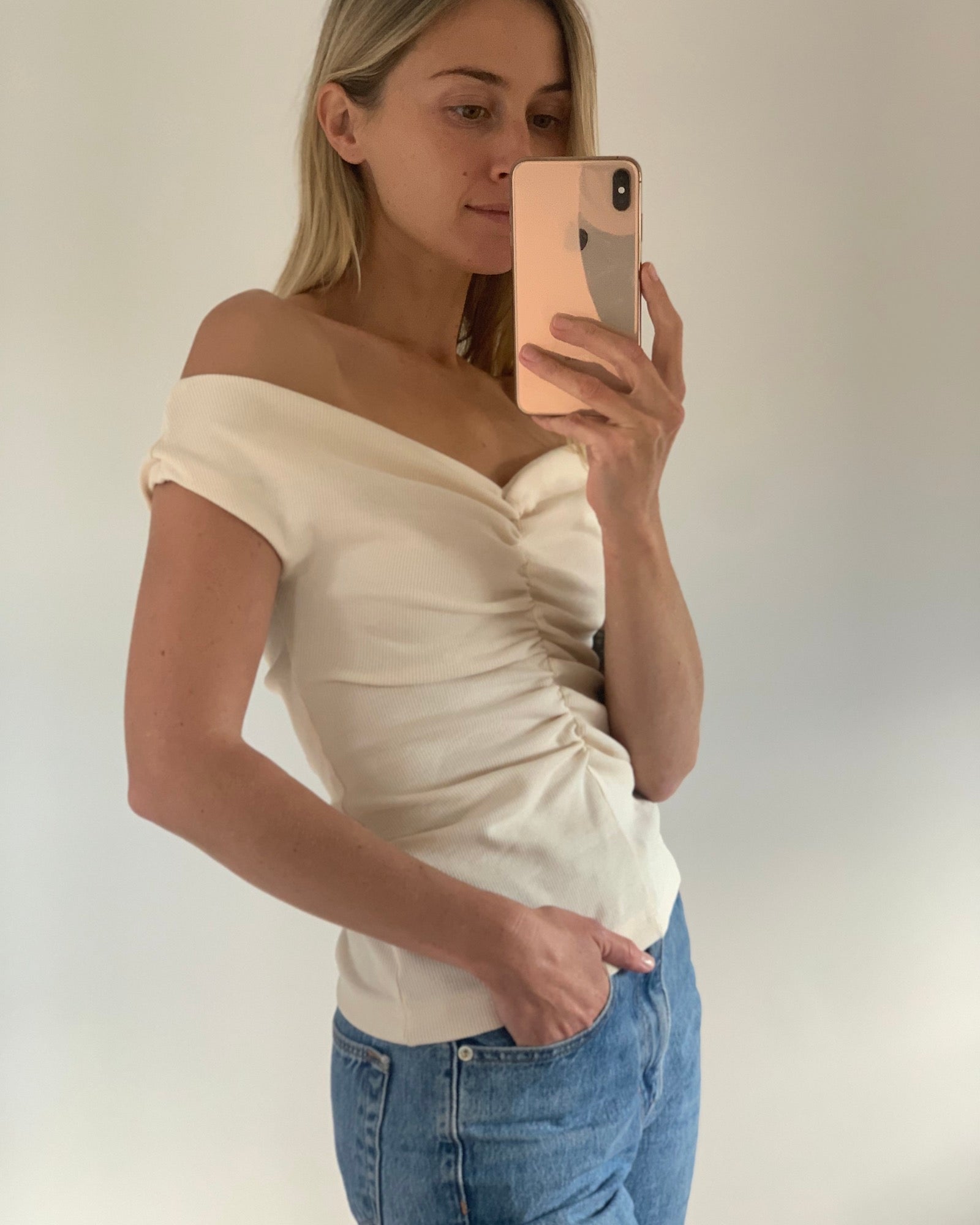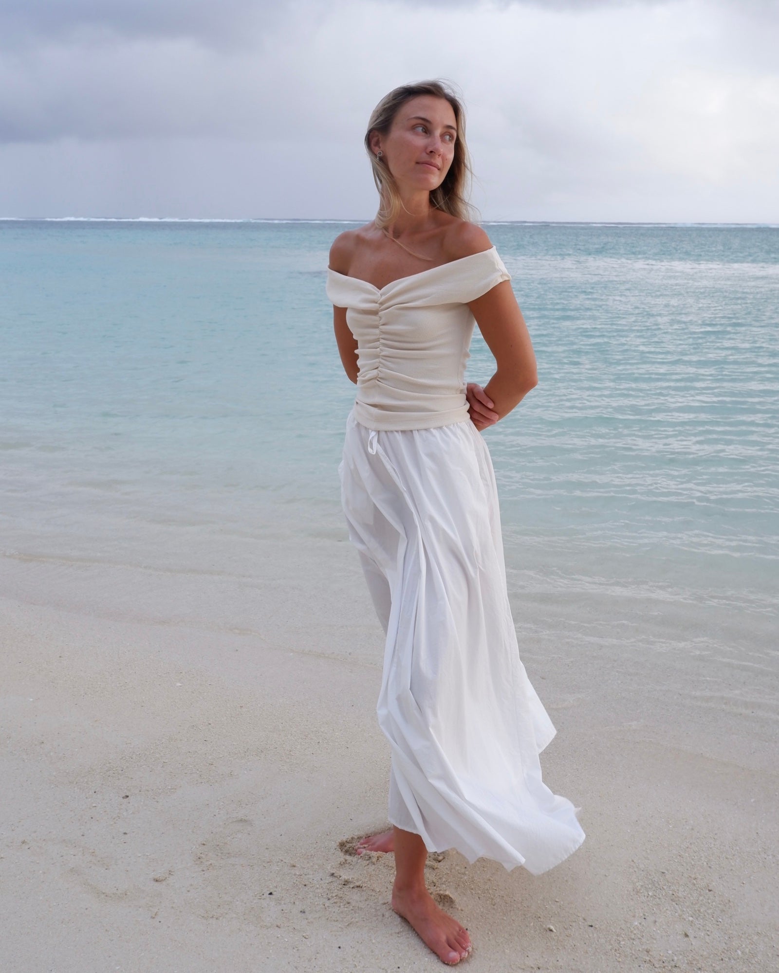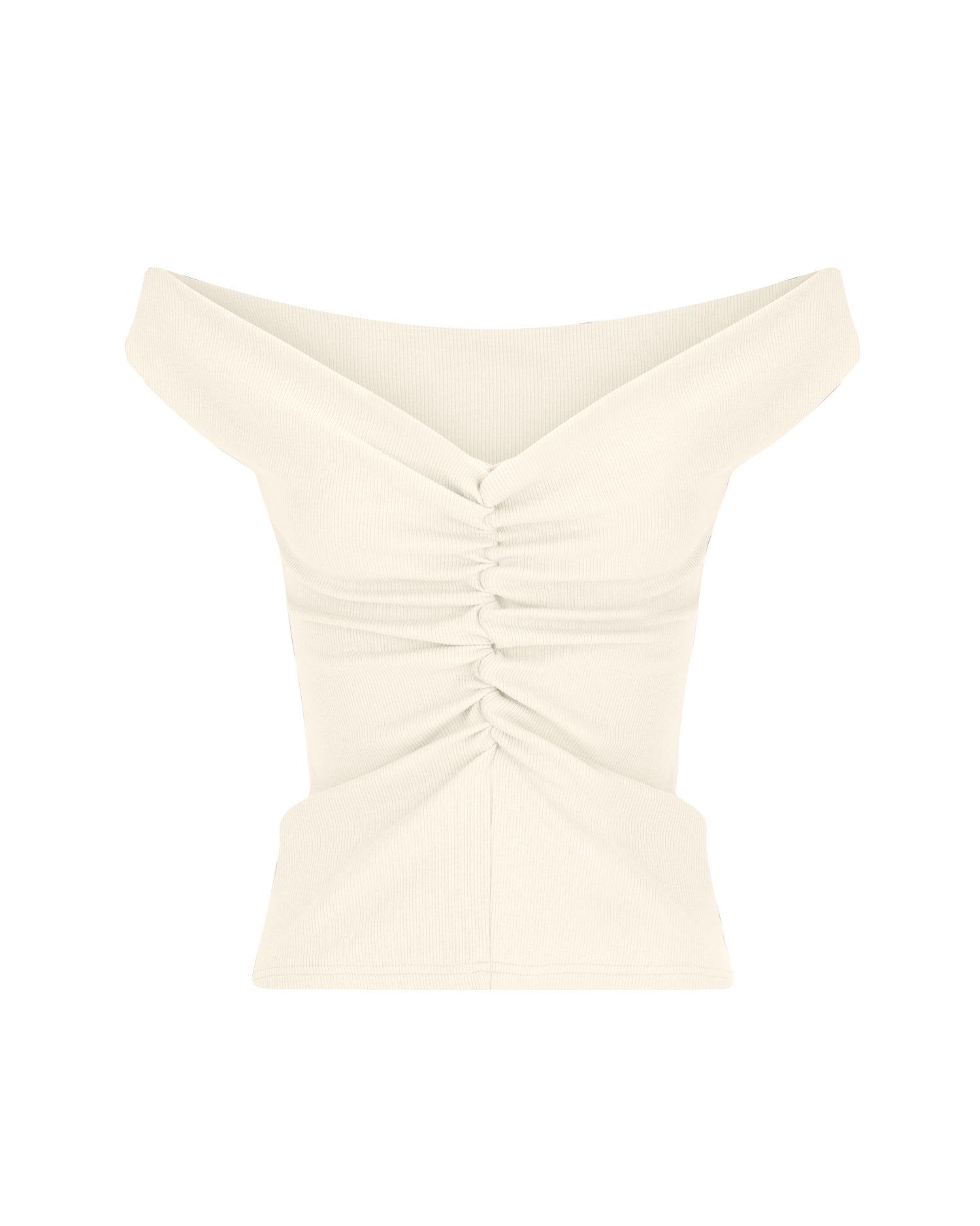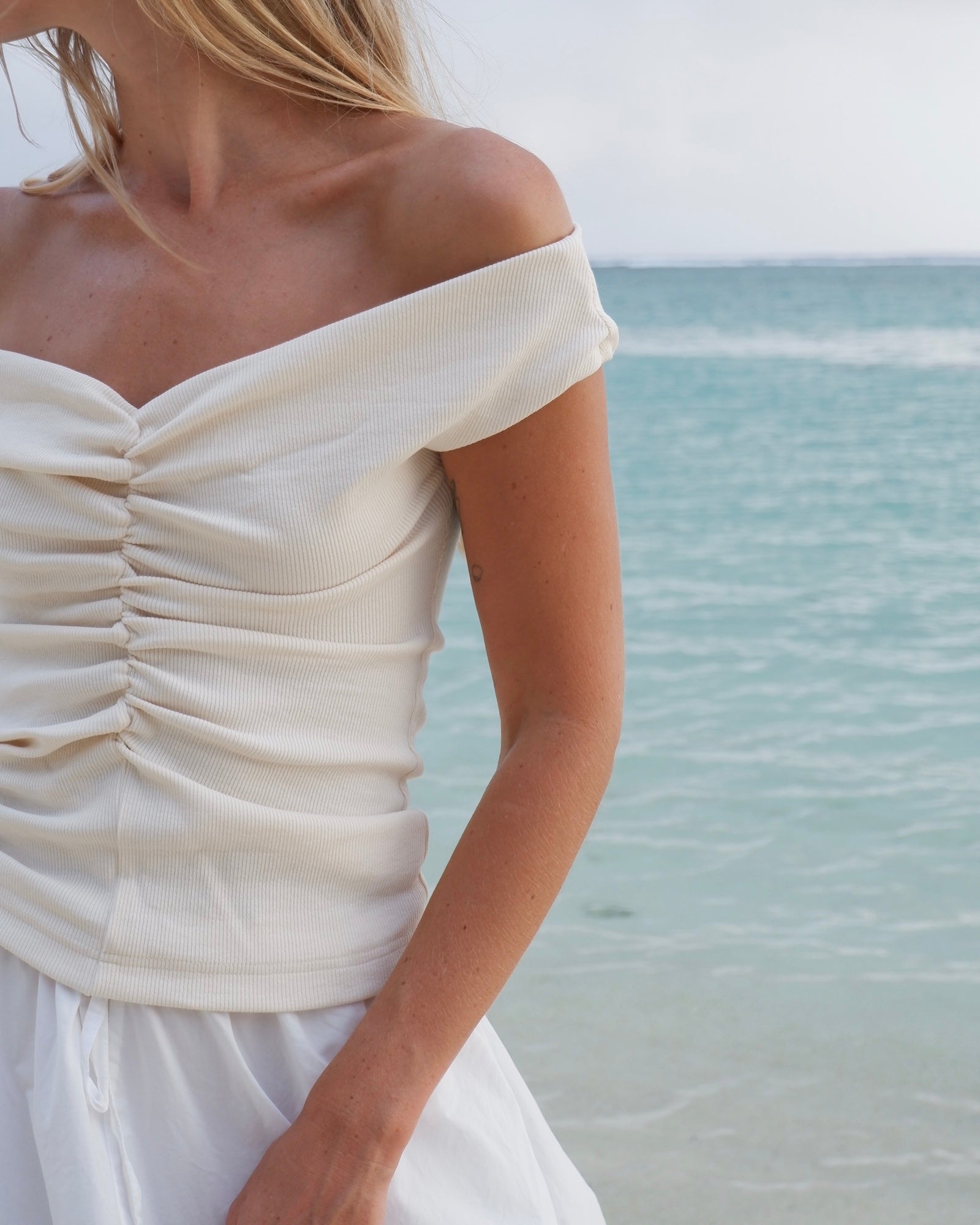 Our Niveah Tee sits off the shoulder and features elasticated ruching down the front creating an elegant V neckline to show off the décolletage.