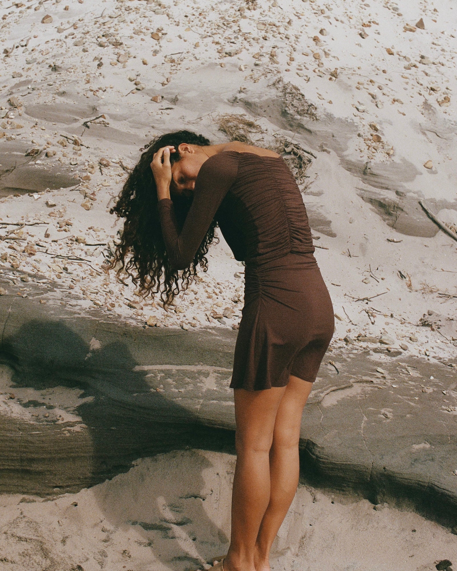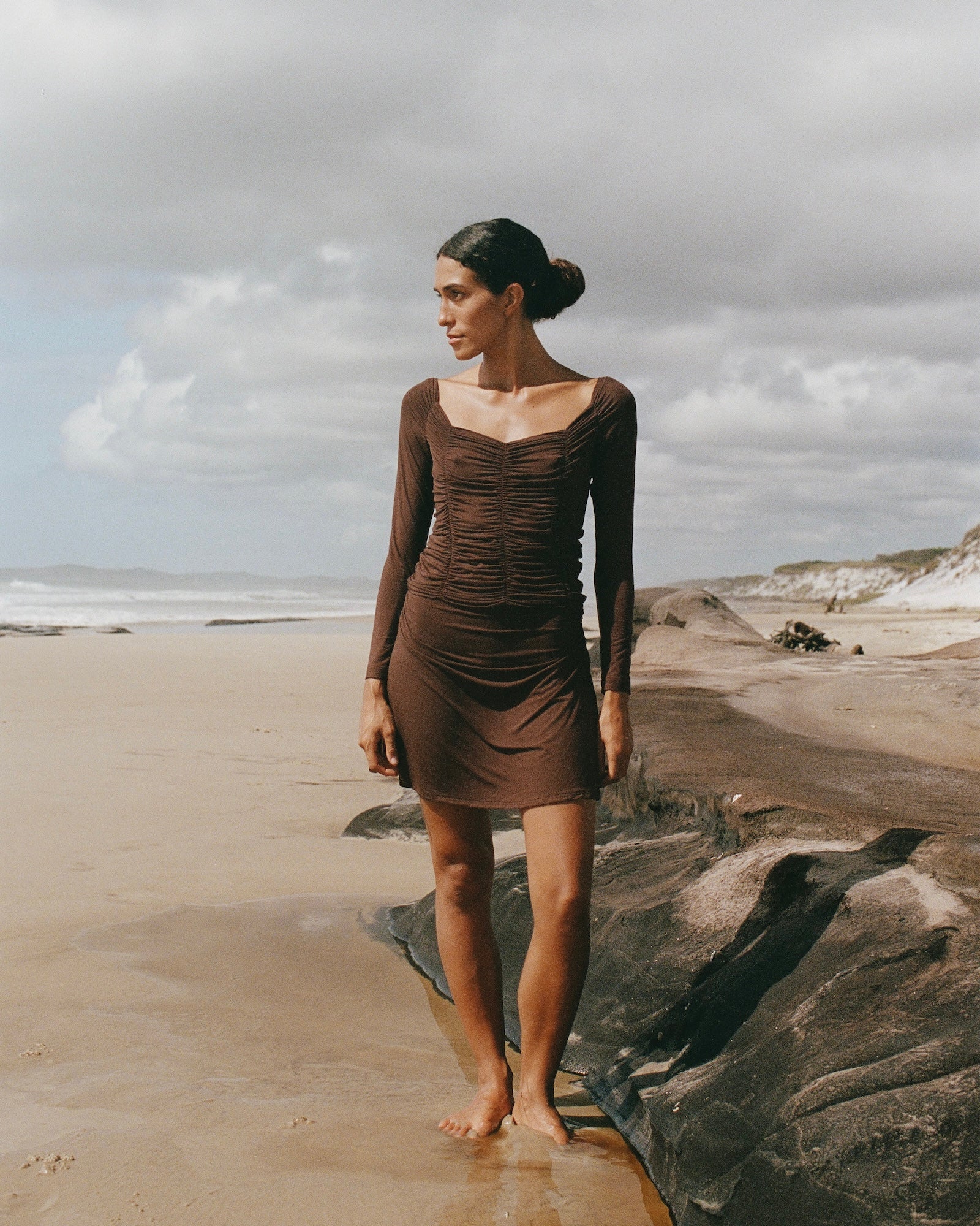 We've designed this style to be worn on its own or mixed and matched with a variety of our tops to create a full look. Pictured here with our Jolene Longsleeve Tee also in Espresso.