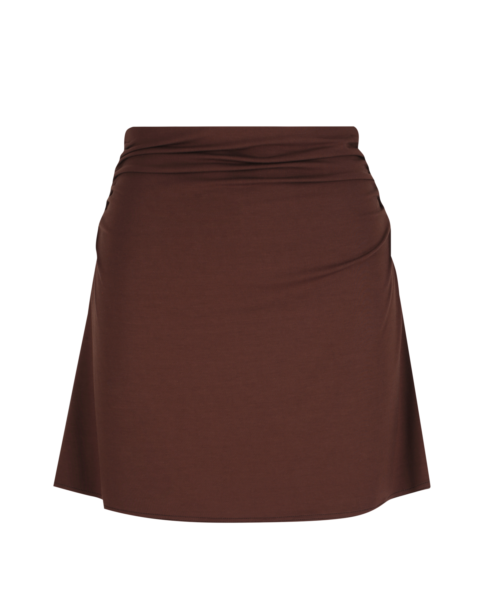 Olympia Mini-Skirt; the newest addition to our wardrobe staples. A soft jersey skirt featuring elasticised waist, ruching down the sides before swinging out into a flattering a-line. Length is Mini.