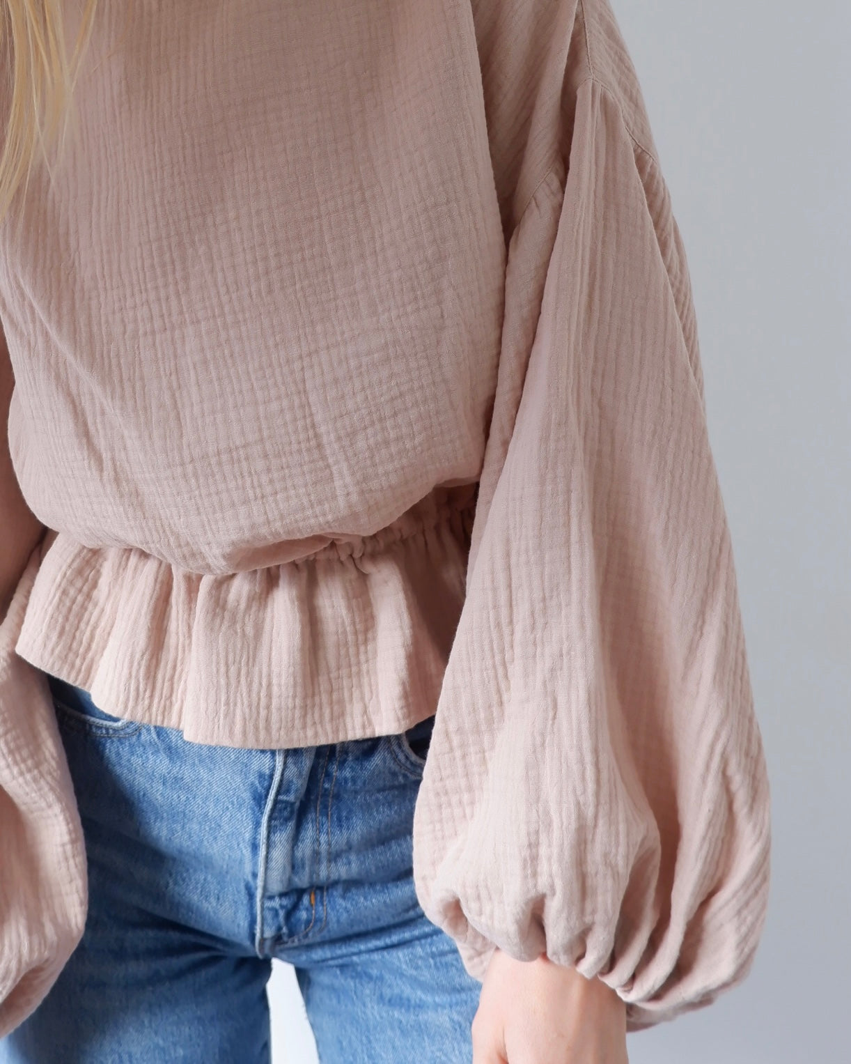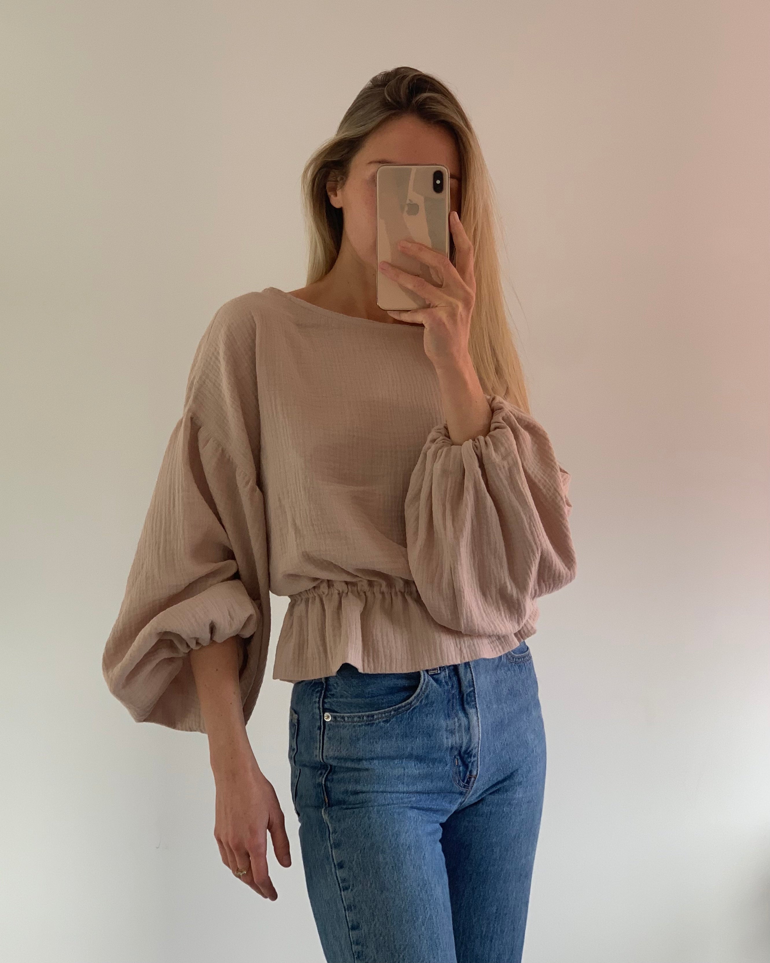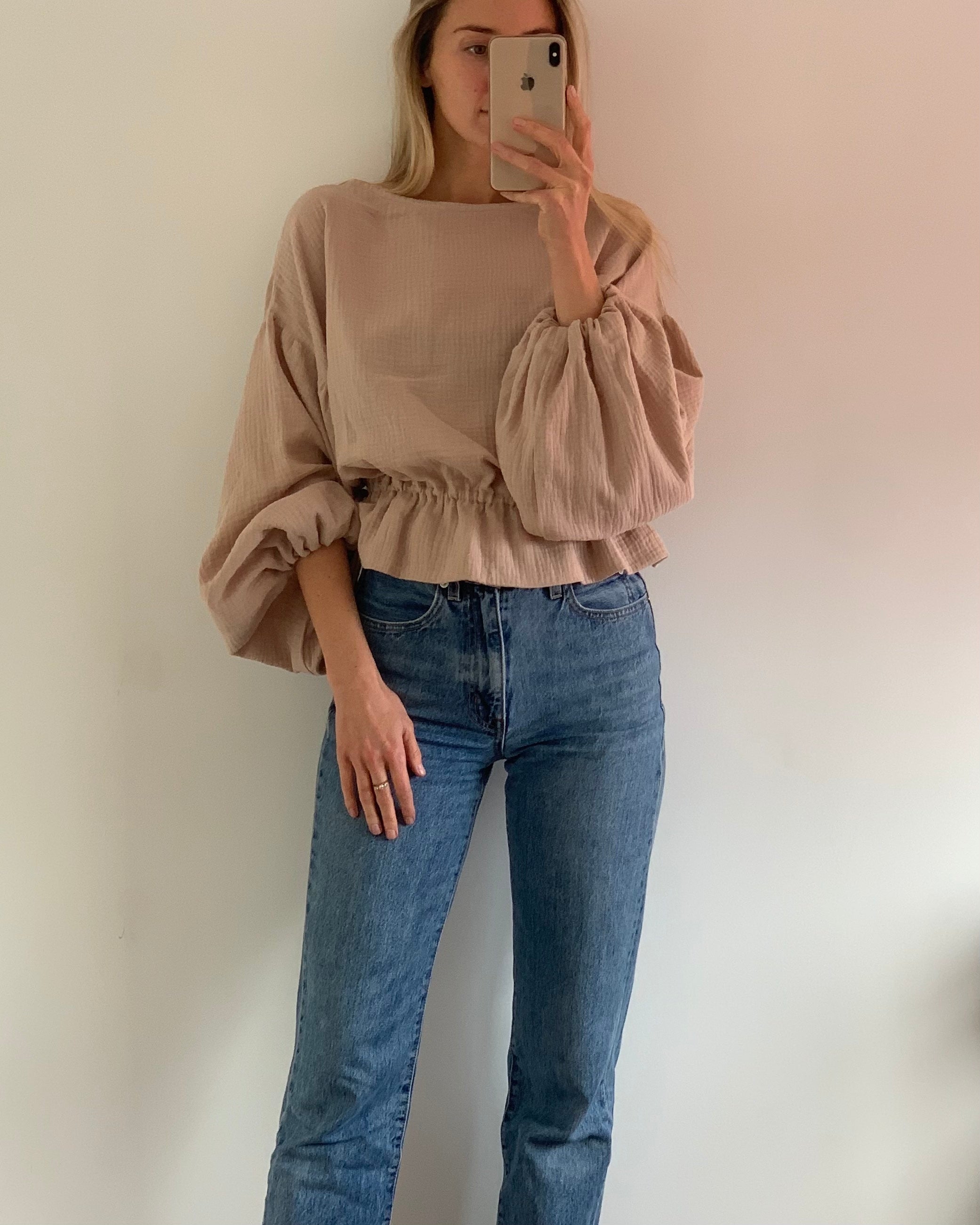 One of our DH classic shapes, the Bella Frill Blouse features oversized sleeves gathered into wrists with soft elastic for comfort and versatility. The sleeves are full length and can be pushed up as pictured, rolled or worn long. This style is designed to be oversized and is brought in at waist with soft elastic creating a frill effect. Comfortable and easy to wear year round.