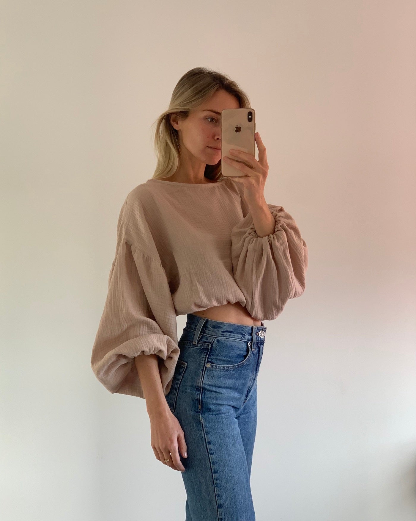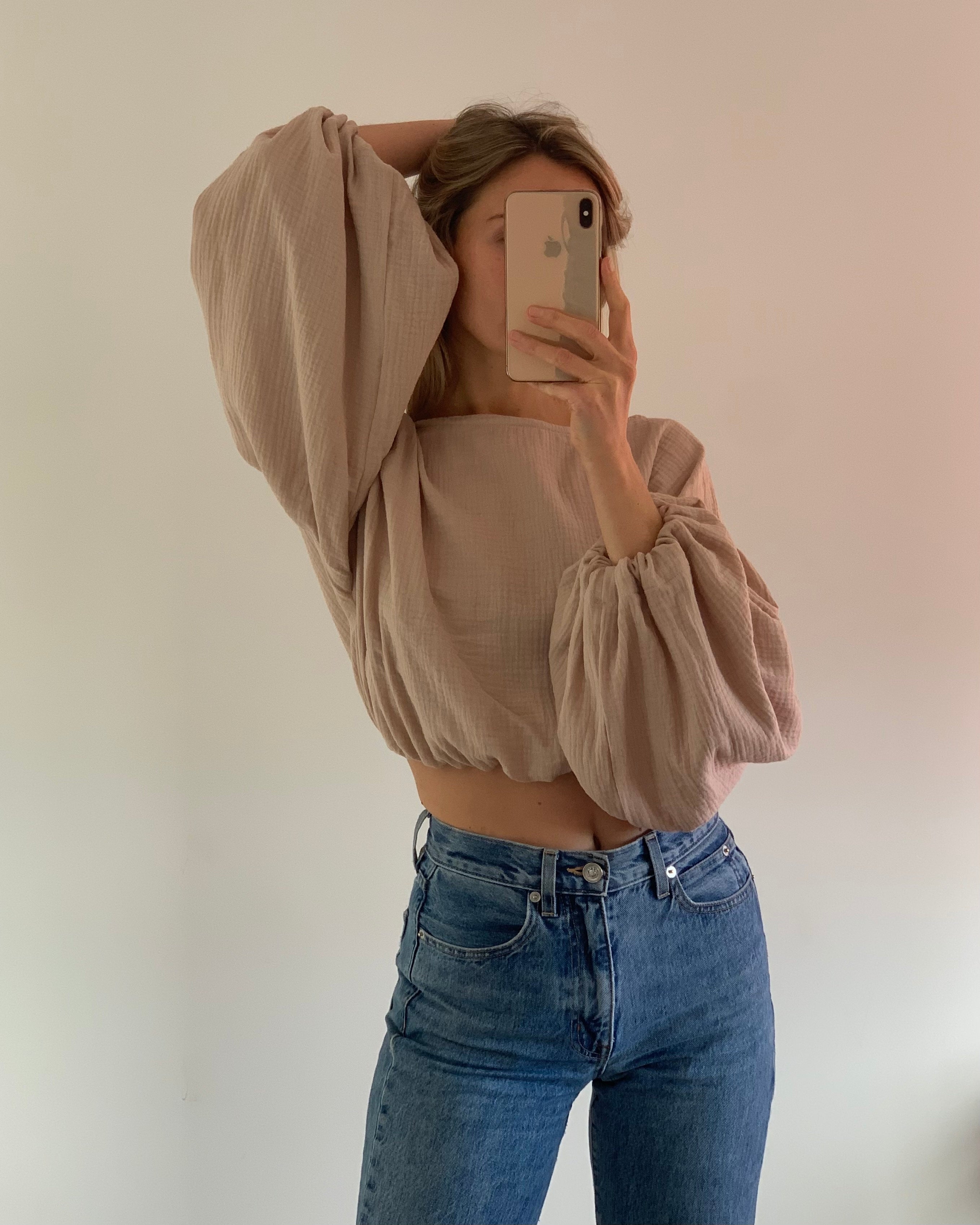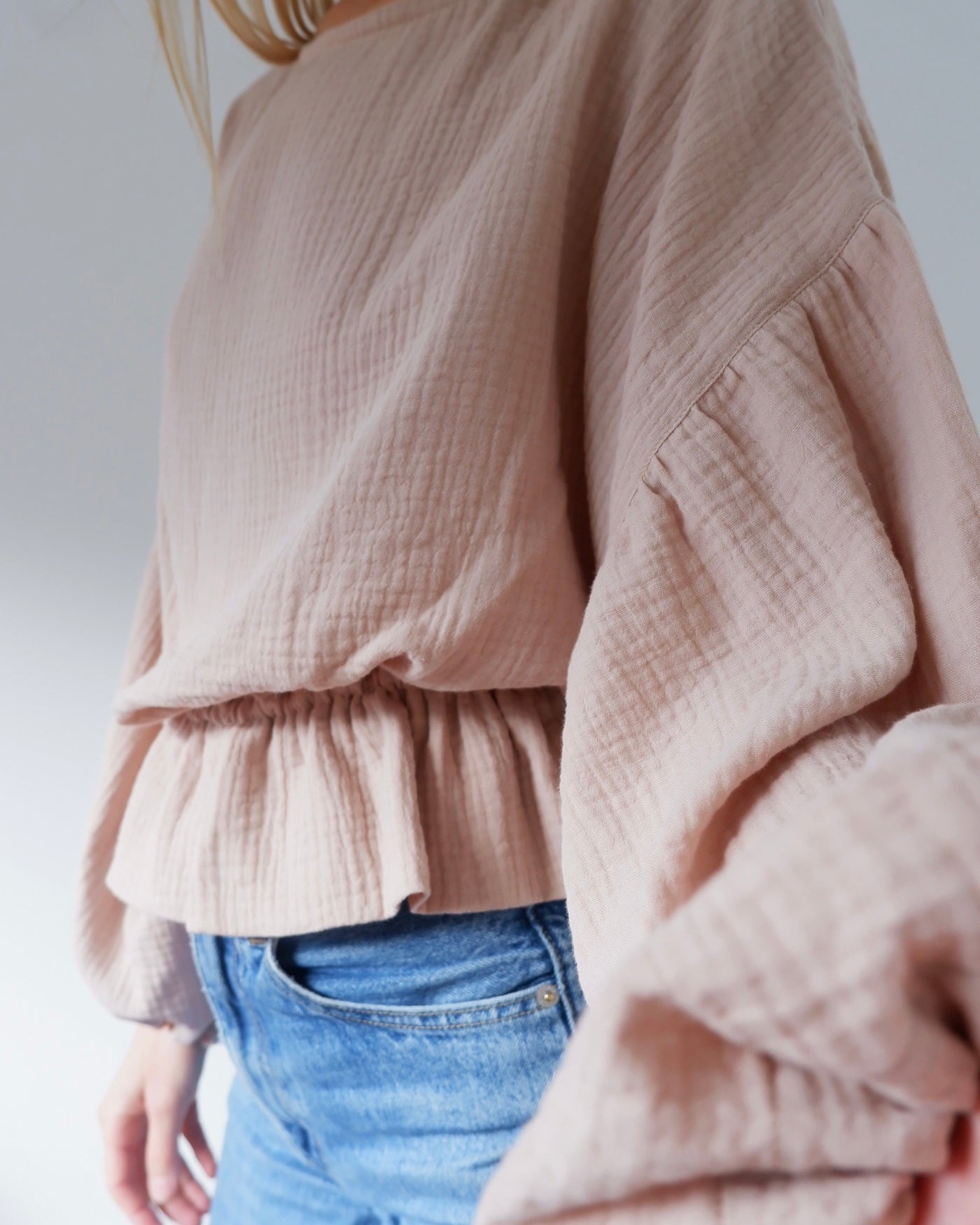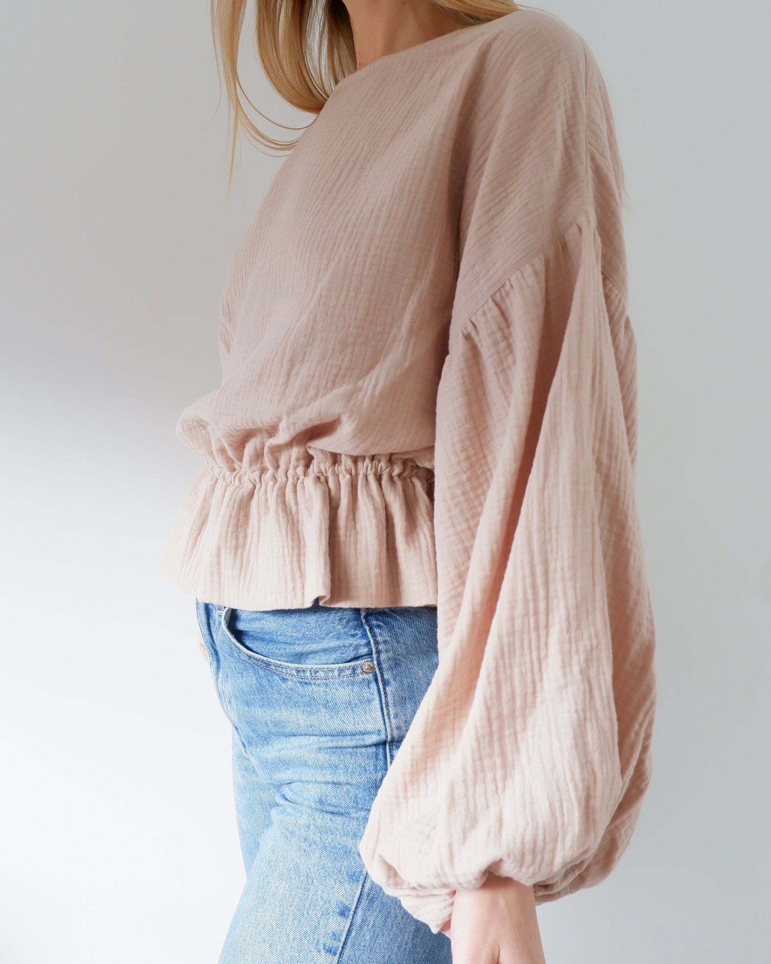 One of our DH classic shapes, the Bella Frill Blouse features oversized sleeves gathered into wrists with soft elastic for comfort and versatility. The sleeves are full length and can be pushed up as pictured, rolled or worn long. This style is designed to be oversized and is brought in at waist with soft elastic creating a frill effect. Comfortable and easy to wear year round.