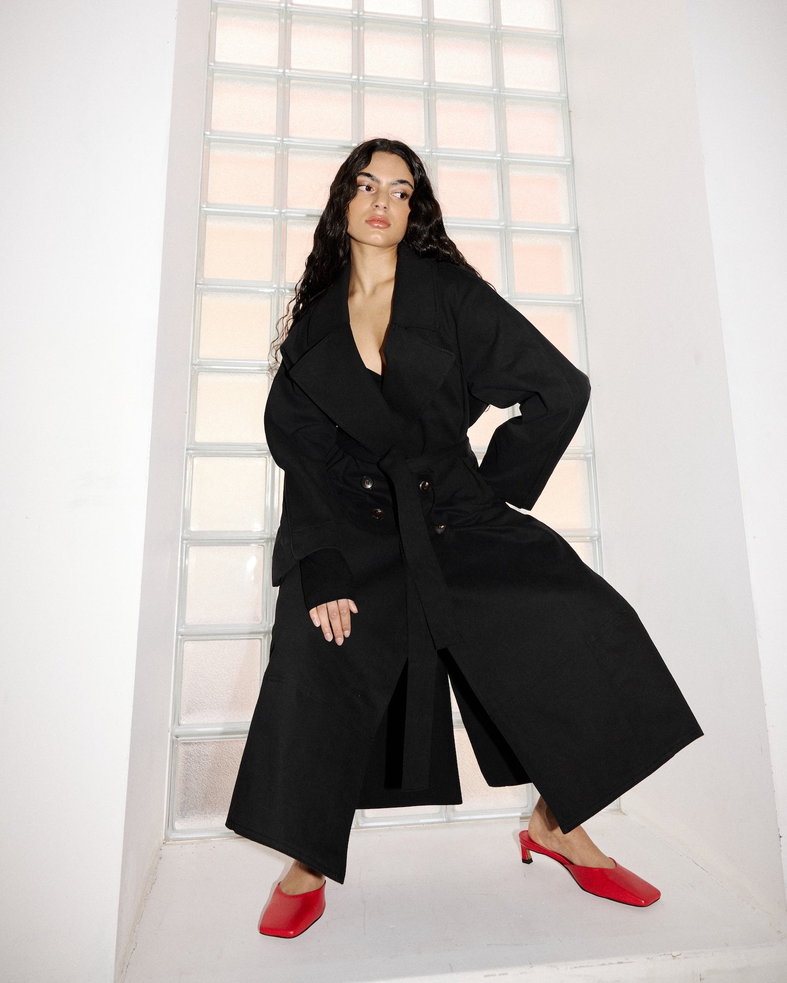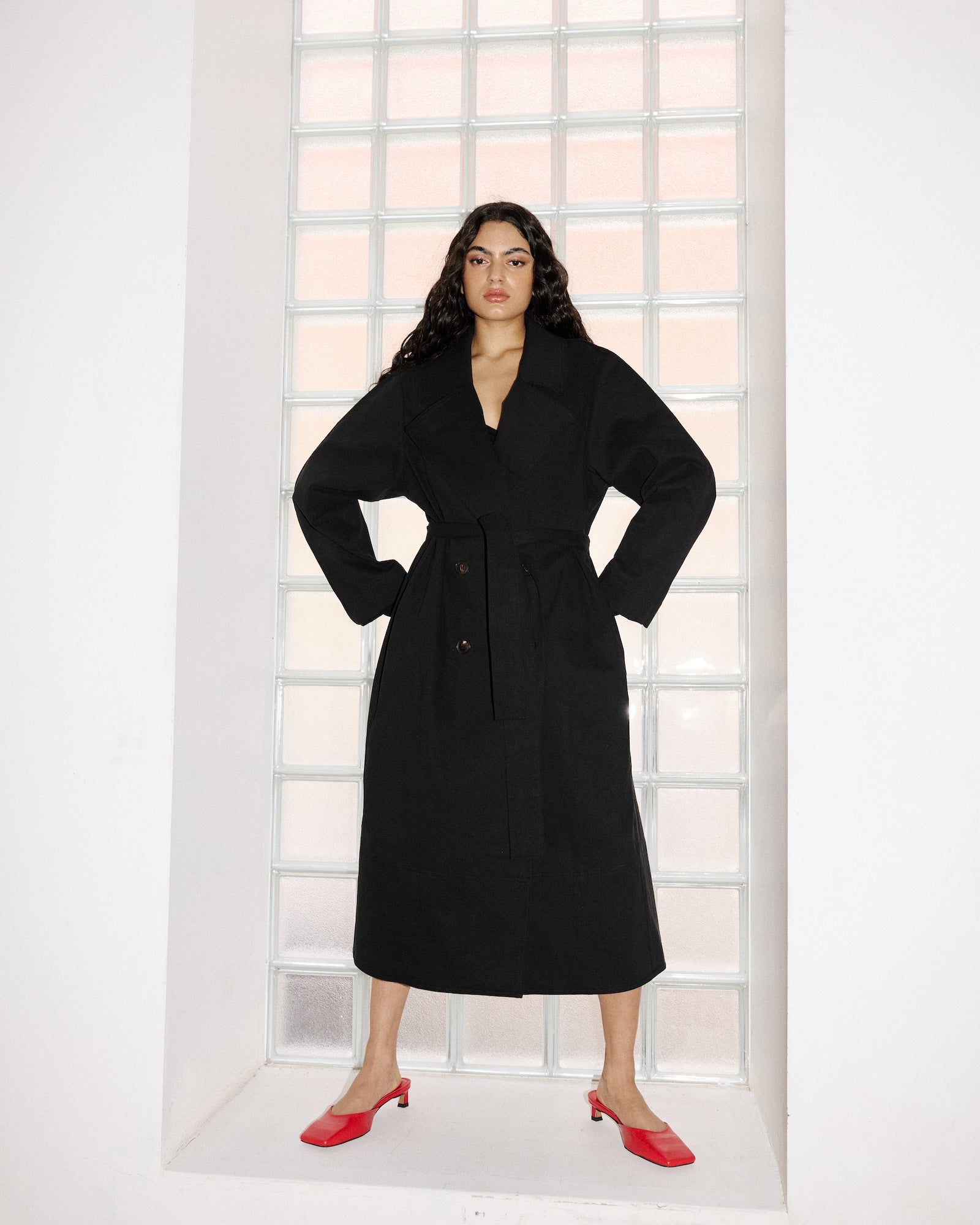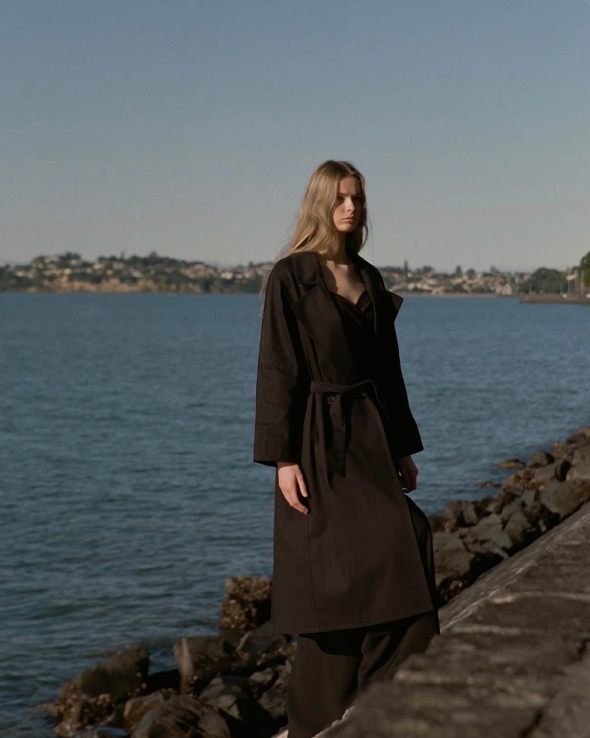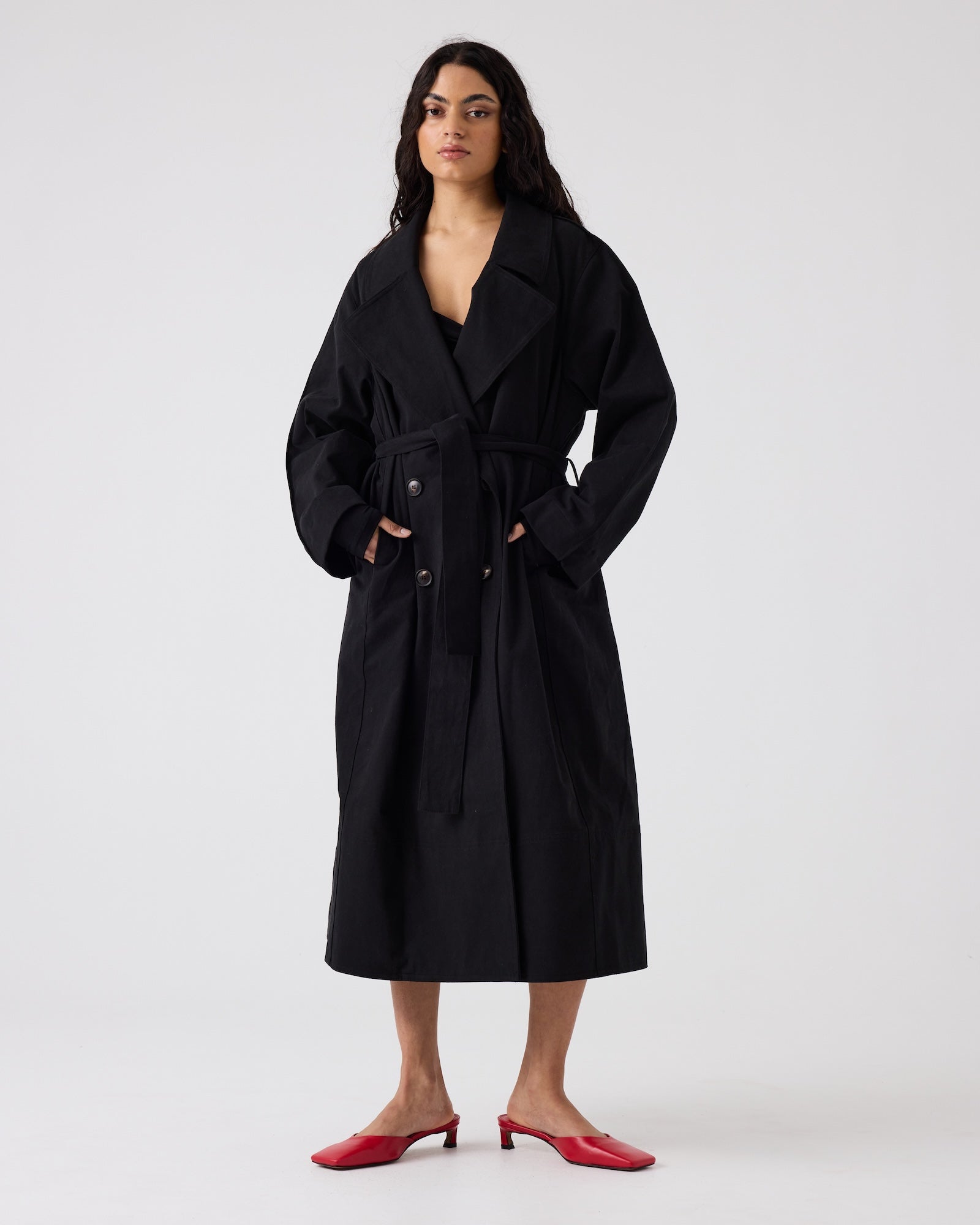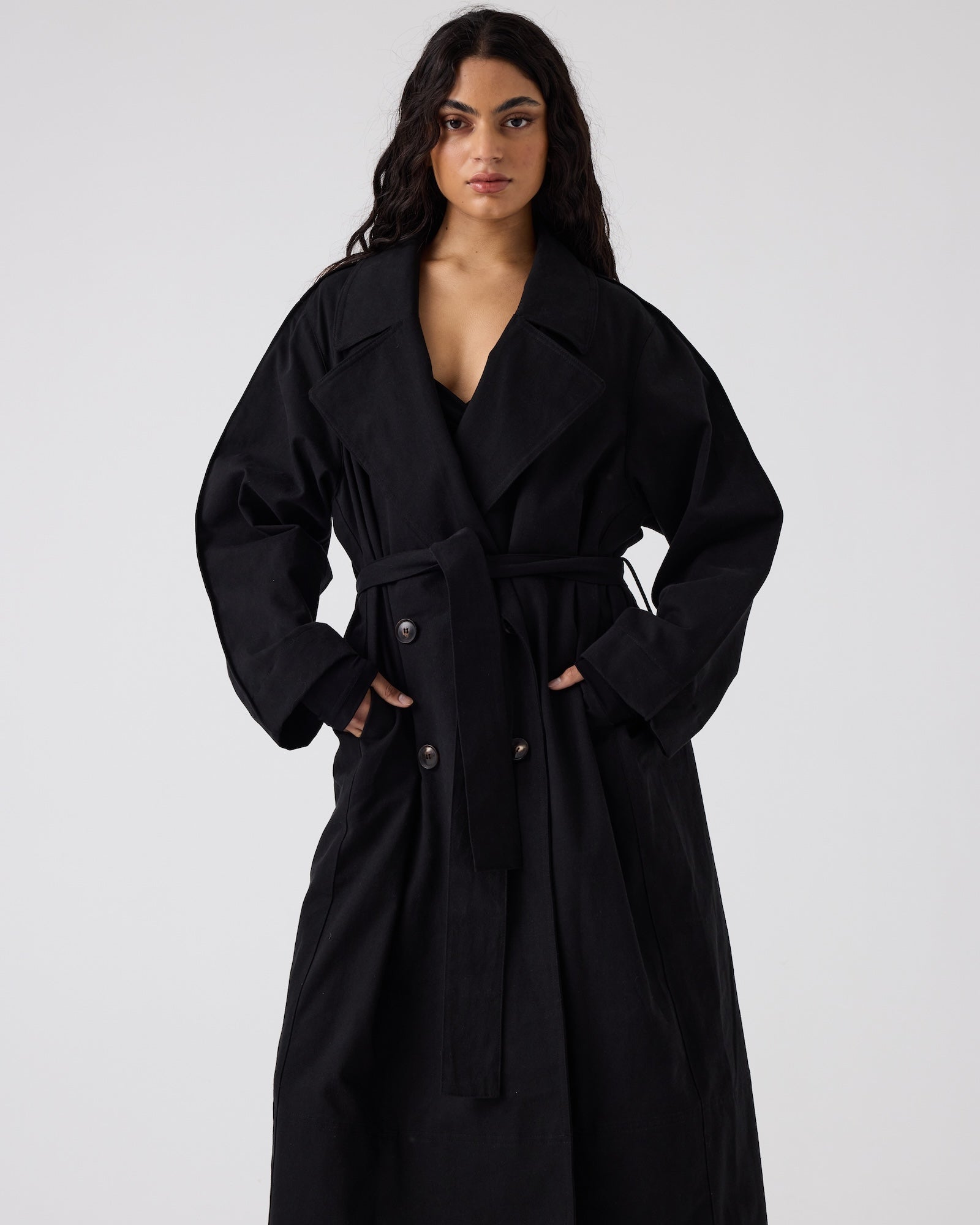 Introducing our very first Trench. A simple classic shape with clean lines and edge stitching detail on sleeves. Features a waist tie and in seam pockets.