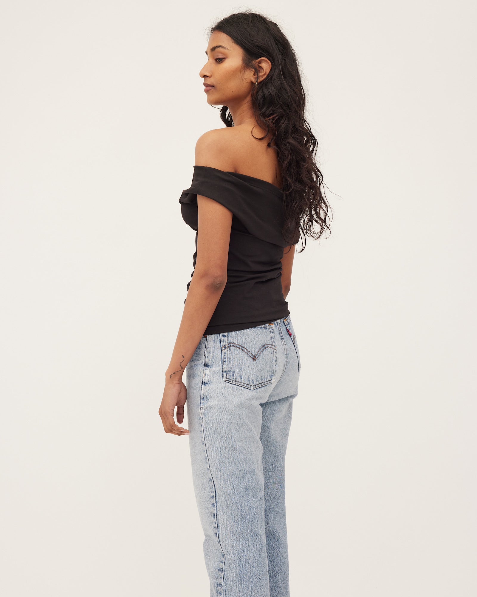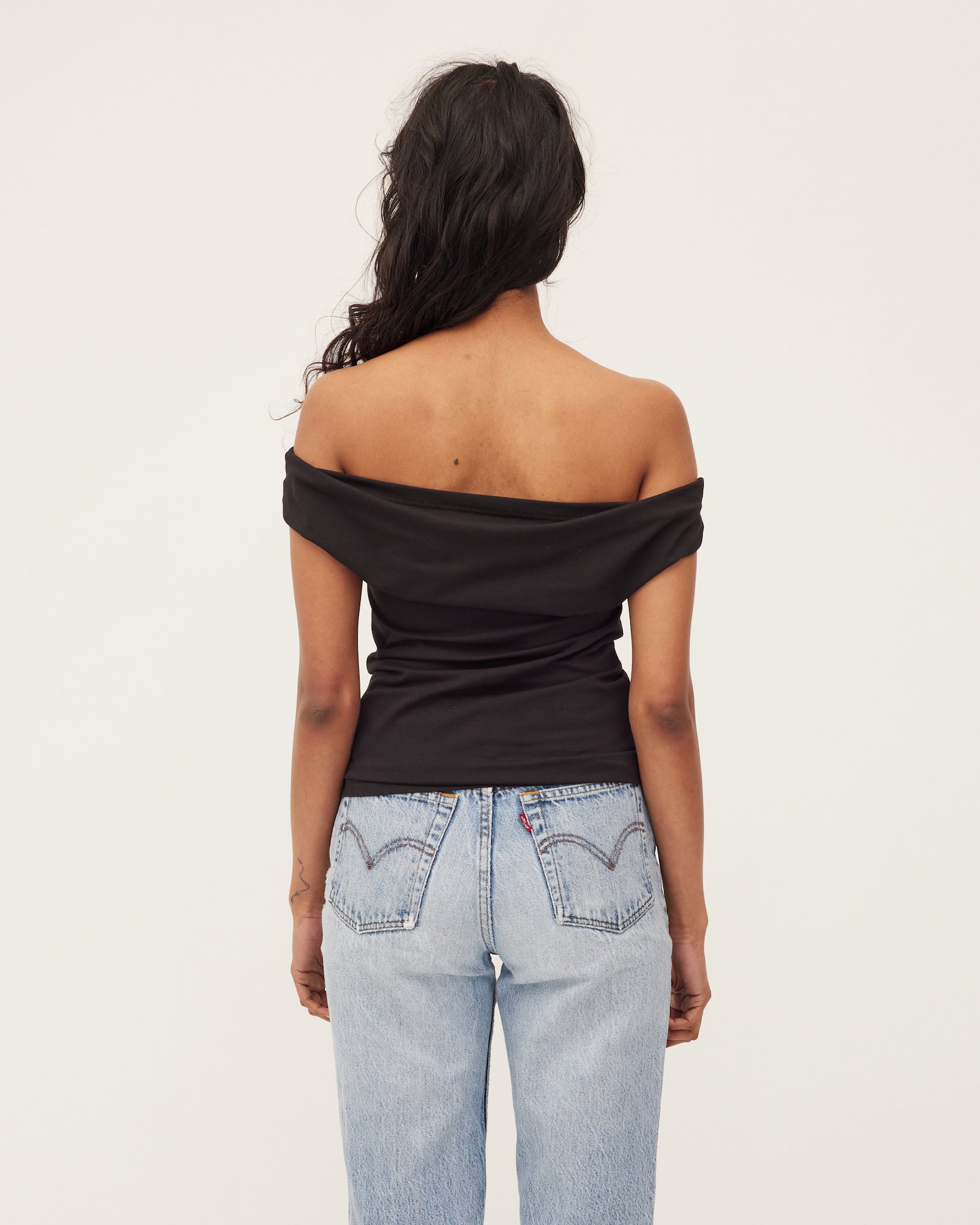 One of our staple wardrobe pieces: Vera in an organic cotton and elastane blend. Featuring off the shoulder neckline to show off your décolletage, perfect paired with jeans or a simple pant and skirt. Fabric is breathable and comfortable to wear.