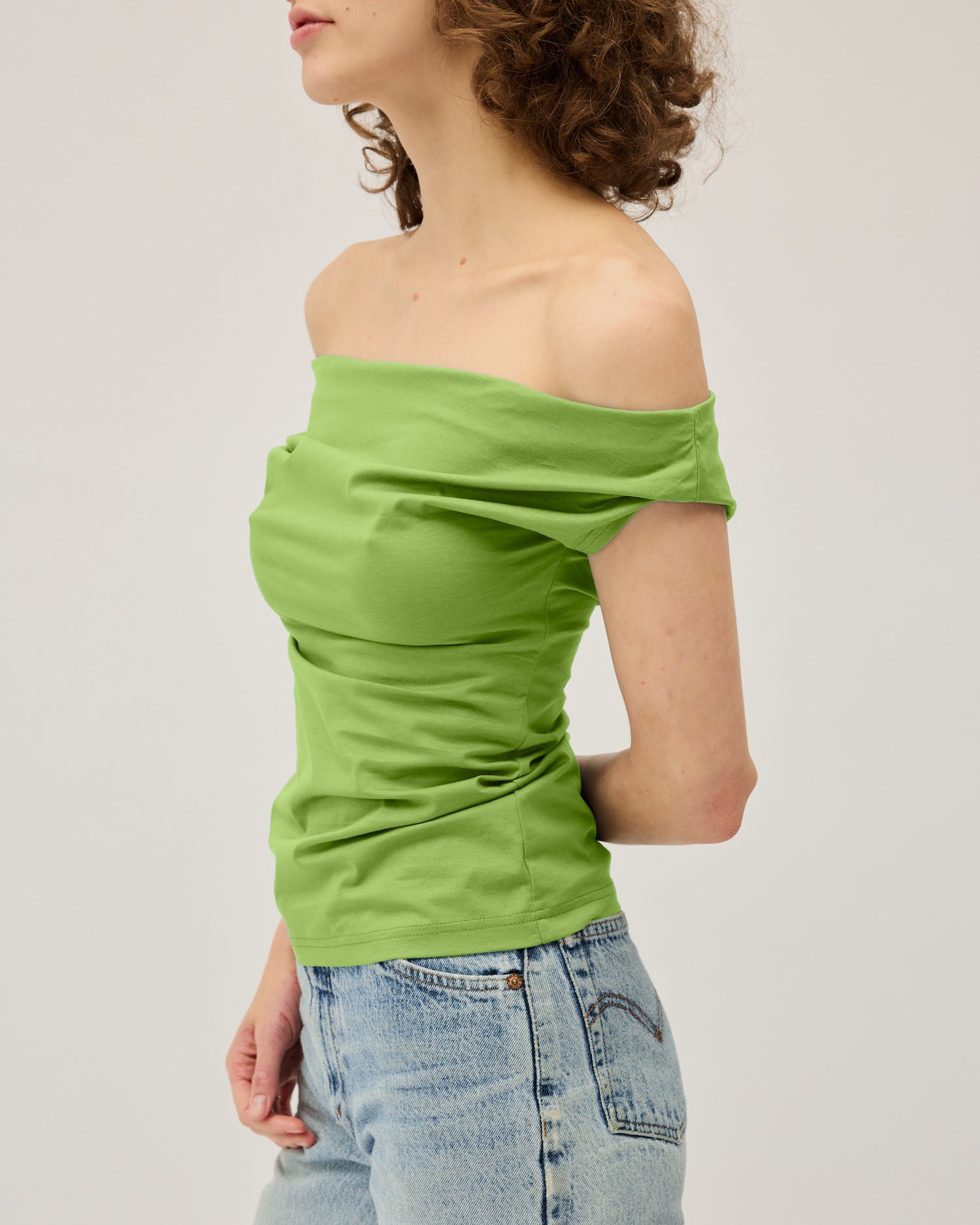 Our Vere Tee features off the shoulder neckline to show off your décolletage, perfect paired with jeans or a simple pant and skirt. Fabric is a beautiful, soft mercerised cotton jersey which has a slight sateen finish.