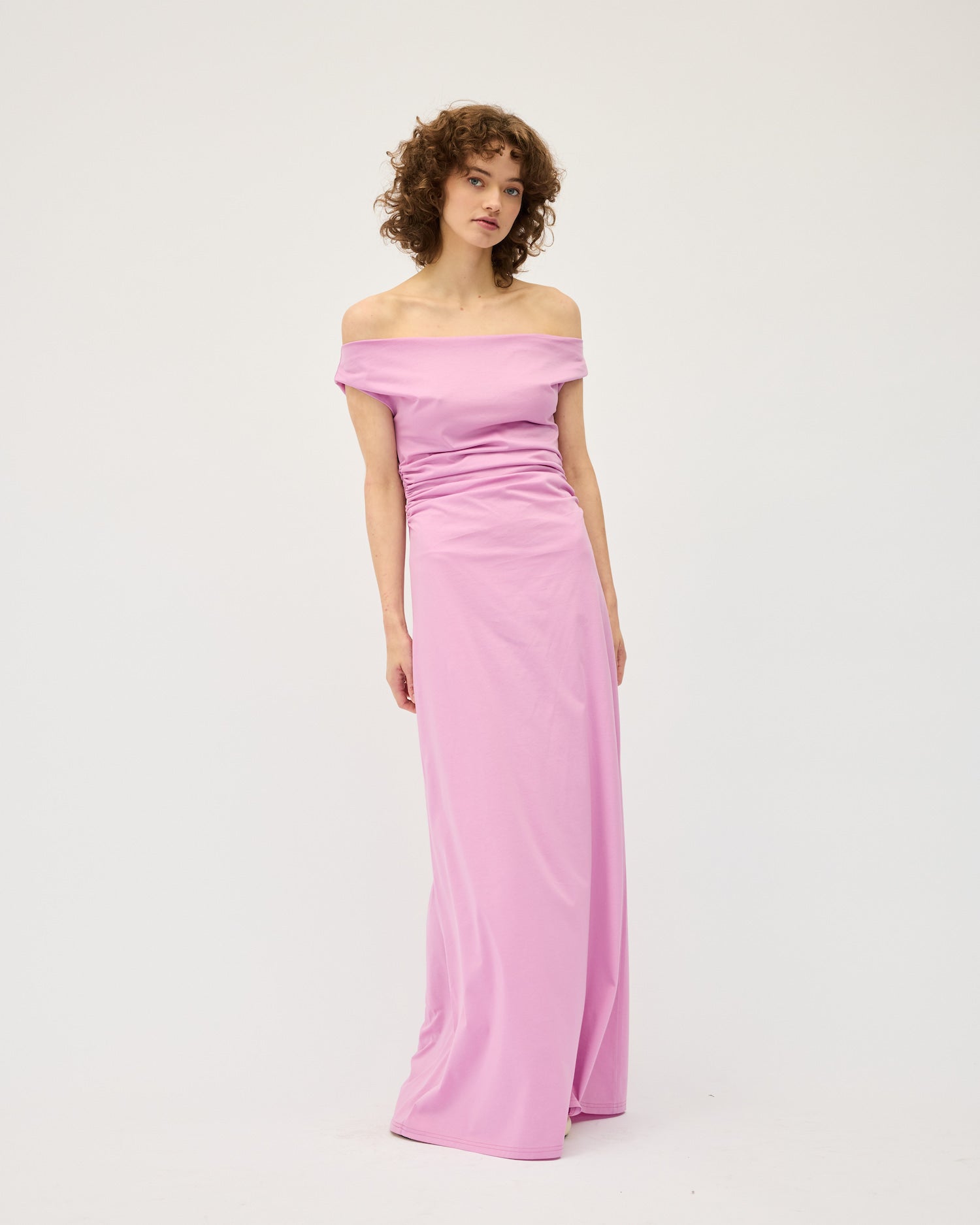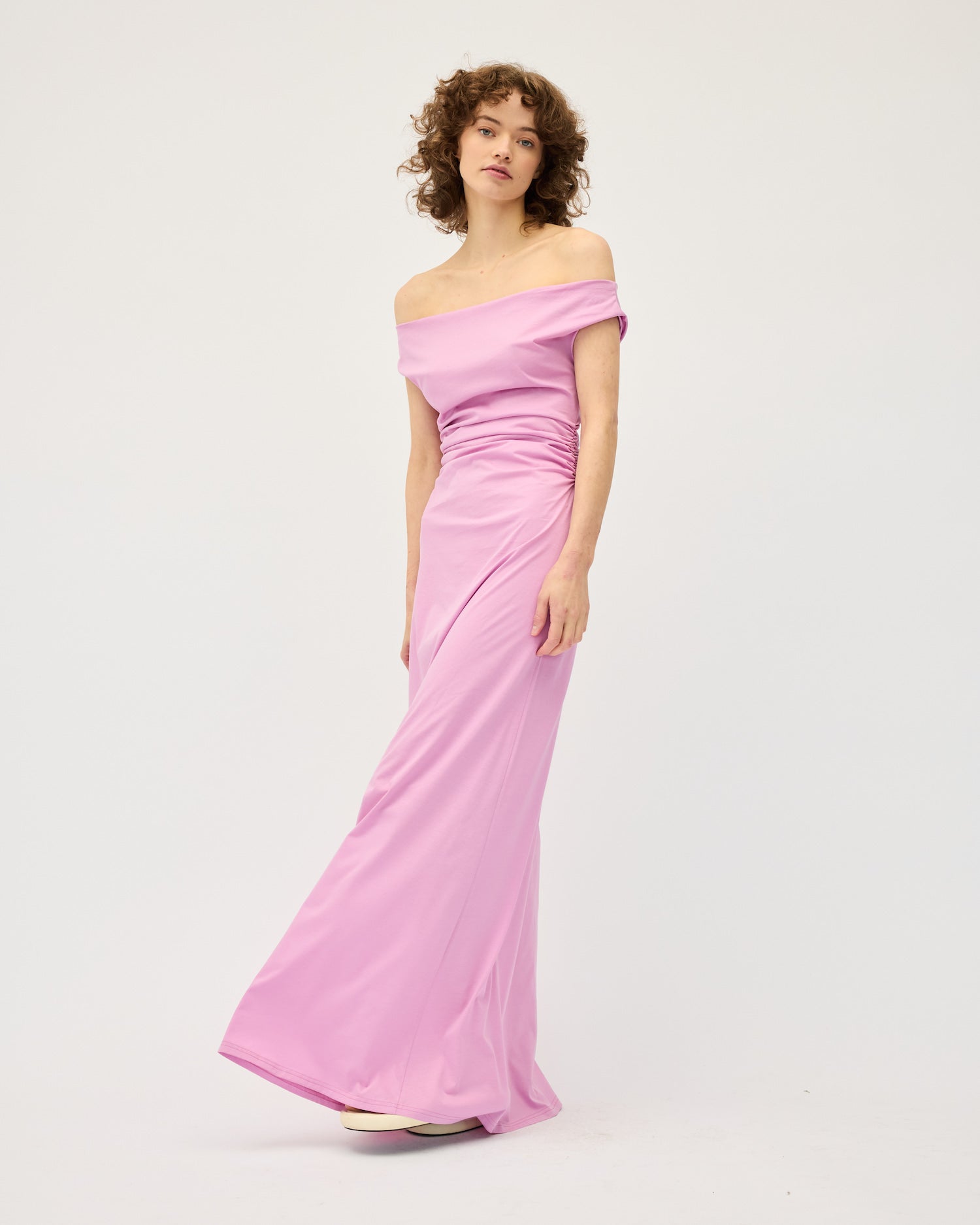Vera to the Floor. A timeless black dress, featuring off the shoulder neckline to show off your décolletage. This dress features elastic at waist to create a gathered effect, the skirt goes into an a-line shape for an overall flattering aesthetic. Length is to the floor. Fabric is a soft pure cotton jersey with a slight sateen finish and has some stretch for extra ease and comfort. Can be worn with sandals for more casual occasions or dressed up with a pair of heels and jewellery.