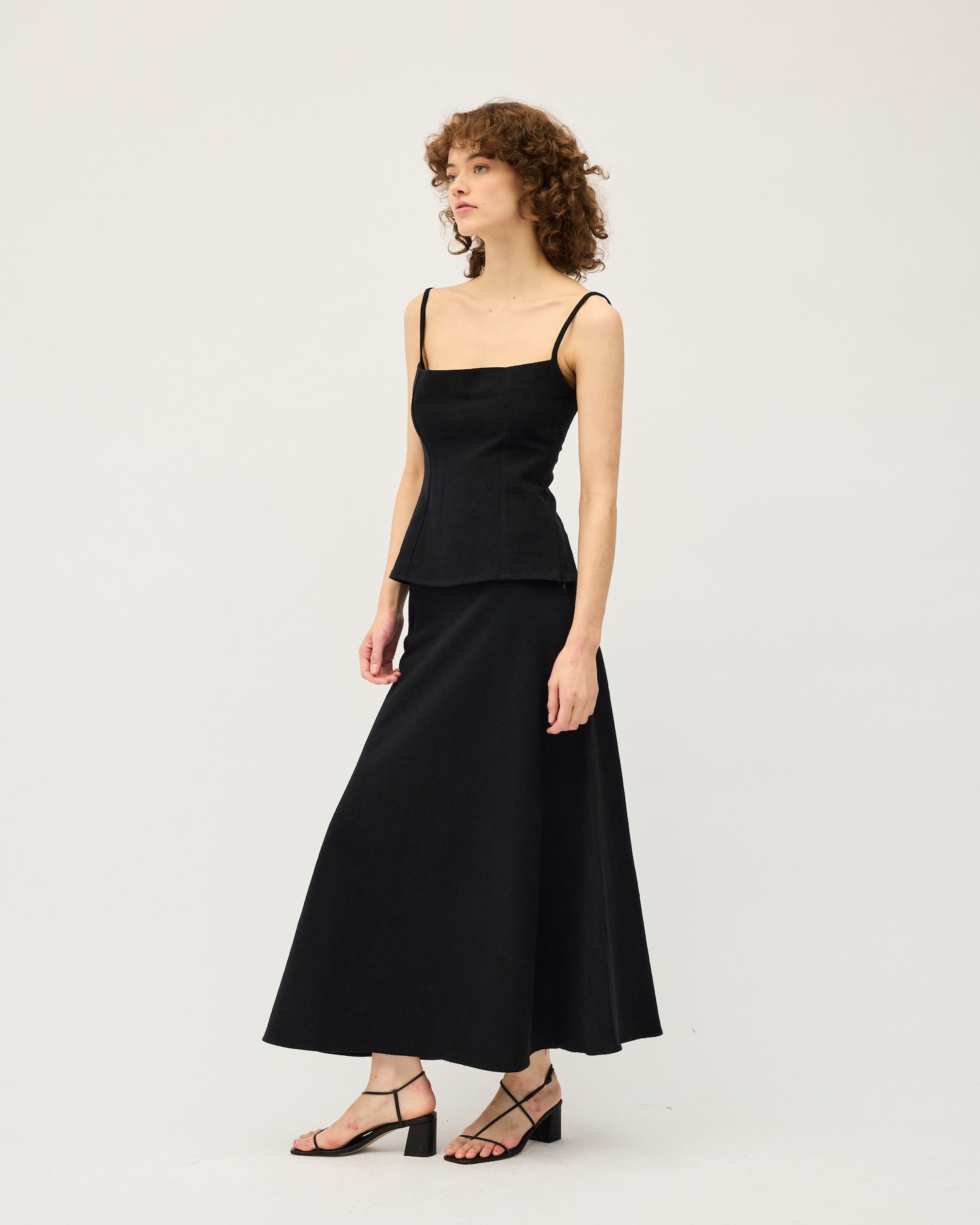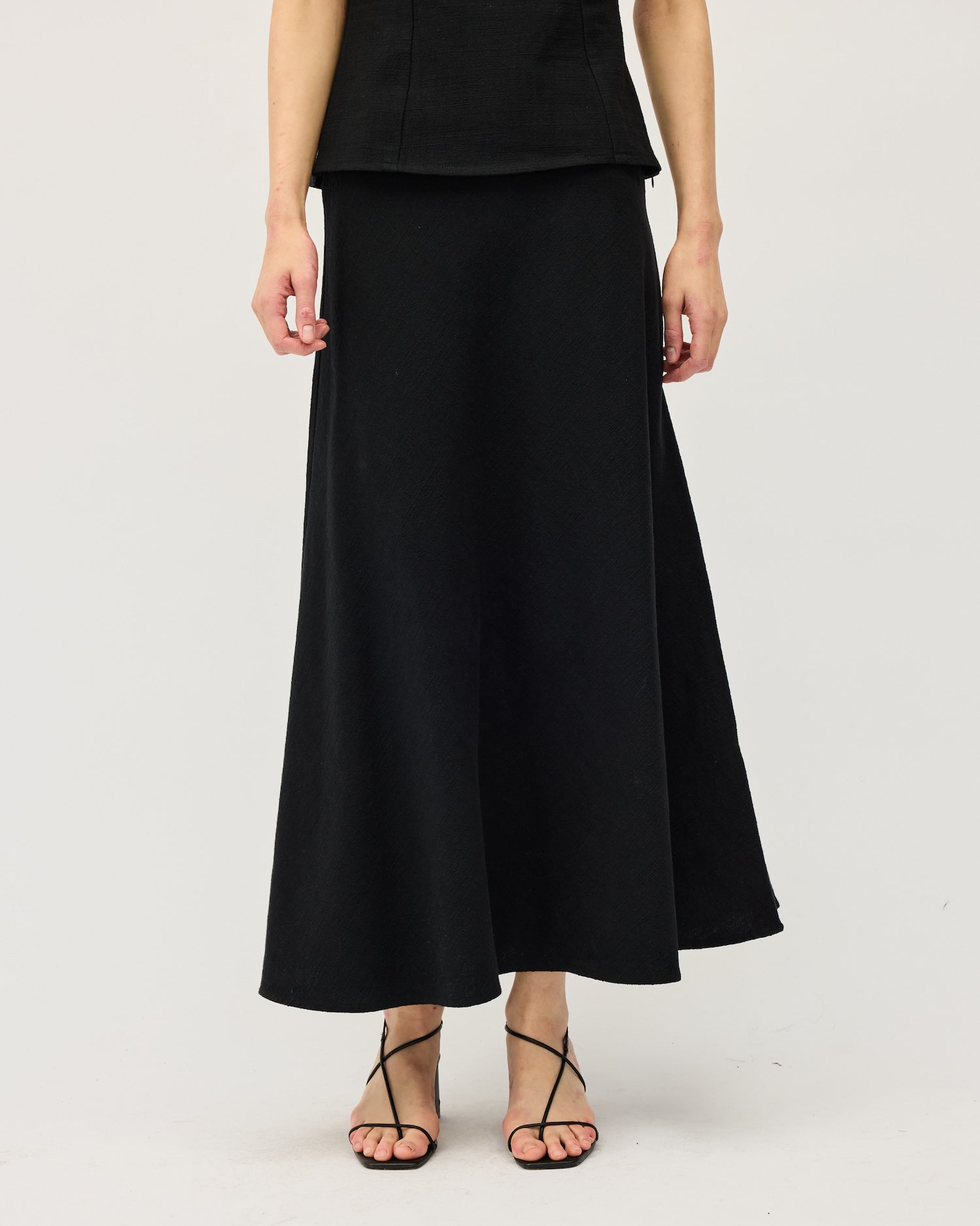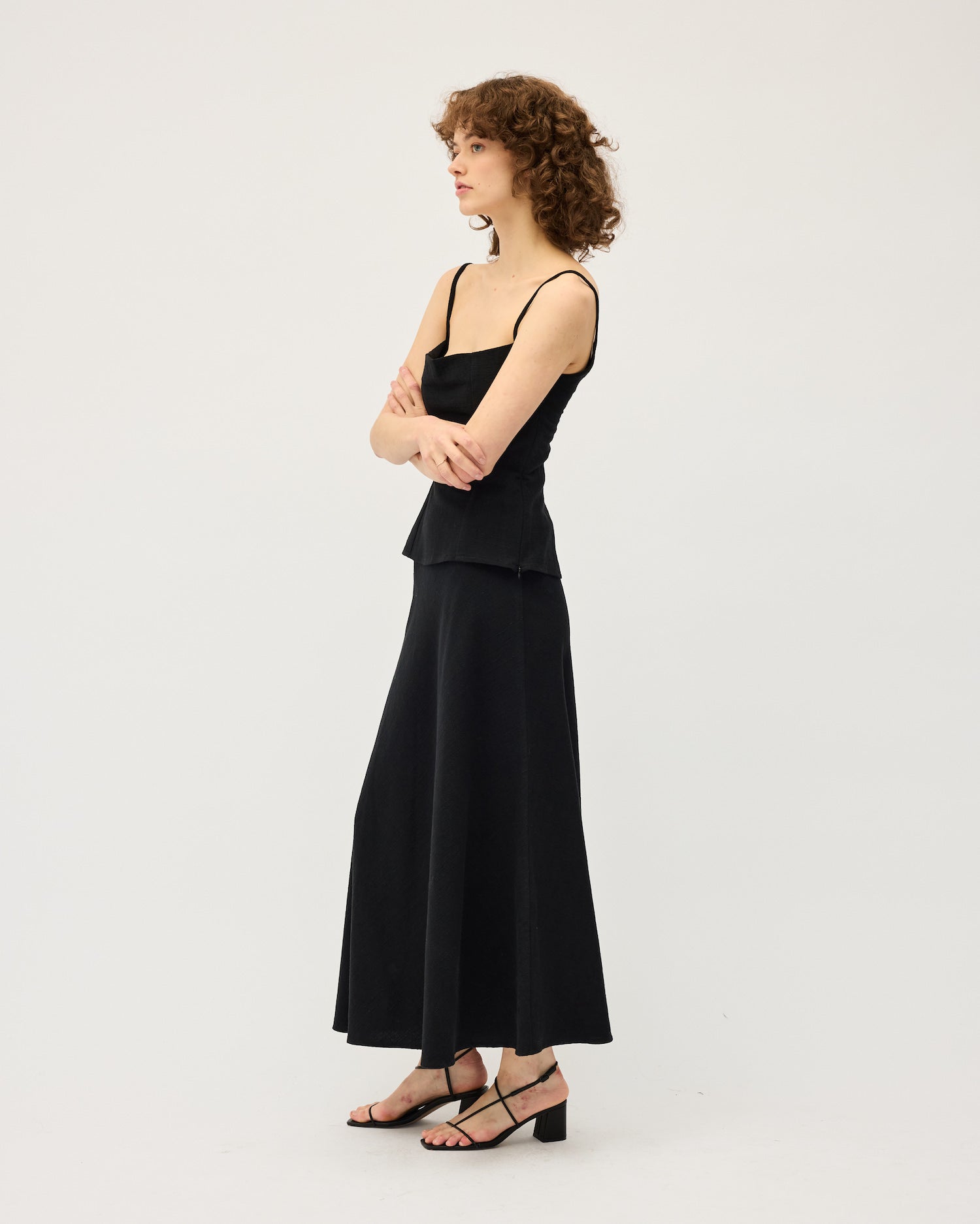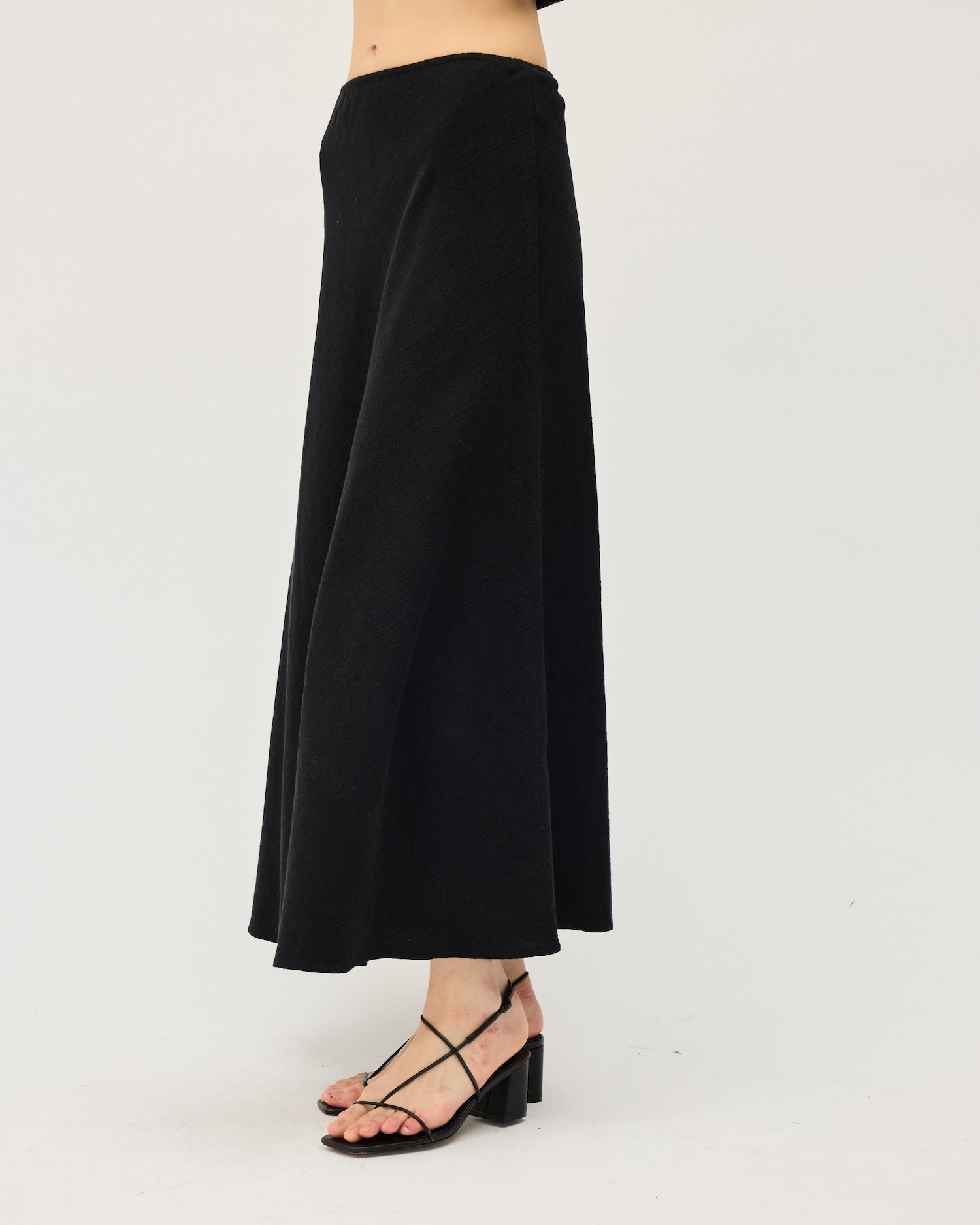 Simple a-line bias cut skirt with an elasticised waist for ease and comfort. Midi length, sitting above the ankles. This fabric is cut on the bias which helps the fabric drape and contour to the shape of the body.