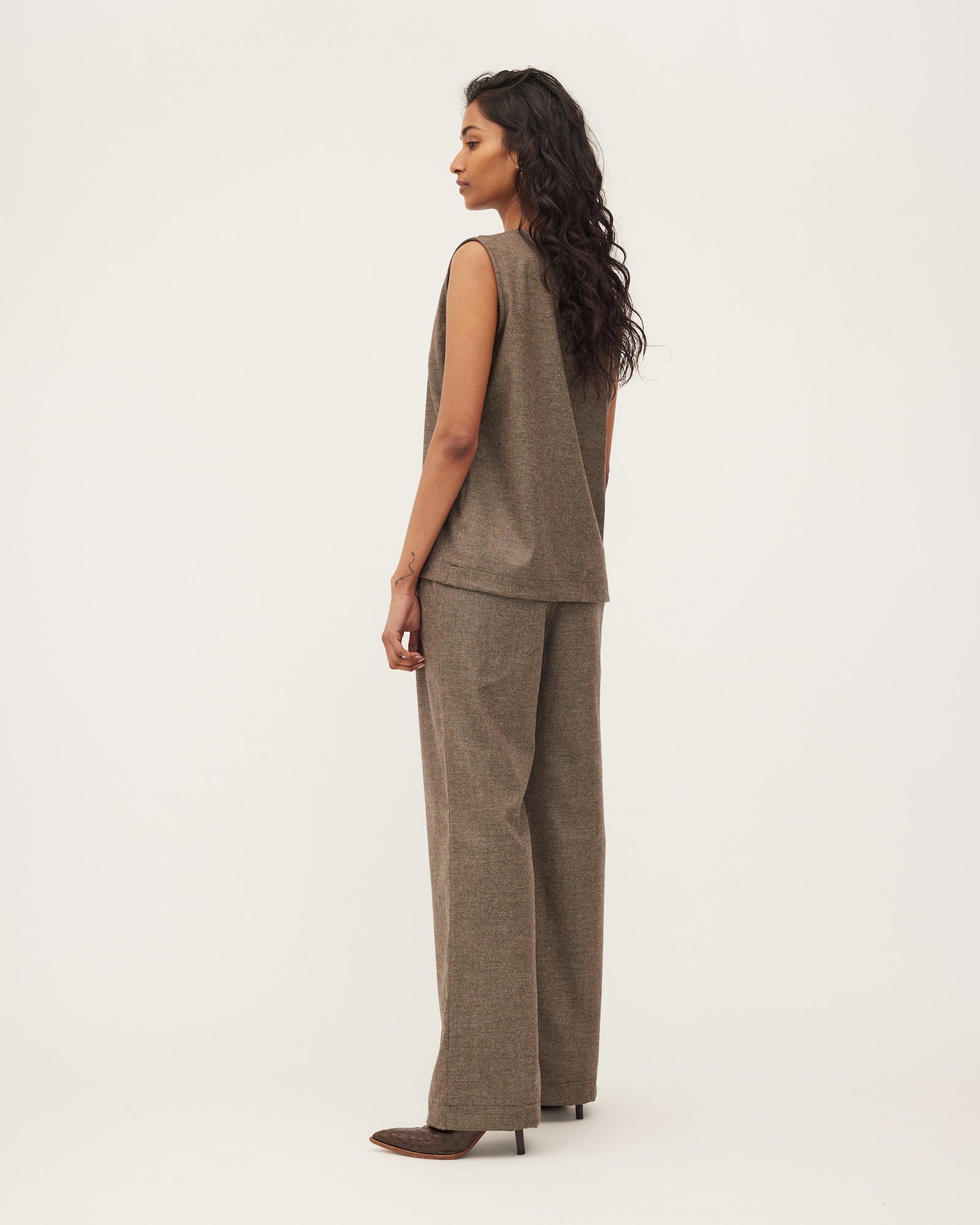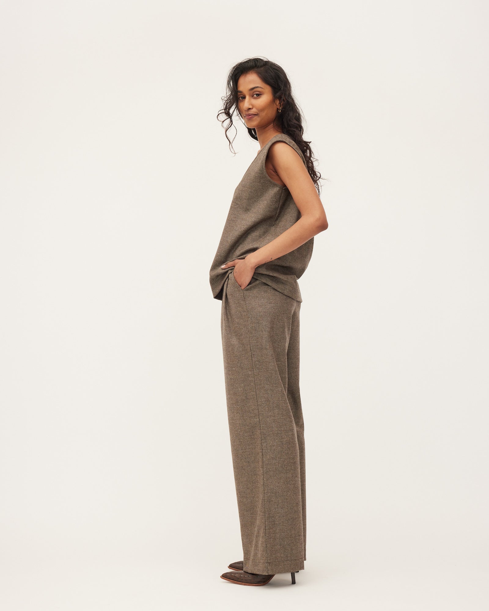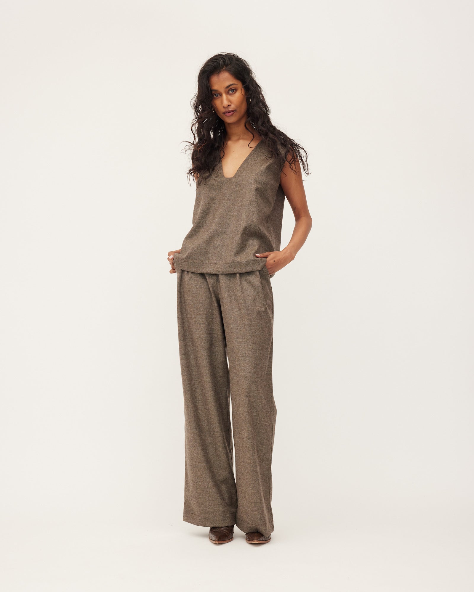 Featuring pleats at the front making these nice and loose through the hip and leg. Also featuring pockets and a fly front with a slide and button closure on the inside for a clean look on the outside. Comfortable and easy, paired here with matching Valerie Vest